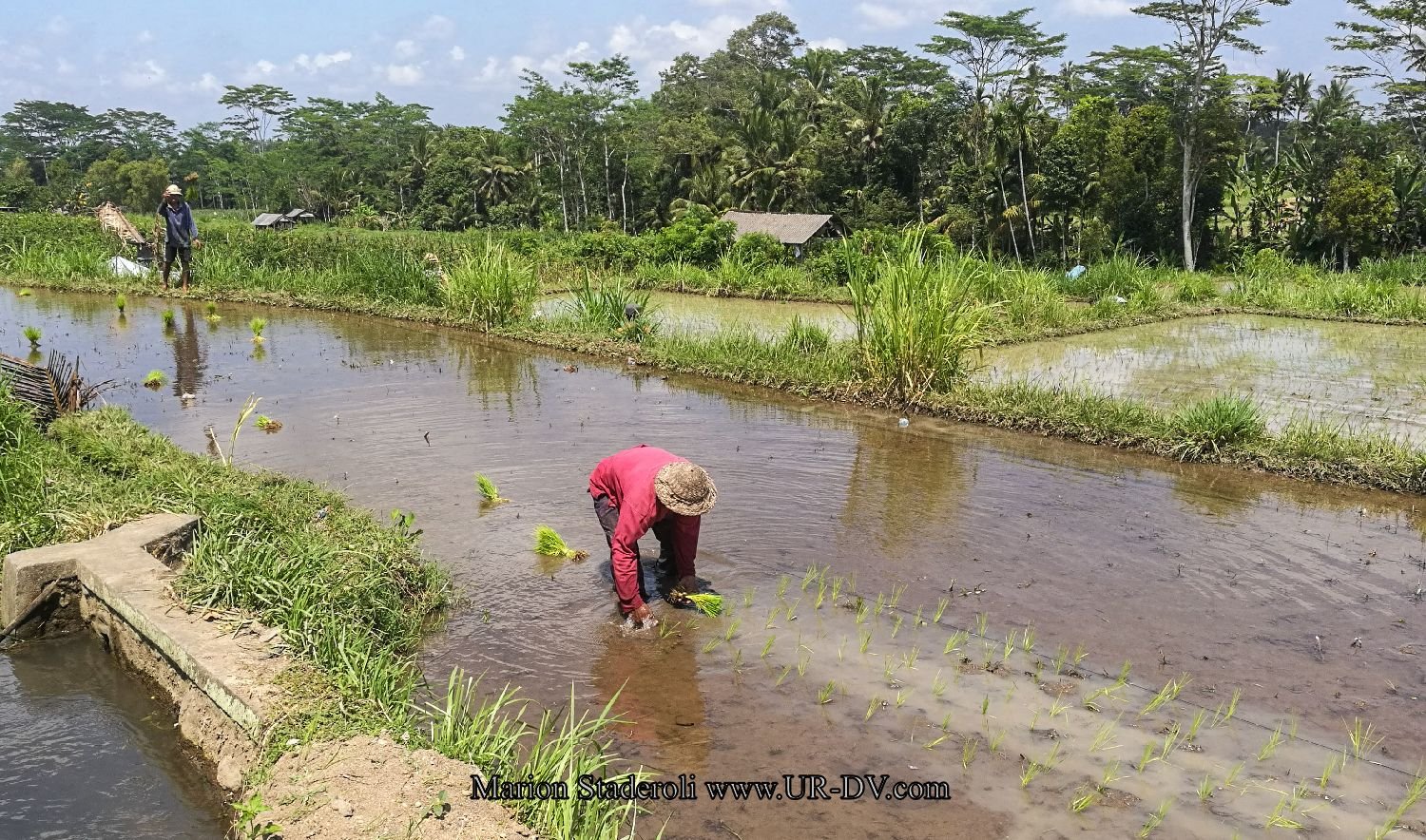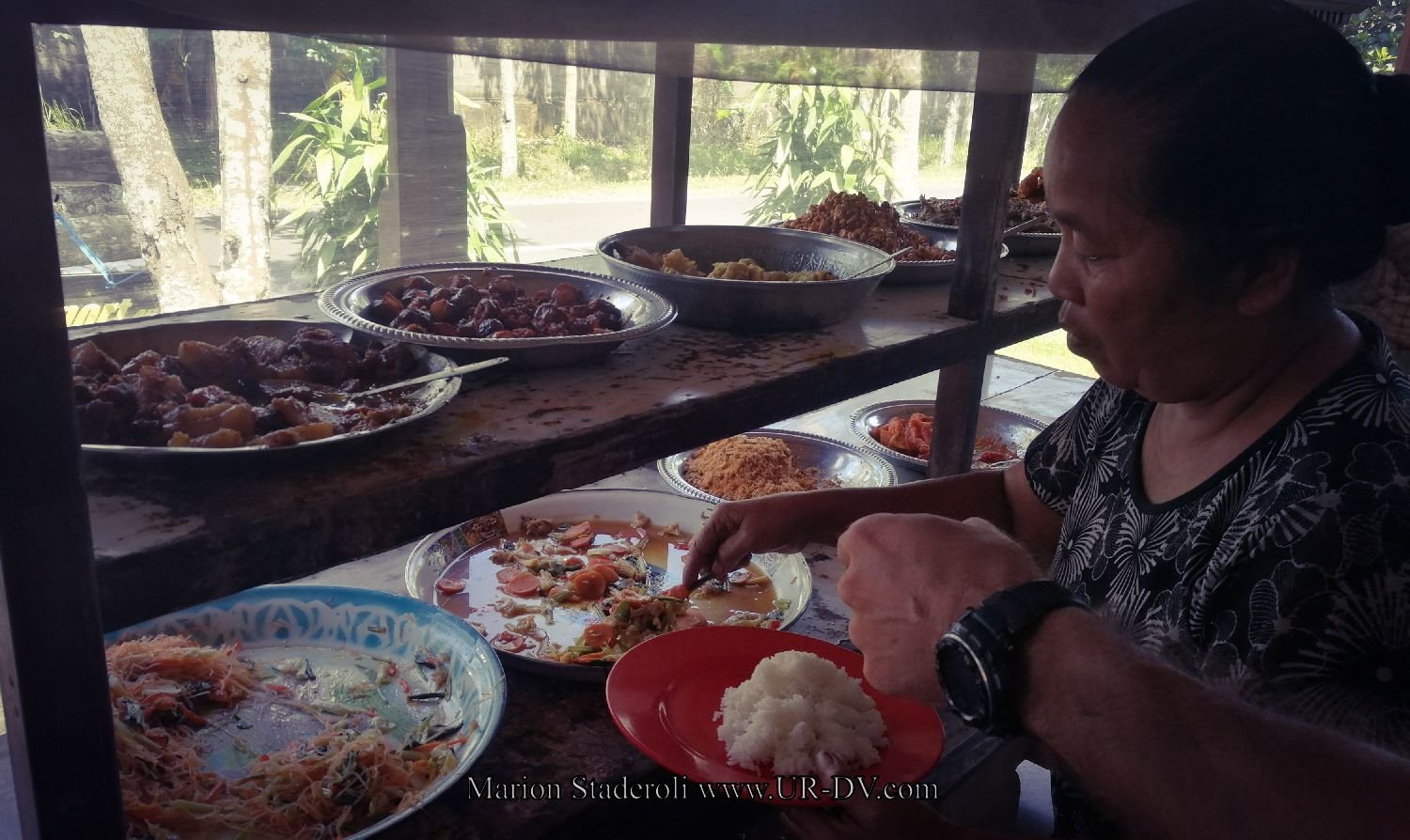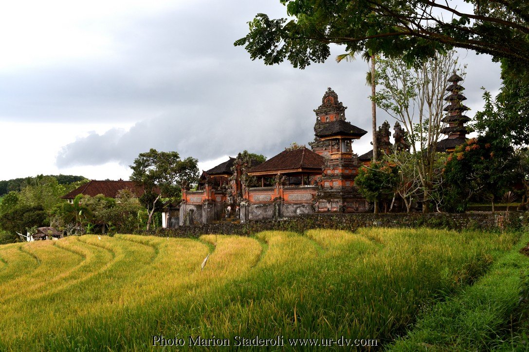 Ce matin nous sommes partis à pieds juste en face « chez nous », superbe paysage de rizières et en chemin plusieurs temples en plein préparatifs de cérémonie de pleine lune. Près de l’un d’eux nous avons été interpelés pour approcher. Tous le monde (beaucoup d’hommes) était au fourneaux et ils étaient ravis que je les photographient. Pour rire ils ont commencé à nous parler en Indonésien, et quand on leur a répondu, éclats de rire, qu’elle surprise!