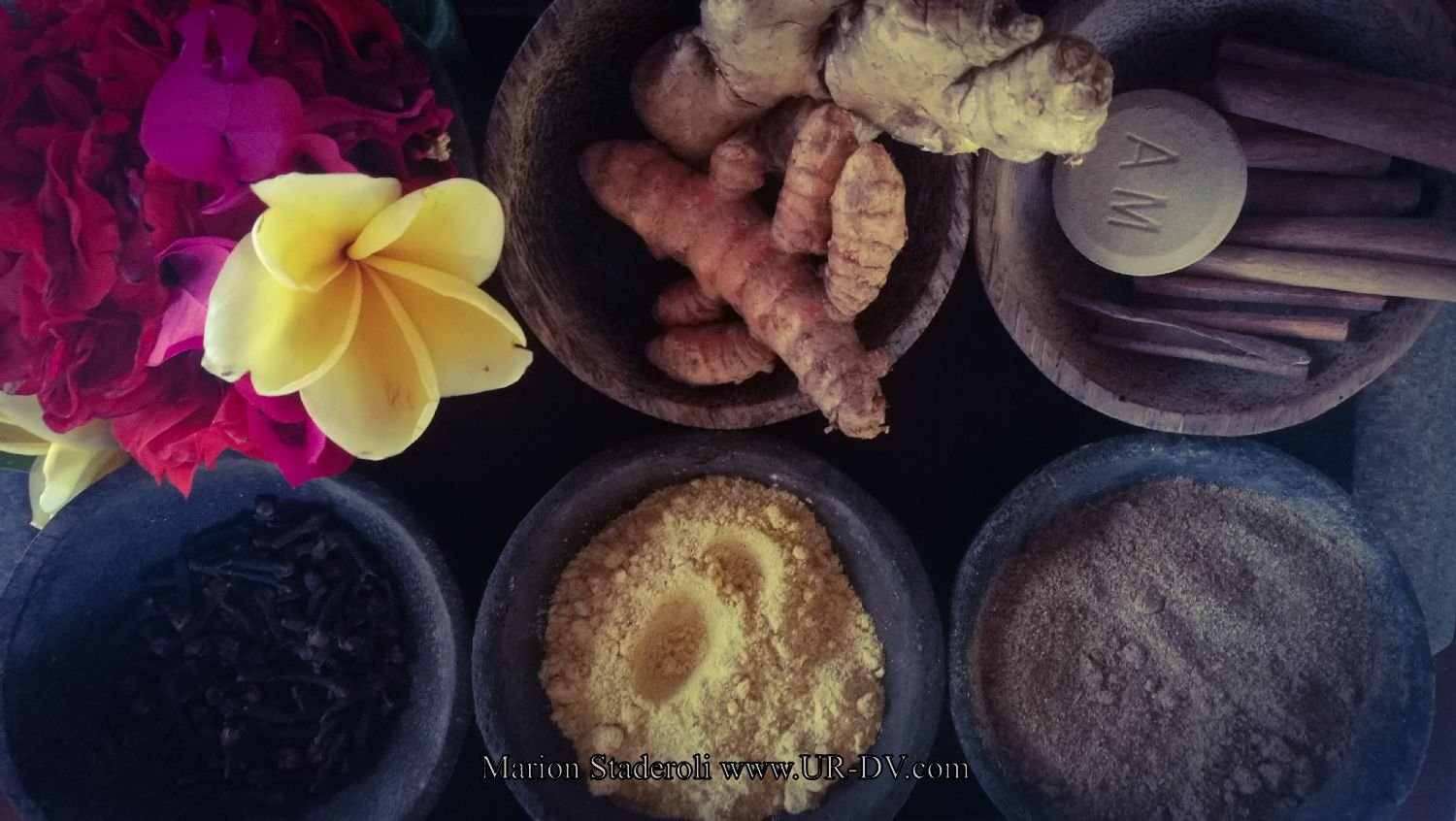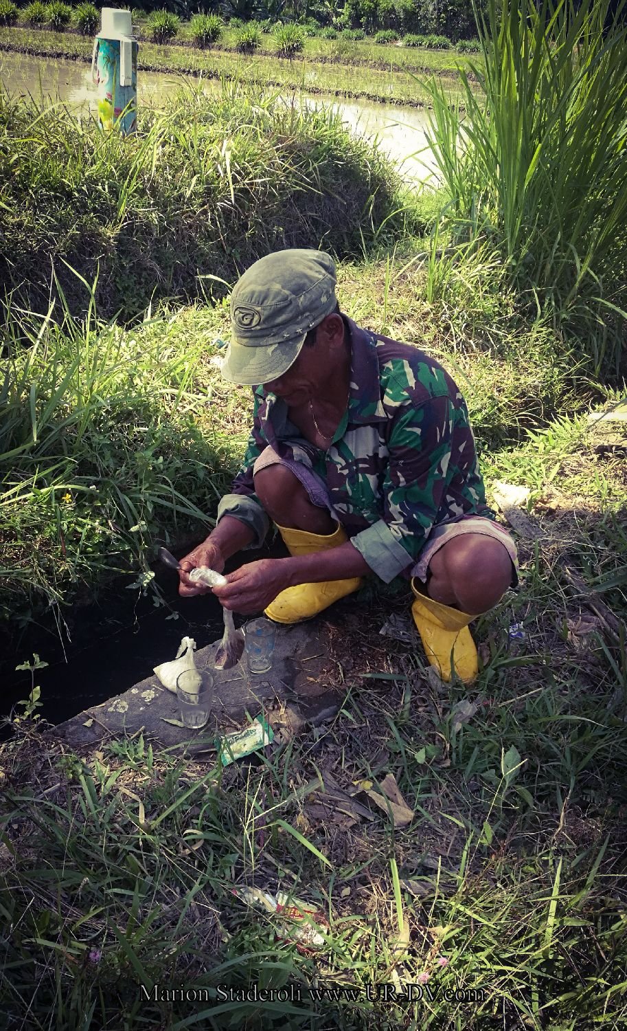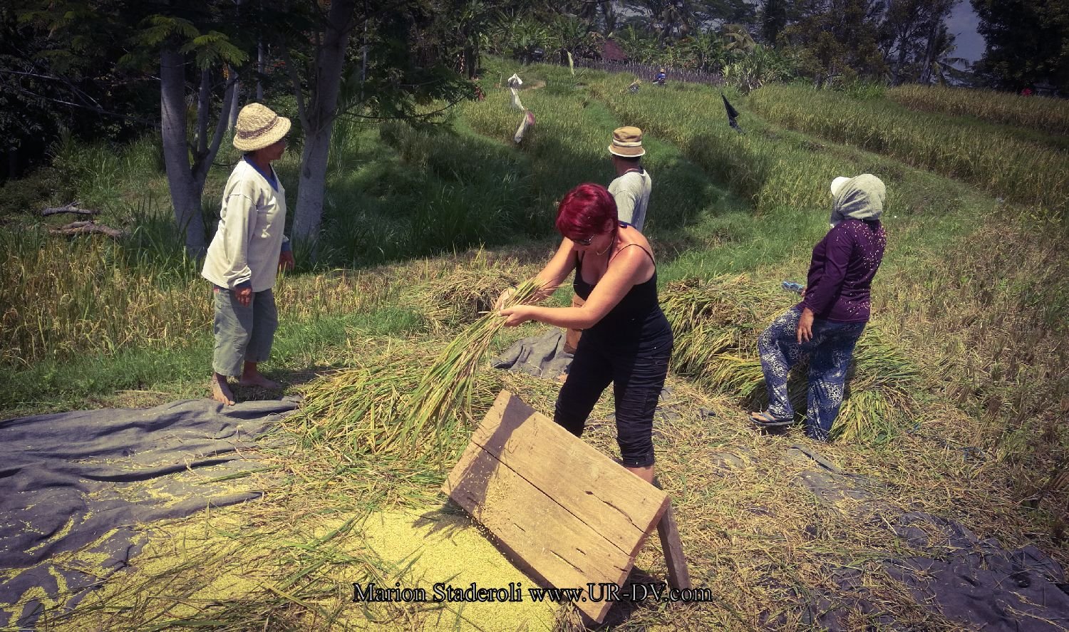 Ce matin nous sommes partis à pieds juste en face « chez nous », superbe paysage de rizières et en chemin plusieurs temples en plein préparatifs de cérémonie de pleine lune. Près de l’un d’eux nous avons été interpelés pour approcher. Tous le monde (beaucoup d’hommes) était au fourneaux et ils étaient ravis que je les photographient. Pour rire ils ont commencé à nous parler en Indonésien, et quand on leur a répondu, éclats de rire, qu’elle surprise!
