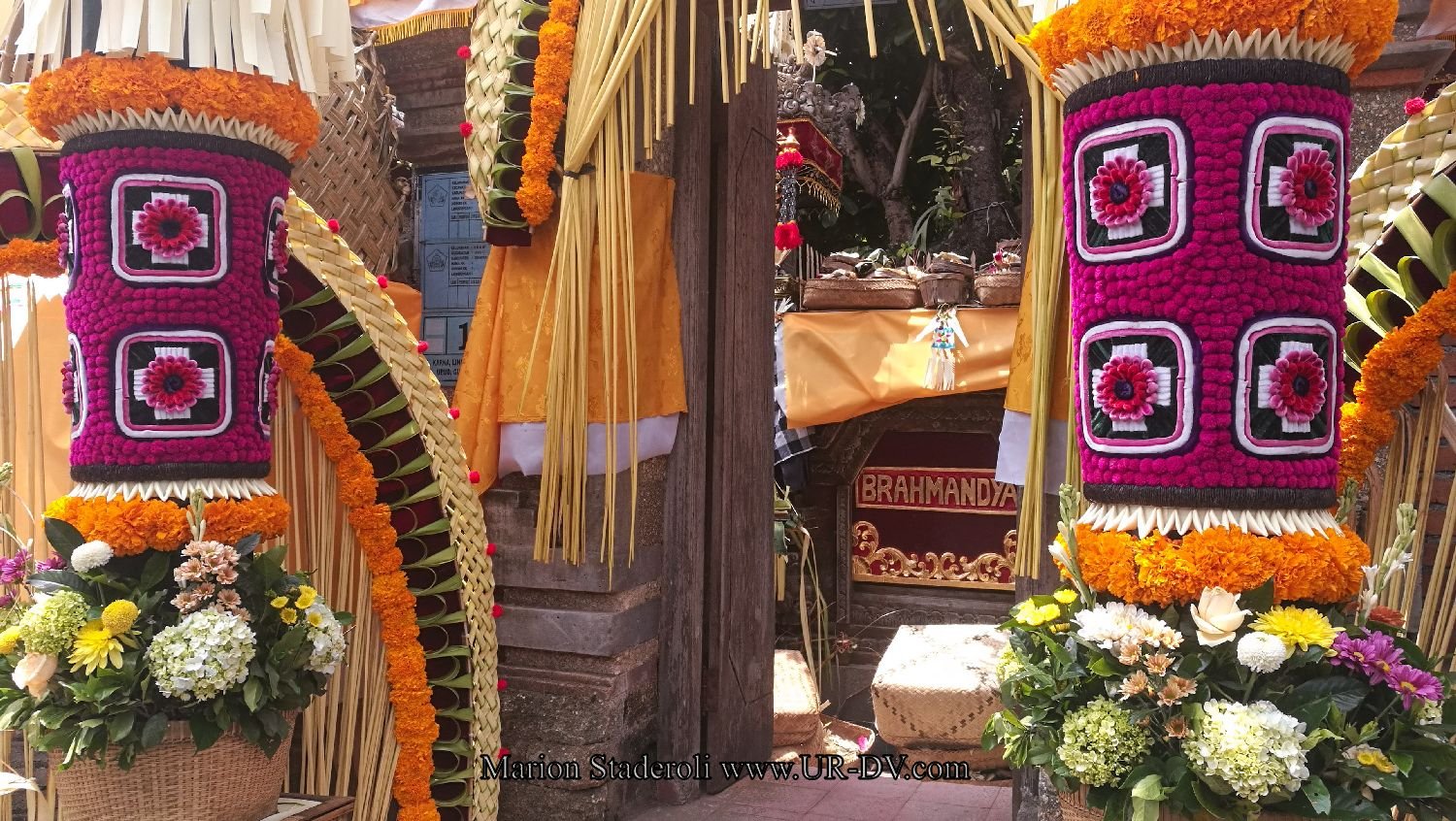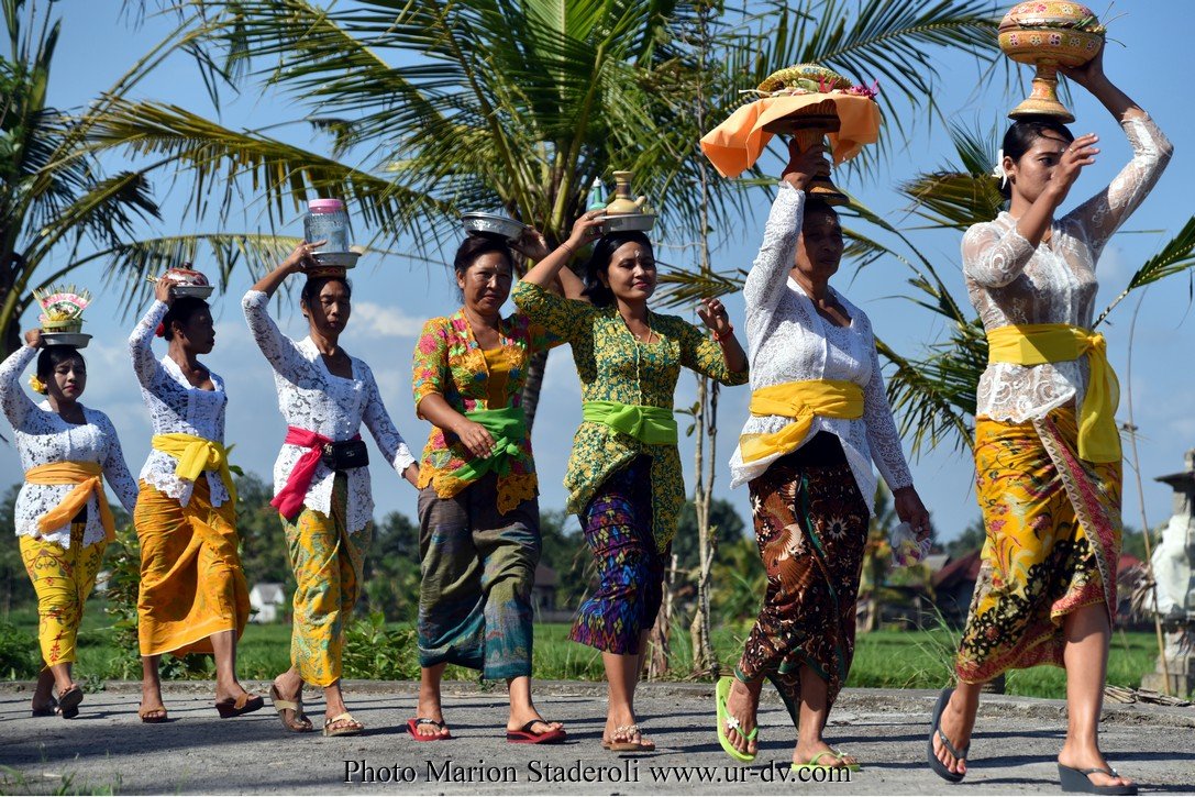 Cet après-midi nous sommes donc allés à la cérémonie où nous étions conviés. Nous avons pu assister au bénédictions accompagnées des offrandes, puis voir la procession en direction des autres temples du villages (il y en a trois à dans chacun les prières et bénédictions sont faites). Des couleurs magnifiques, des sourires à n’en plus finir… et cette spiritualité si propre à Bali