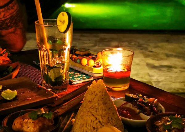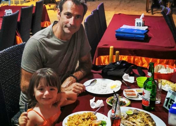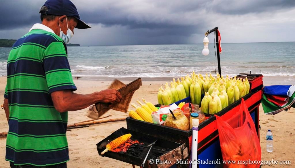 Retour en fin de matinée, le ciel s est bien dégagé, petit bain, ça fait du bien... Puis sieste et massage pour nous pour changer, il faut en profiter 😁. 16h30, il se met à pleuvoir, évidemment ! 🙄 18h Une accalmie, on sort vite sur la plage. Quelques tables sont installées, le vendeur de maïs aussi, on retrouve l esprit du lieu mais sans coucher de soleil, le ciel est noir, alors ça n a pas le même charme... On s’attable quand même 🤞 face à la mer... Mais ca recommence à tomber, tous aux abris, on recule sous la terrasse, vraiment dommage, ça n est vraiment pas pareil ! On déguste tout de même le "packet" traditionnel, poisson, crevettes, coques, riz etc avec les boissons pour 2 personnes très copieux, pour l équivalent de 16€ 😋. C est notre rituel de fin de voyage, différemment mais c'est fait ❤️