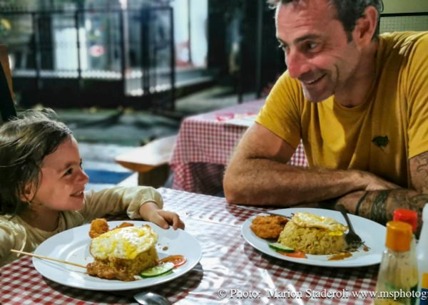 Nous nous sommes régalés d une noix de coco 🥥 fraîche, puis de "nasi" et "mie goreng" 🍜pour le repas 😋 en admirant les nombreux surfers.