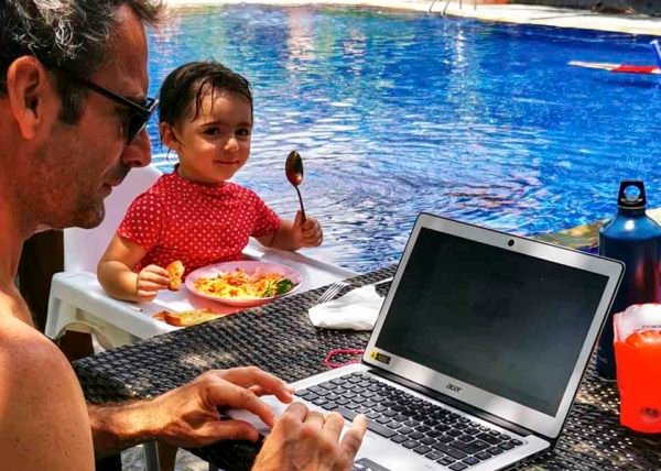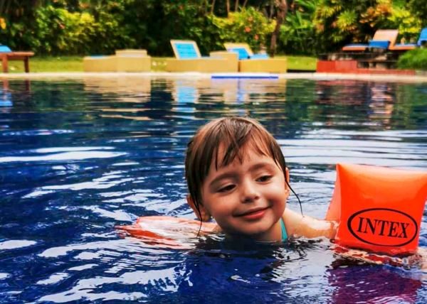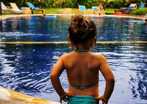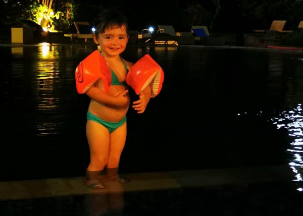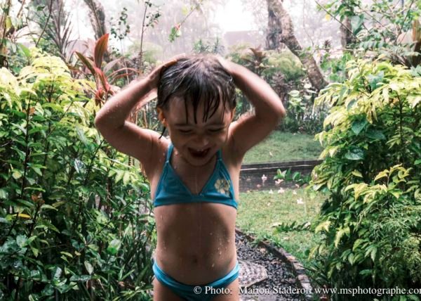 Un bain puis repas au warung derrière l hôtel, sieste (Lou etait KO, et maman qui ne voulait absolument pas dormir est tombée comme droguée 🤣). Puis piscine, un classique mais agrémenté d une belle grosse averse 🌧️ avec Lou qui prend sa douche façon "Tahiti douche", alors tout de suite c est beaucoup plus rigolo 😁🚿