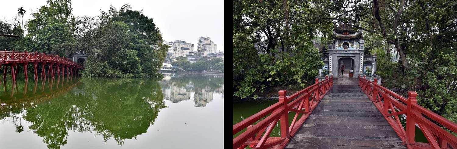 Nous n’avons pas trop visité de monument ce n’est pas vraiment notre truc. Nous sommes tout de même allés voir la pagode du lac Hoan Kiem et son pont rouge (ou « lac de l’épée restituée » d’après la légende). Les bords du lac sont agréables et on peut aller sur le pont sans payer. Par contre pour aller jusqu’à la pagode c’est 30 000 (un peu plus 1€). On y est allés et bon… rien d’exceptionnel, on y voit la tortue géante (de la légende également) .