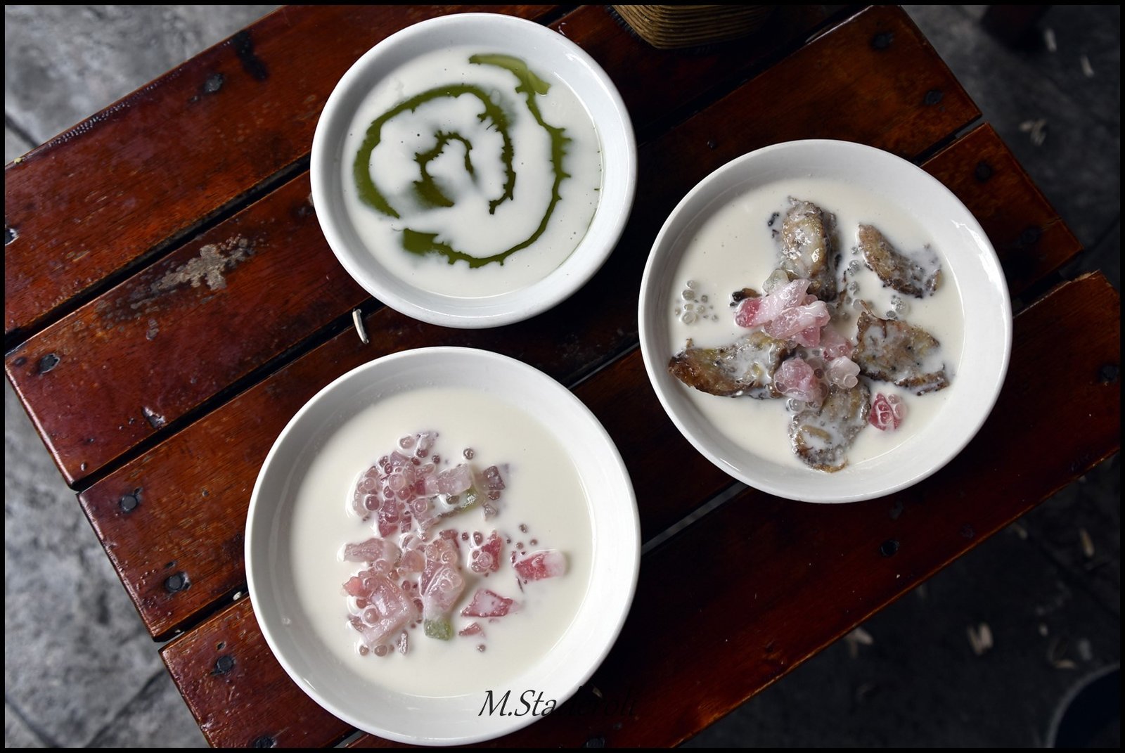 Ensuite on avait lu sur le net qu’il y avait une association qui proposait des massages fait par des aveugles (c’est le cas aussi à Ho Chi Minh). Nous avons cherché l’adresse (heureusement qu’on avait la moto et le GPS!) et nous sommes arrivés devant une sorte de bureau avec quatre hommes devant des ordinateurs… Bizarre… Peut-être est ce le bureau de l’asso? Je dit « massage » et là ils me regardent avec des yeux ronds et font signe que non! Quelle rigolade! Bon du coup on est partis, tant pis pour les massages ça ne doit plus exister (il y a plein de salons dans le centre mais ça ne nous inspire pas). On a fait un tour vers deux lacs, mais rien d’intéressant. Donc on a décidé de retourner dans le vieux quartier. Et là dès qu’on se gare… pluie…pluie et pluie… Ca s’arrêtait, on sortait et ça recommençait! Donc on a fini par rentrer tôt en milieu d’aprem pour le prendre cool, faire les bagages etc. Le seul petit truc de la journée aura été de gouter des « desserts de rue ». Pas franchement mauvais mais…étrange!