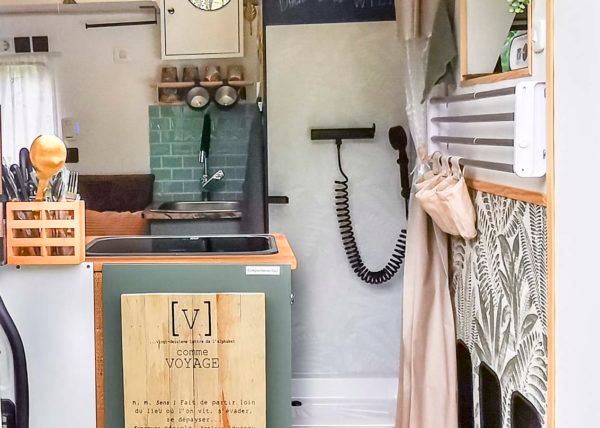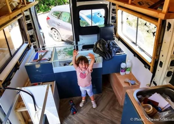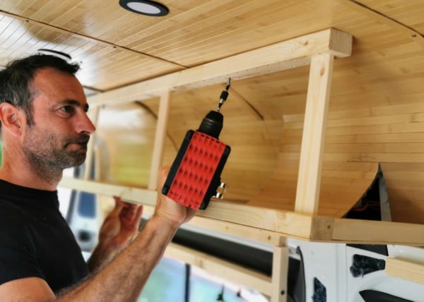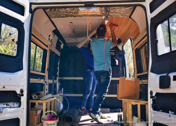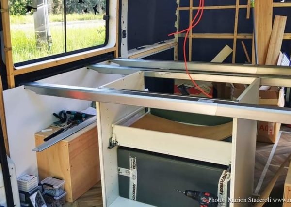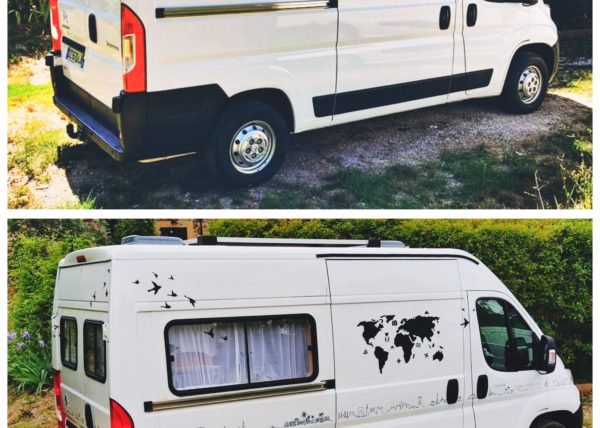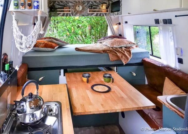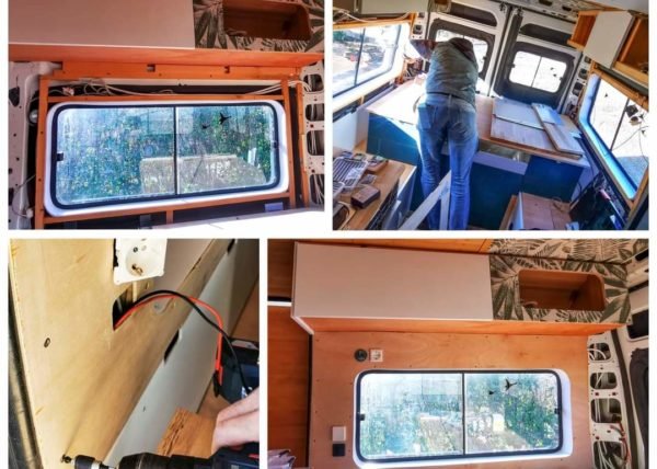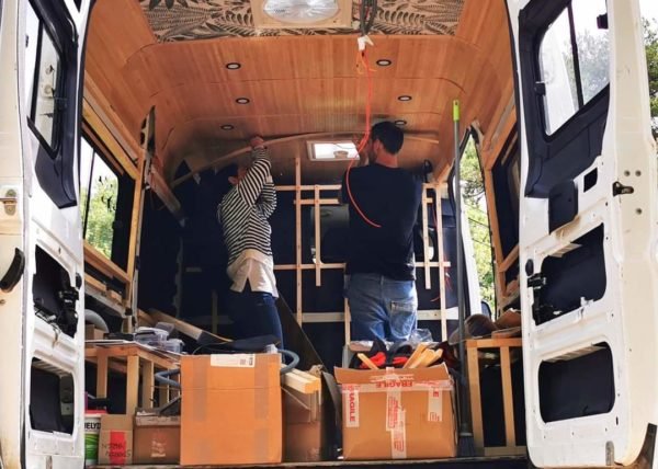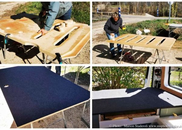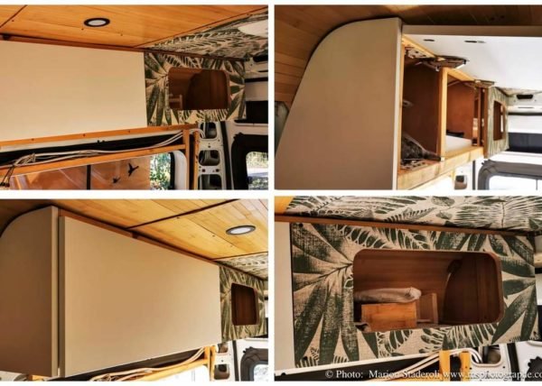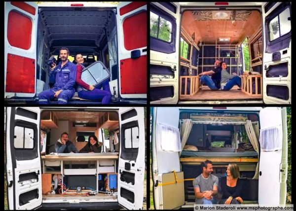 Nous avons tout imaginé et réalisé, sauf une partie de l’électricité (pose batterie, convertisseur et gros câblage) et la pose du chauffage diesel pour lesquelles nous avons fait appel à un pro par manque de temps et peur de faire des erreurs potentiellement graves (et... nous avons eu de gros problèmes de normes non respectées pour le chauffage