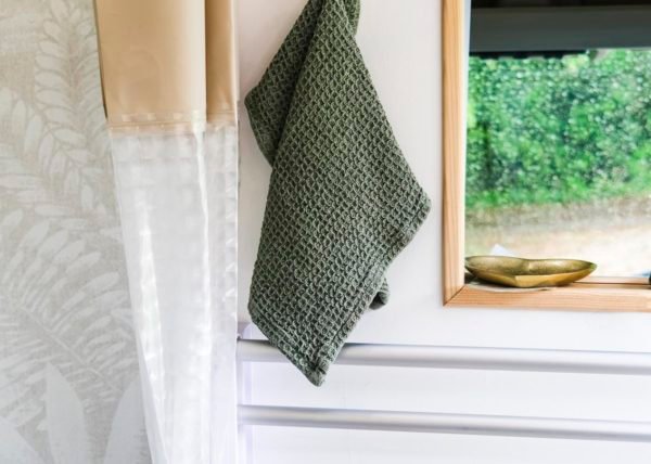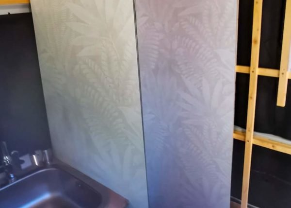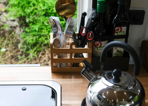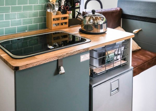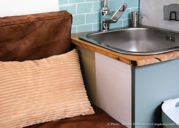 petite cuisine avec evier mitigeur, frigo (à compressions Webasto 42L) et plaque double gaz (Dometic),