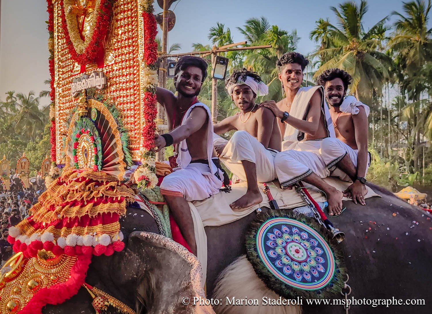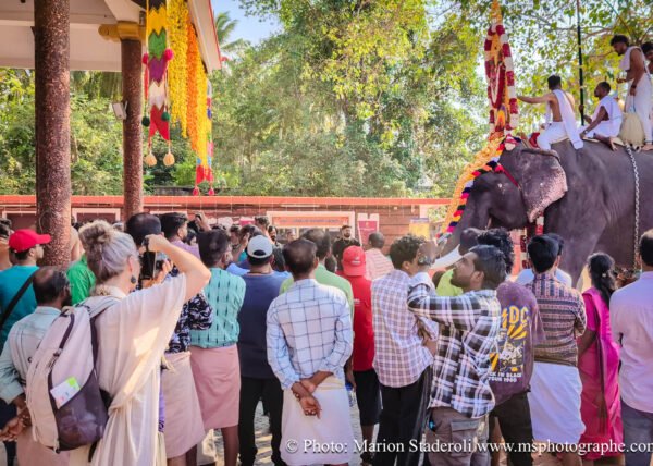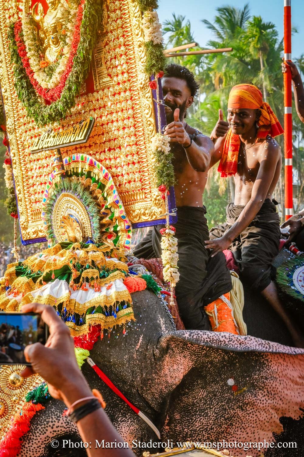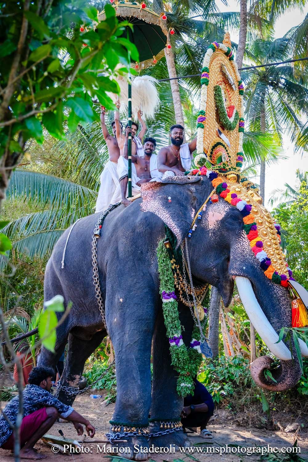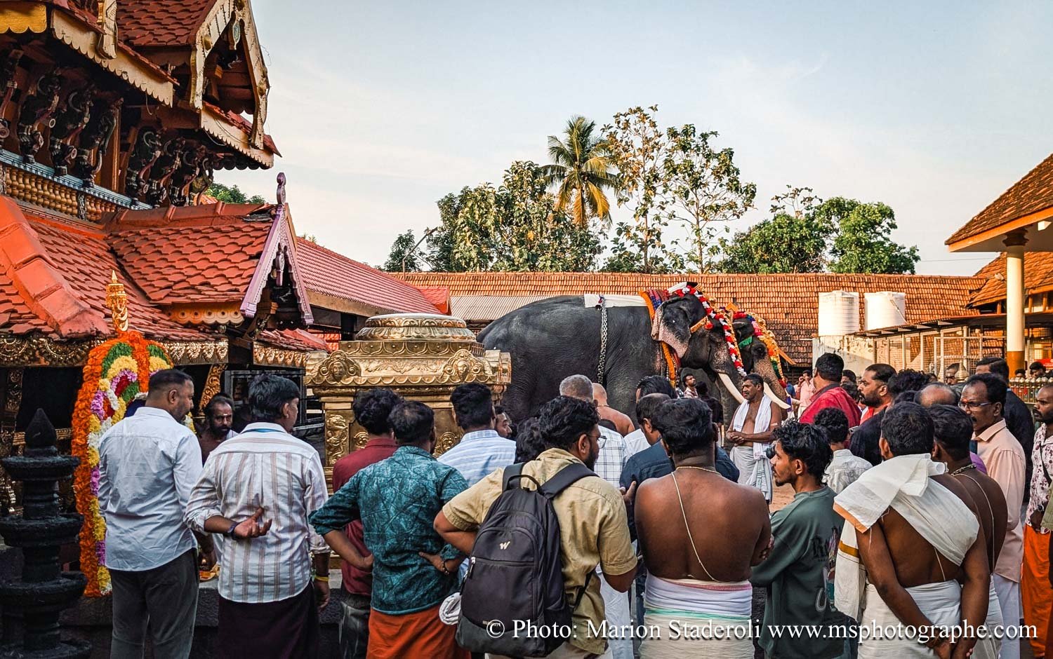 C'est quelque chose de particulier de les voir ainsi, car cela nous procure un mélange d'admiration devant leur beauté et de peine mêlés. Si ce type d'événement était produit pour les touristes, évidement nous n'irions pas, mais là, il s'agit de traditions. Les mentalités évoluent doucement (nous avons pu voir des éléphants "mécaniques") mais malheureusement les croyances sont très ancrées. Il faut savoir que lors de festival, les pachydermes ne sont plus des animaux mais incarnés par de véritables divinités pour les indiens. D'où ce faste et les scènes de liesse autour d'eux... Le fait qu'on soit présents ou non, ne change ainsi absolument rien (nous étions les seuls étrangers je pense).