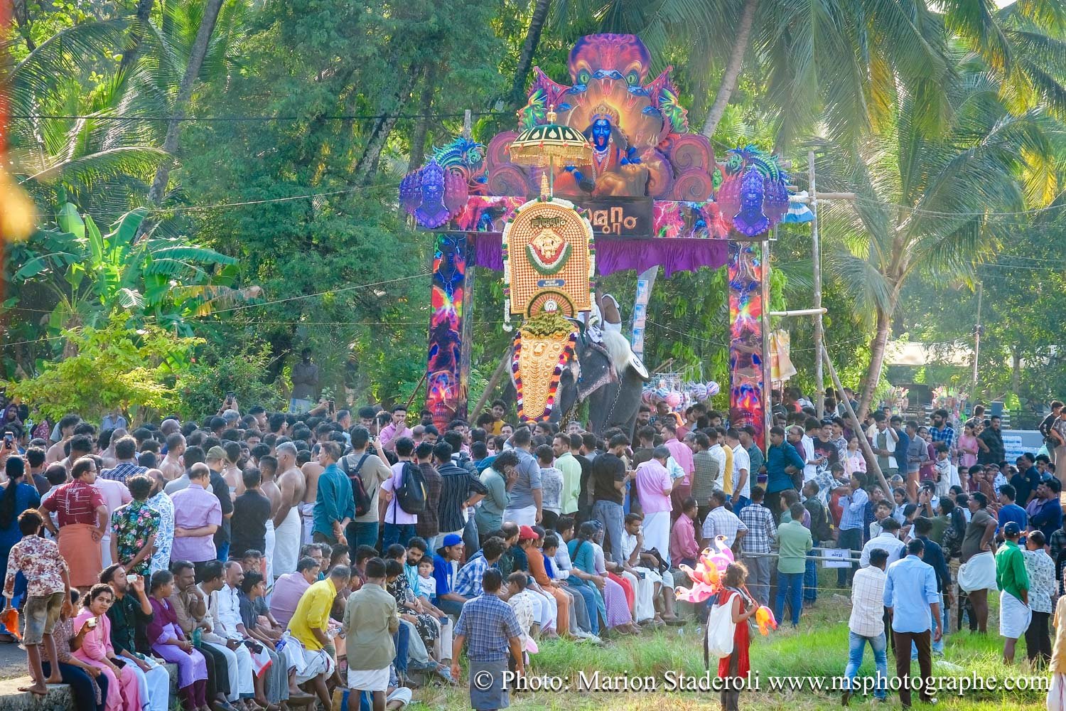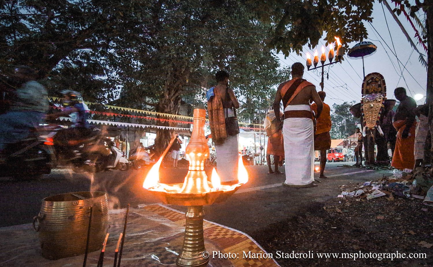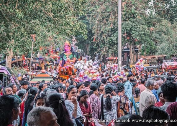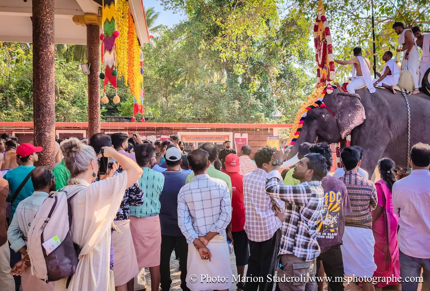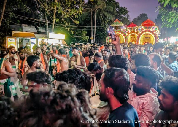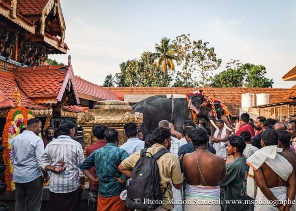 C'est quelque chose de particulier de les voir ainsi, car cela nous procure un mélange d'admiration devant leur beauté et de peine mêlés. Si ce type d'événement était produit pour les touristes, évidement nous n'irions pas, mais là, il s'agit de traditions. Les mentalités évoluent doucement (nous avons pu voir des éléphants "mécaniques") mais malheureusement les croyances sont très ancrées. Il faut savoir que lors de festival, les pachydermes ne sont plus des animaux mais incarnés par de véritables divinités pour les indiens. D'où ce faste et les scènes de liesse autour d'eux... Le fait qu'on soit présents ou non, ne change ainsi absolument rien (nous étions les seuls étrangers je pense).