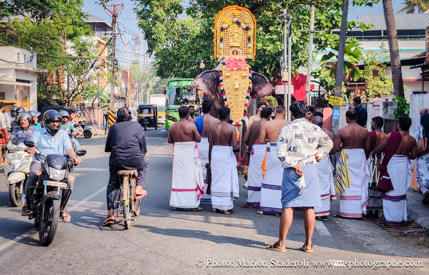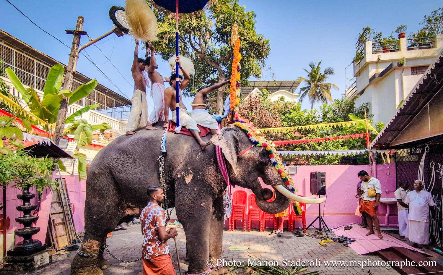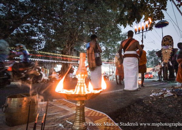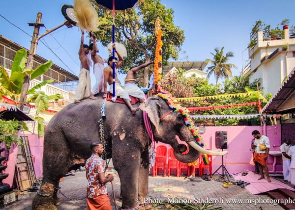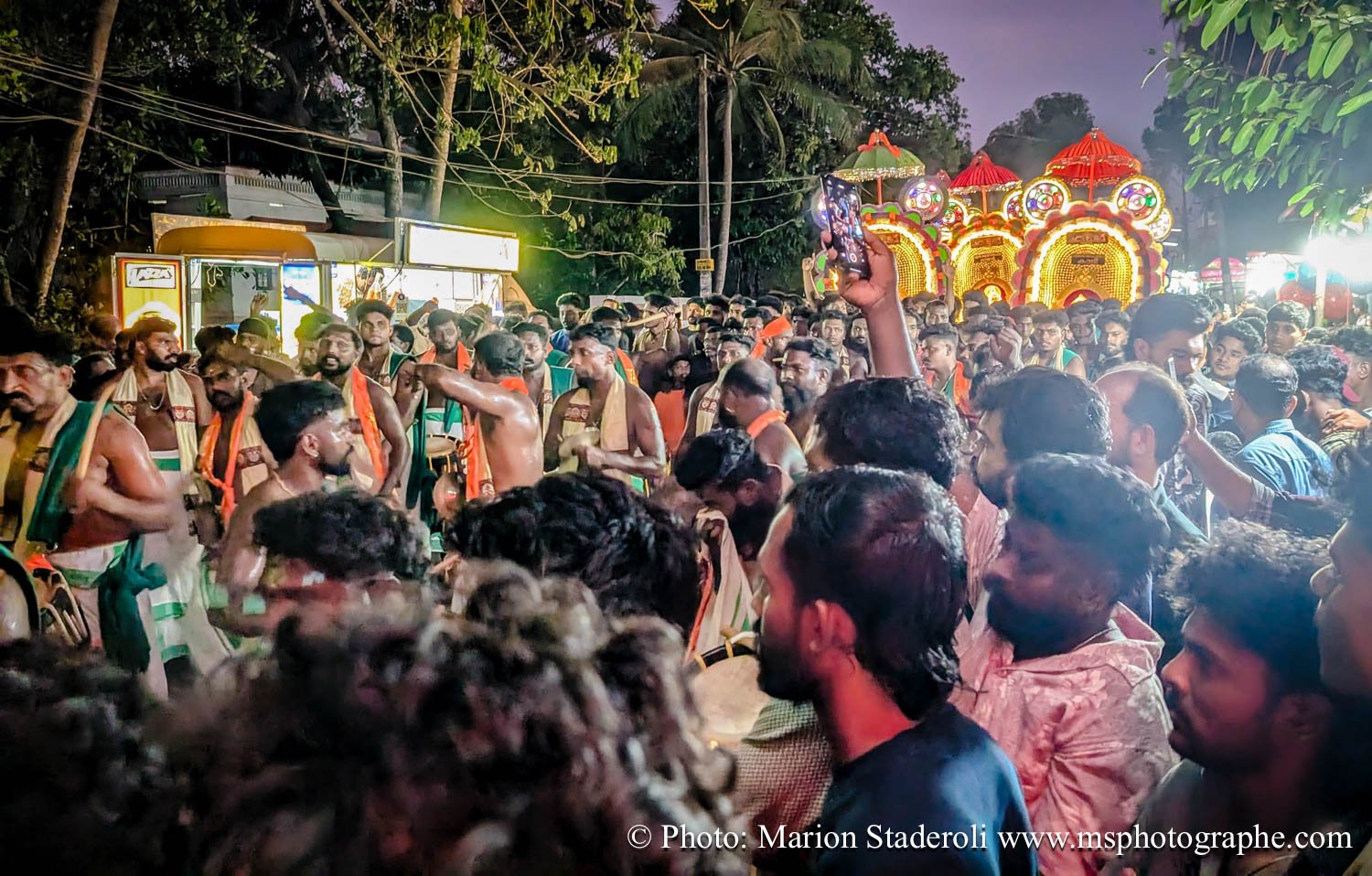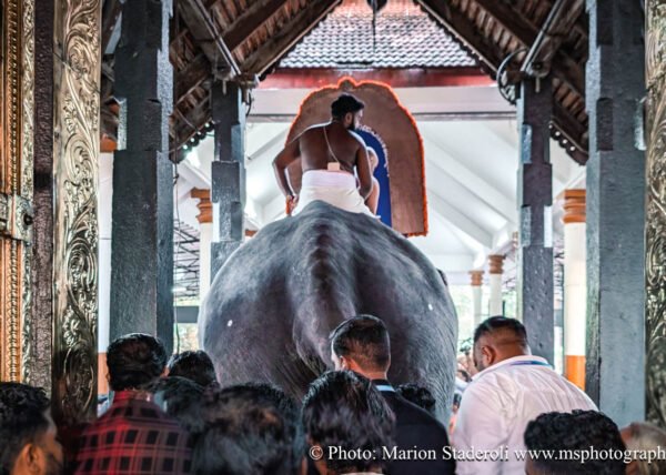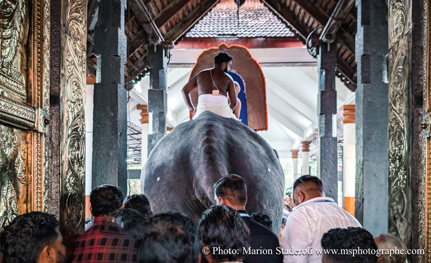 C'est quelque chose de particulier de les voir ainsi, car cela nous procure un mélange d'admiration devant leur beauté et de peine mêlés. Si ce type d'événement était produit pour les touristes, évidement nous n'irions pas, mais là, il s'agit de traditions. Les mentalités évoluent doucement (nous avons pu voir des éléphants "mécaniques") mais malheureusement les croyances sont très ancrées. Il faut savoir que lors de festival, les pachydermes ne sont plus des animaux mais incarnés par de véritables divinités pour les indiens. D'où ce faste et les scènes de liesse autour d'eux... Le fait qu'on soit présents ou non, ne change ainsi absolument rien (nous étions les seuls étrangers je pense).