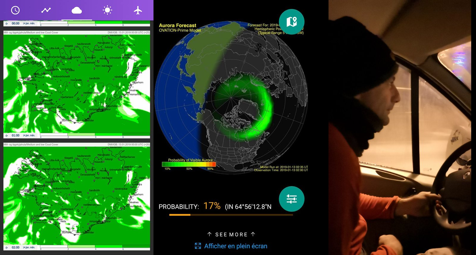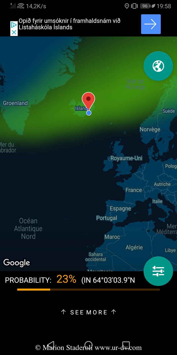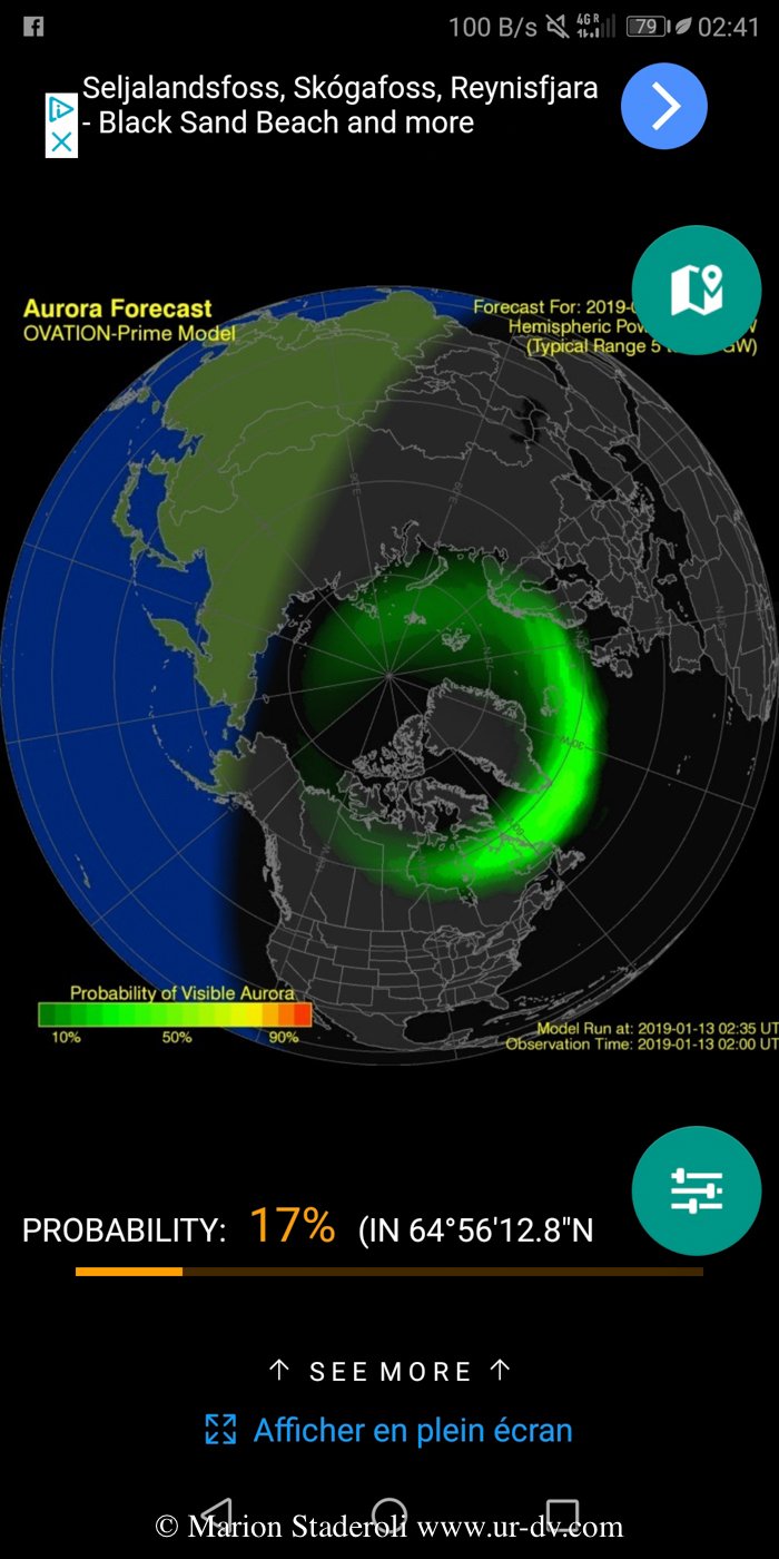Tout ça pour dire qu’il est possible de voir des aurores même quand les conditions ne sont pas idéales, et encore plus de les photographier. En fait, en suivant l’application « Northern eye » j’ai pu voir que toutes les nuits le nuage vert passe au-dessus du pays même s’il n’est pas toujours visible, déjà rien que ça, je trouve que c’est fabuleux !