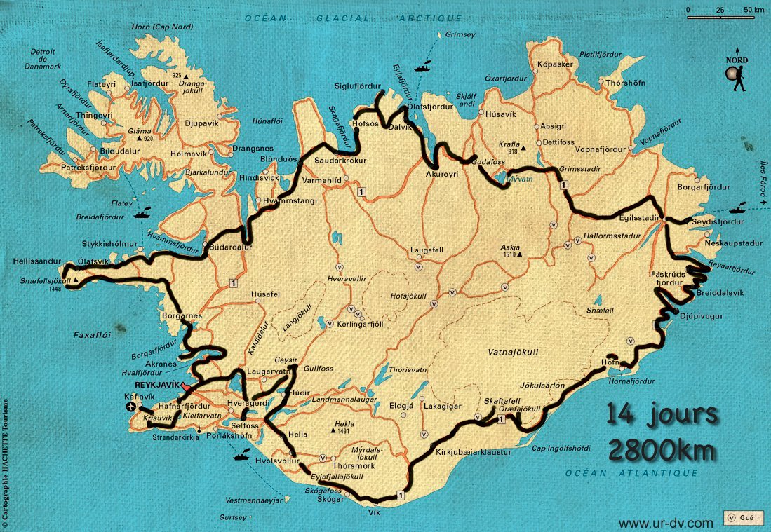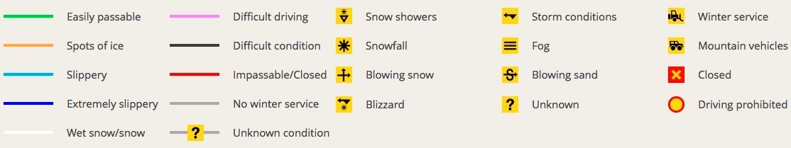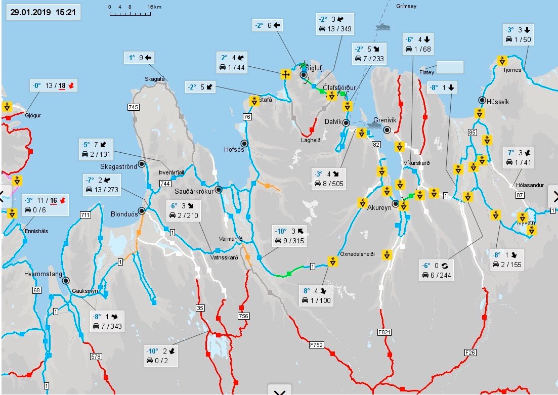 -Vegagerdin pour l’état des routes en temps réel. A consulter plusieurs fois par jour car le temps change vite et les routes peuvent se bloquer. Nous avons roulé sans difficulté sur des routes blanches, bleues (clair et foncé) et orange.