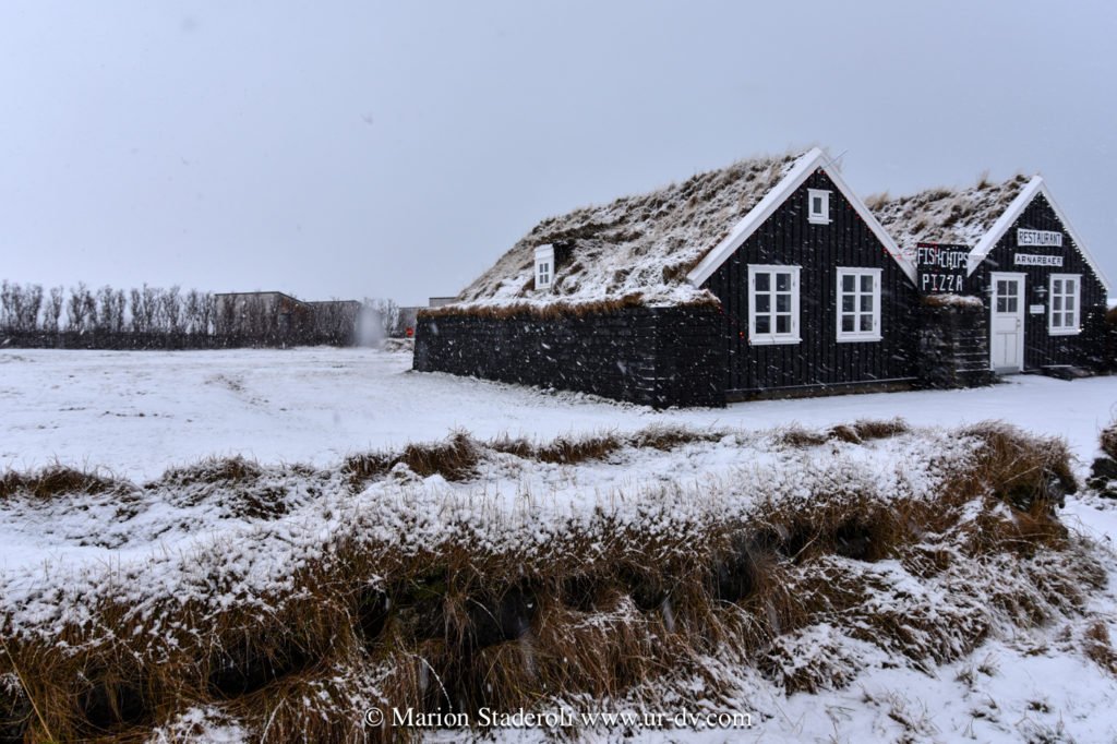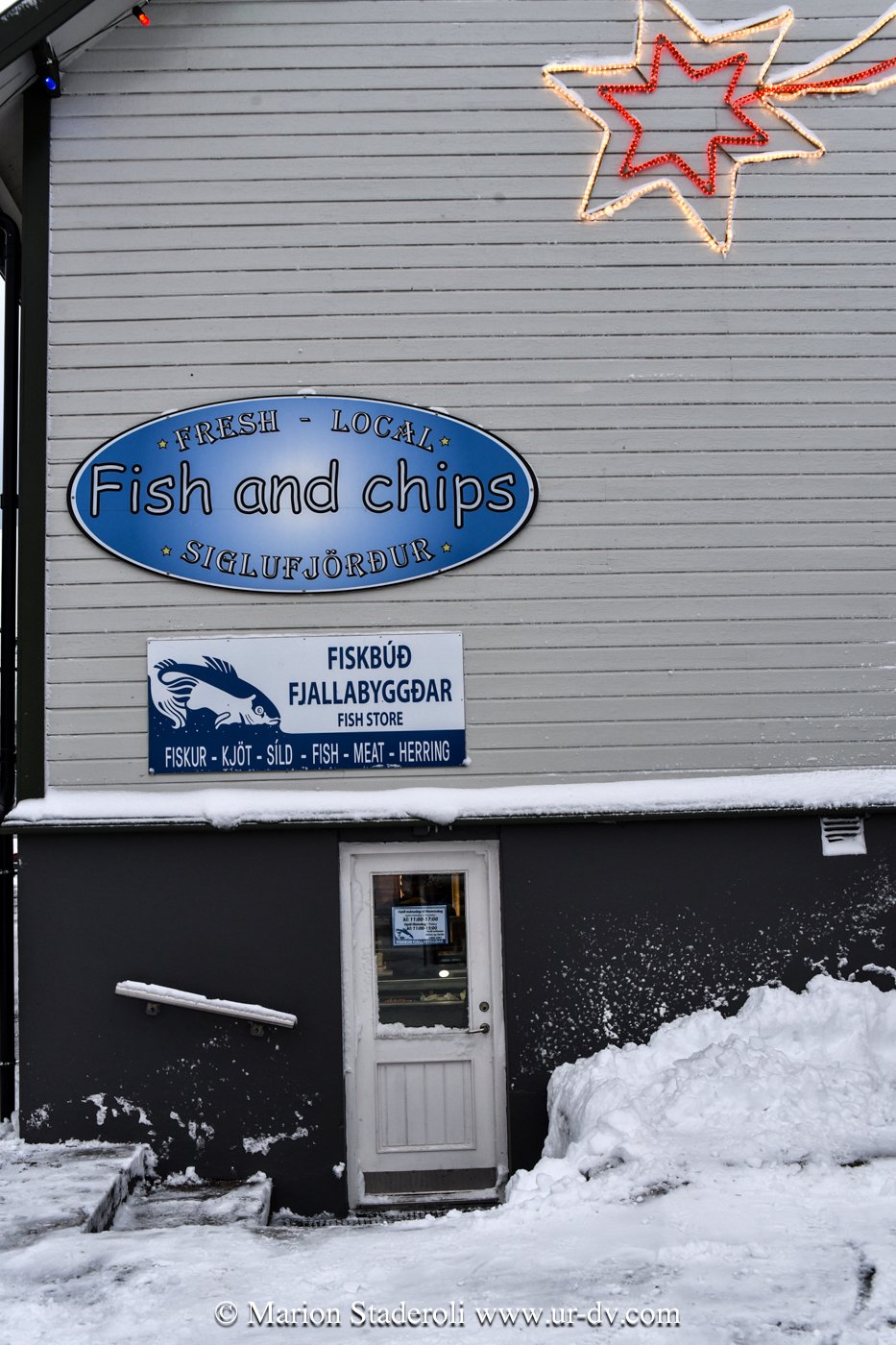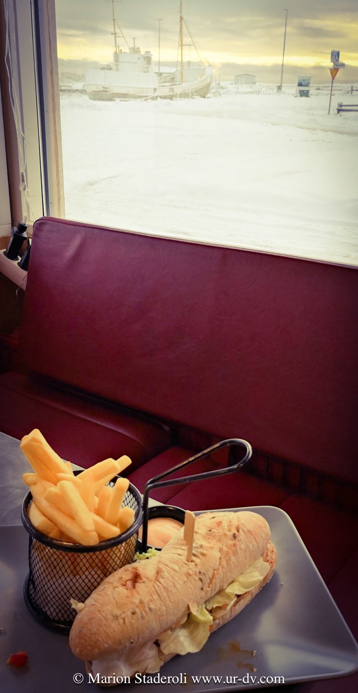 Toujours à Siglufsjodur, je vous recommande ce « fish and chips », c’était succulent et copieux, et le patron très accueillant. Il nous a fait goûter des spécialités Islandaises, sortes de pâtés de tripes et autre testicules de je ne sais quel animal 🤣comme d’hab on a accepté mangé de bon coeur! J’en ai profité pour le questionner sur la vie de ce village de 1000 habitants. Il m’a dit qu’il espère beaucoup de neige en fevrier, car la station de ski au dessus attire les touristes, et sans eux ils sont foutus! Le gouvernement peine à les aider car ils sont trop peu nombreux. Il m’a avoué que beaucoup monde ici a deux métiers: le barbier tient aussi un bar, l’hotel a aussi ouvert une blanchisserie! Ils ont réussi à garder un hôpital en s’associant avec un village voisin, une piscine, ainsi qu’un poste de police et des écoles qu’ils partagent.