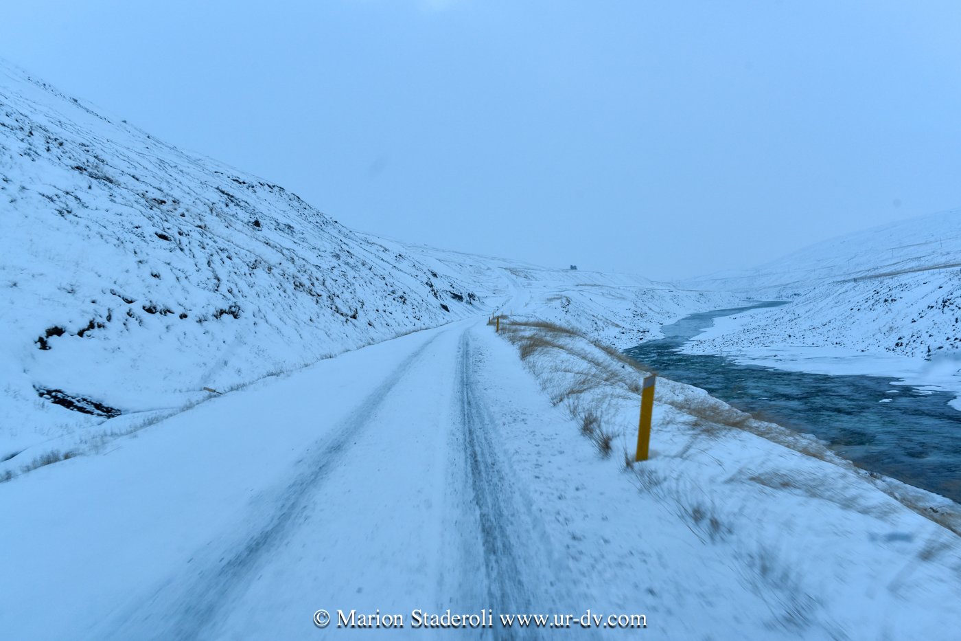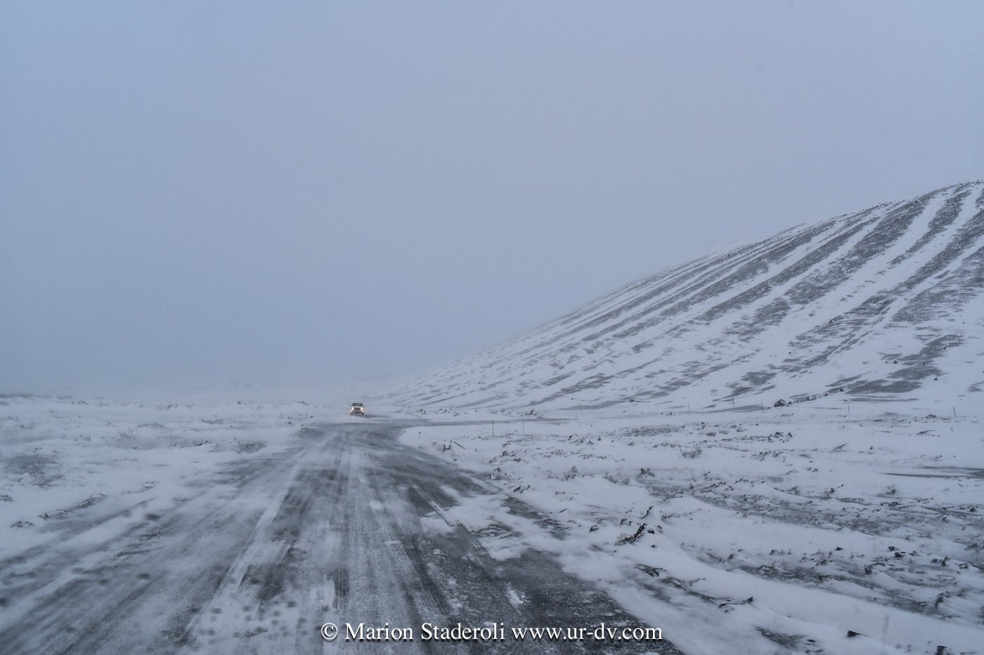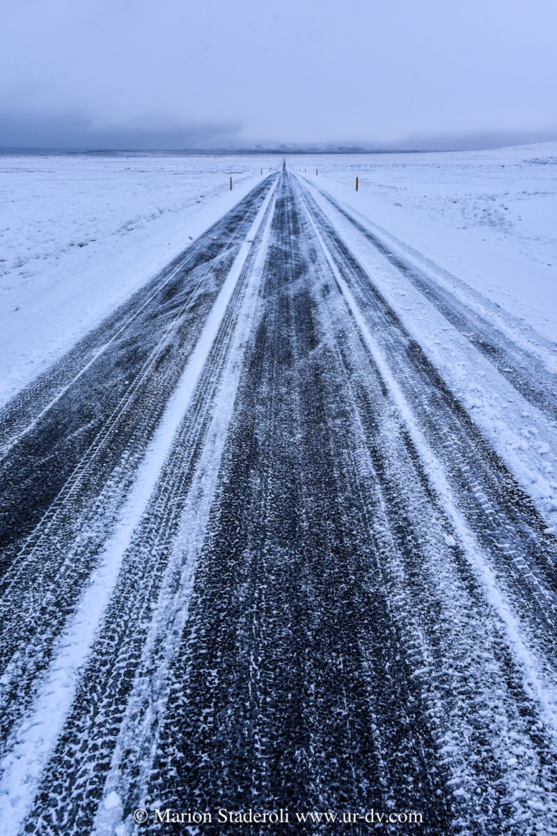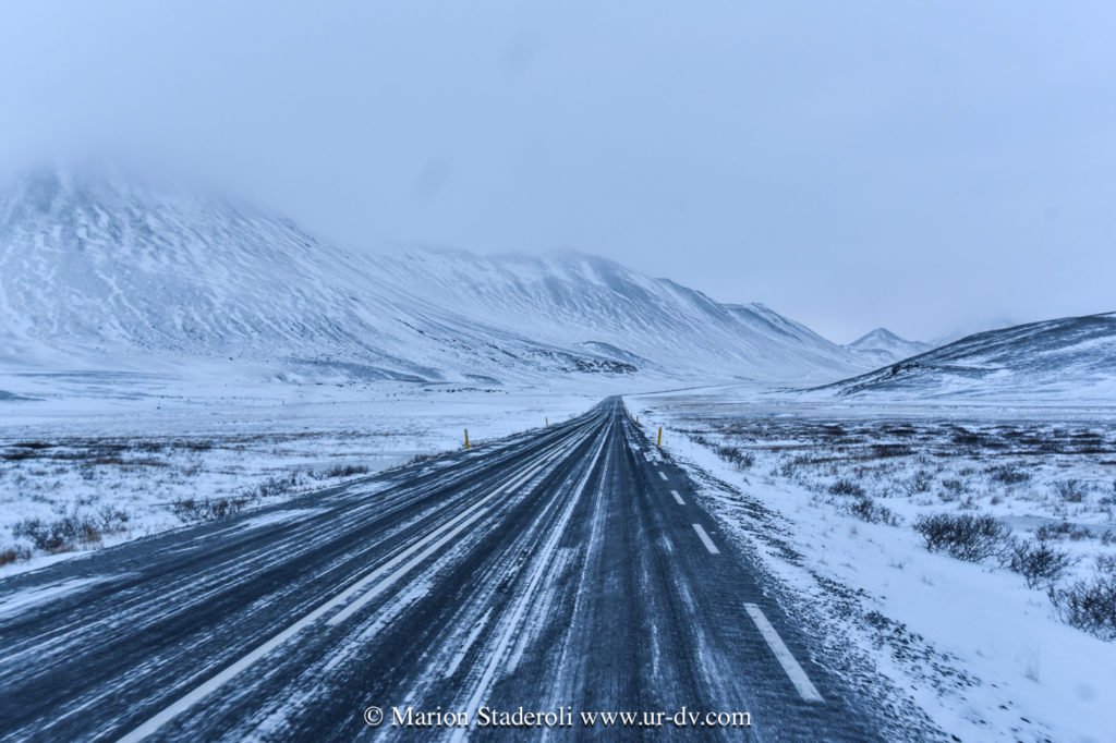 J’ai lu très souvent des messages alarmants sur le fait que conduire en Islande en hivers est dangereux et qu’il faut absolument un 4X4. Franchement… c’est faux ! Nous avons en tout parcouru 2800km, sur la route 1 et sur plusieurs routes secondaires (même parfois non goudronnées) et Antony n’a ressenti aucune difficulté. Au départ nous étions inquiets, mais après avoir testé le freinage et donné quelques coups de volants secs sur une chaussée glissante, nous avons pu voir que tout adhérait bien. Le verglas était bien présent, la neige aussi, néanmoins nous avons gardé une allure de 70km/H de moyenne. Parfois moins bien sûr, car quand on fait face a une belle chute de neige avec vent, et parfois quand il ne fait plus vraiment jour, on n’y voit pas grand chose ! Mais pas d’affolement, on ralentit et tout se passe bien. A une ou deux reprises nous n’avons pas pu emprunter la route prévue à cause de la neige trop épaisse (jusqu’à 10cm ça passe, après c’est plus embêtant, on risque surtout de ne pas réussir à faire demi tour), mais cela est resté marginal sur des routes en cul de sac non entretenues, et ailleurs nous avons vu combien l’action des déneigeuses est permanente et efficace même sur les routes secondaires.