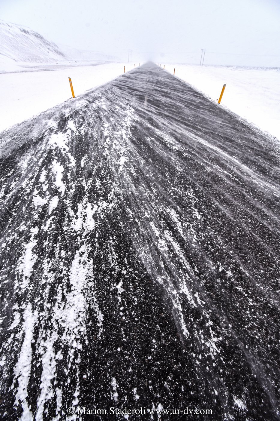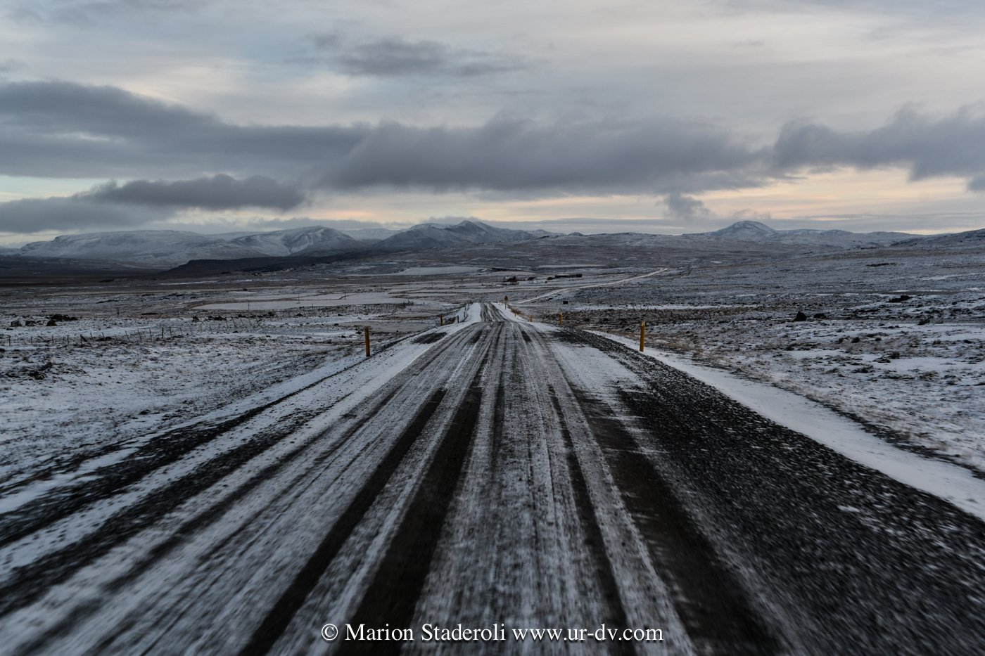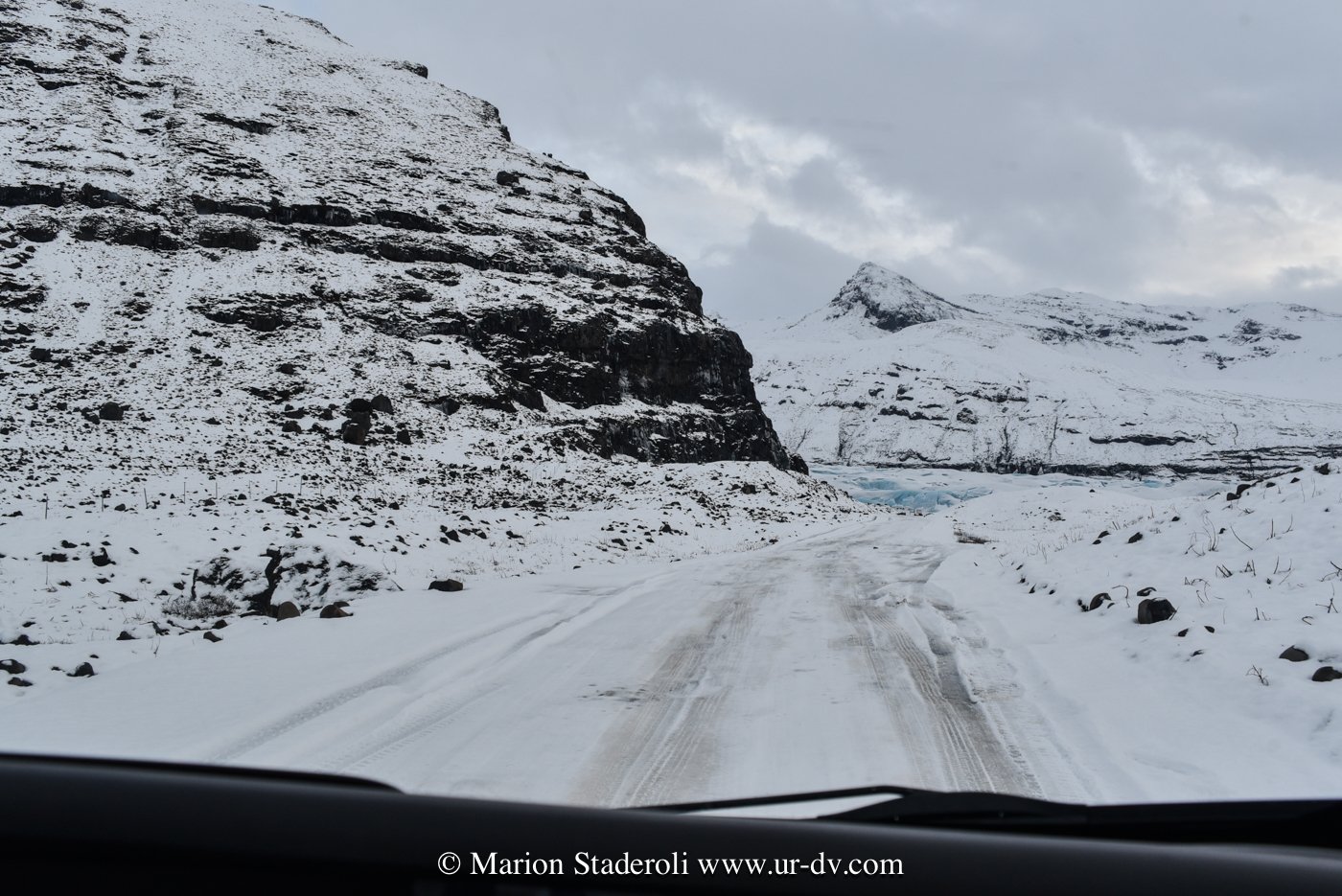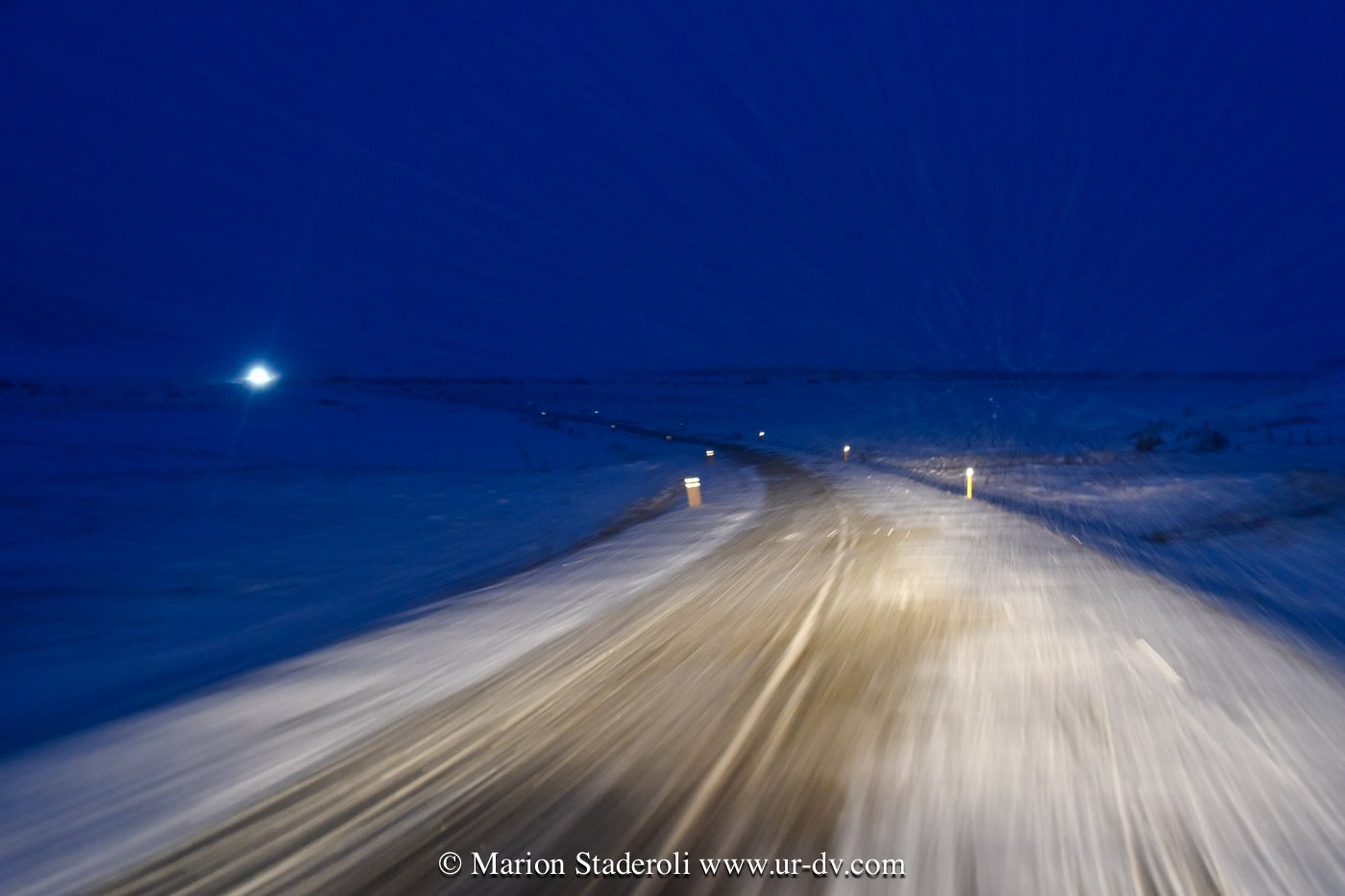 J’ai lu très souvent des messages alarmants sur le fait que conduire en Islande en hivers est dangereux et qu’il faut absolument un 4X4. Franchement… c’est faux ! Nous avons en tout parcouru 2800km, sur la route 1 et sur plusieurs routes secondaires (même parfois non goudronnées) et Antony n’a ressenti aucune difficulté. Au départ nous étions inquiets, mais après avoir testé le freinage et donné quelques coups de volants secs sur une chaussée glissante, nous avons pu voir que tout adhérait bien. Le verglas était bien présent, la neige aussi, néanmoins nous avons gardé une allure de 70km/H de moyenne. Parfois moins bien sûr, car quand on fait face a une belle chute de neige avec vent, et parfois quand il ne fait plus vraiment jour, on n’y voit pas grand chose ! Mais pas d’affolement, on ralentit et tout se passe bien. A une ou deux reprises nous n’avons pas pu emprunter la route prévue à cause de la neige trop épaisse (jusqu’à 10cm ça passe, après c’est plus embêtant, on risque surtout de ne pas réussir à faire demi tour), mais cela est resté marginal sur des routes en cul de sac non entretenues, et ailleurs nous avons vu combien l’action des déneigeuses est permanente et efficace même sur les routes secondaires.