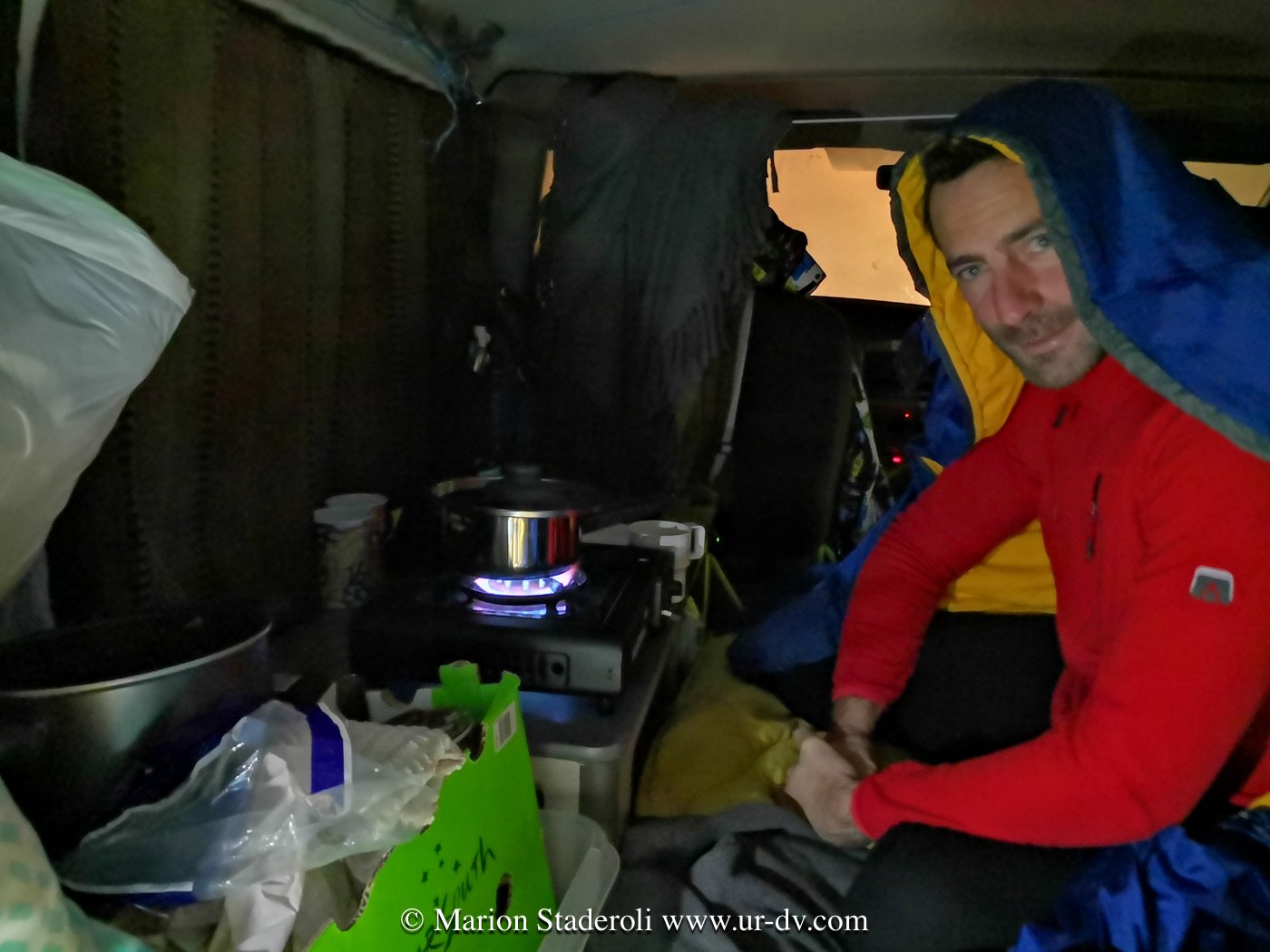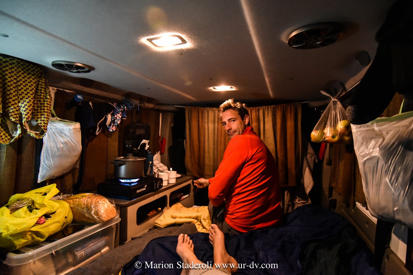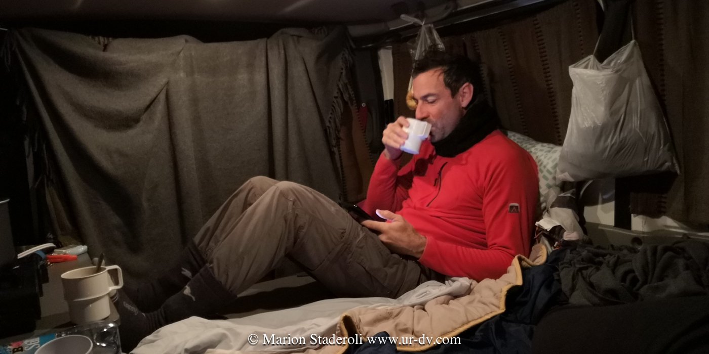 Réveillés vers 7H, on attrape ses vêtements dans le sac qui pend au dessus de notre tête. Un petit café préparé sur notre réchaud à gaz, puis on se dirige vers la première station service pour se débarbouiller et aller aux toilettes. Au premières lueurs du jour on prend la route, c’est parti pour une journée quasi non-stop (il était rare que l’on mange, en décalage avec les horaires et le soleil!). En fin de journée, vers 16H30 il faut penser à trouver où passer la nuit. Rapide repérage (ou plus laborieux parfois), puis on passe un peu de temps dans une station service ou une piscine, et puis, vient le temps de rentrer, d’allumer le chauffage, de « cuisiner » , de manger et se coucher.