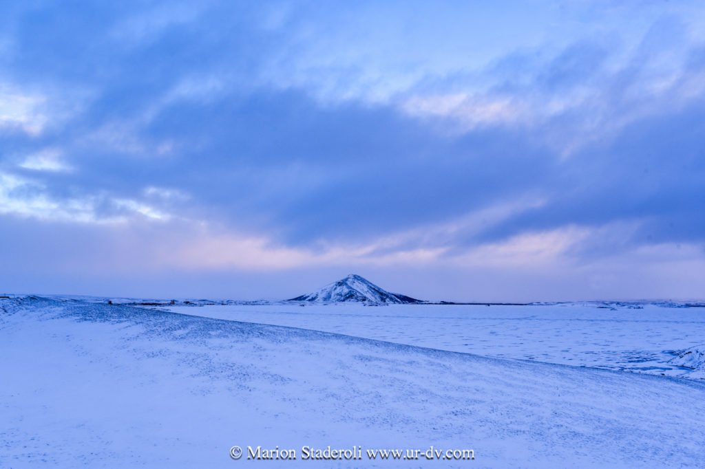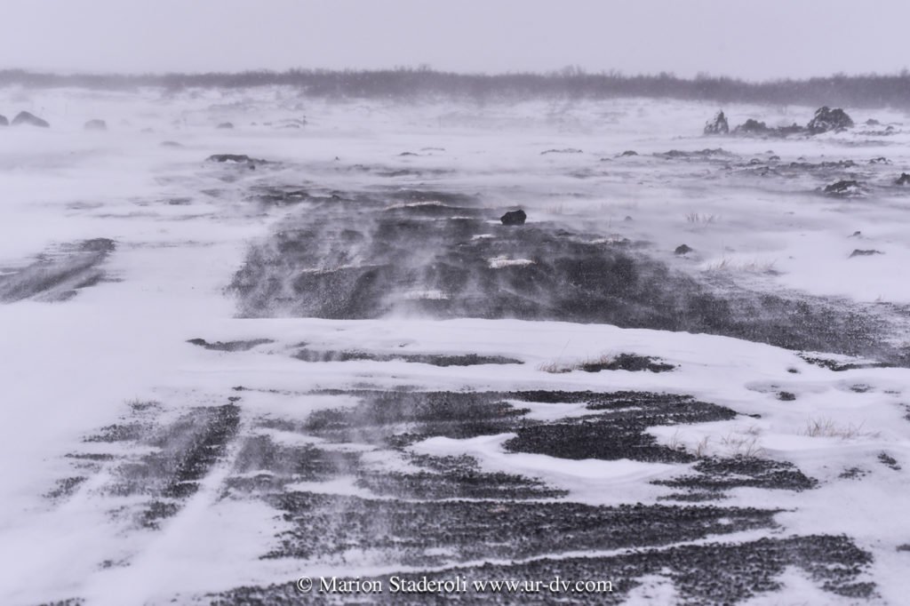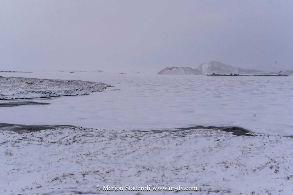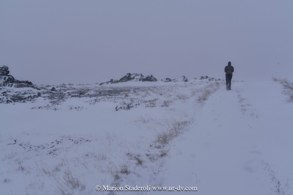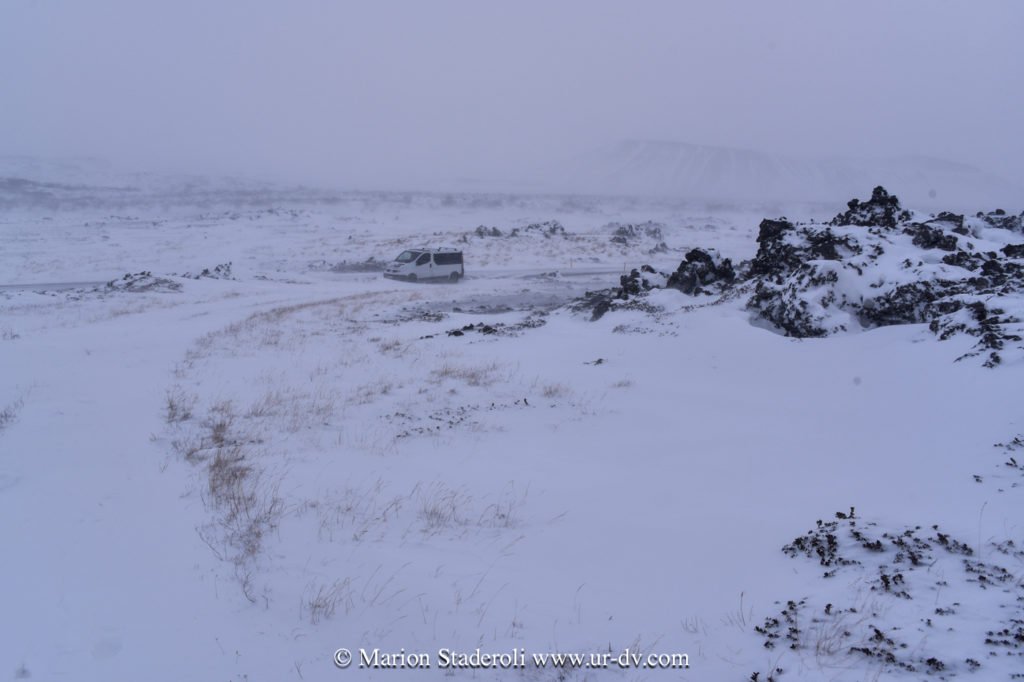 Après la cascade nous avons repris la route et avons parcouru la route sud du lac Myvatn, où il y a plein d’arrêts à faire. C’est un site avec des cratères, des grottes, des fumeroles et plein d’autres choses, que nous n’avons pas vraiment eu le loisir de voir (ou du moins rapidement et dans des tourbillons de neige!). Quoi qu’il en soit c’était très beau quand même, tout ce blanc, juste ponctué de noir, et puis une ambiance de fin du monde… 😍 Nous avons cru un moment que le temps s’arrangeait (un coin de bleu est apparu!) mais non, cela a repris de plus belle… Nous avons croisé deux ou trois autres voitures, toutes comme nous hésitantes sur les routes à emprunter ou pas, avec le peu de visibilité…. Nous avons bien essayé de partir marcher mais au bout d’un moment nous nous sommes crus Mike Horn dans l’antarctique perdu dans une tempête, alors nous avons vite fait demi tour!😂