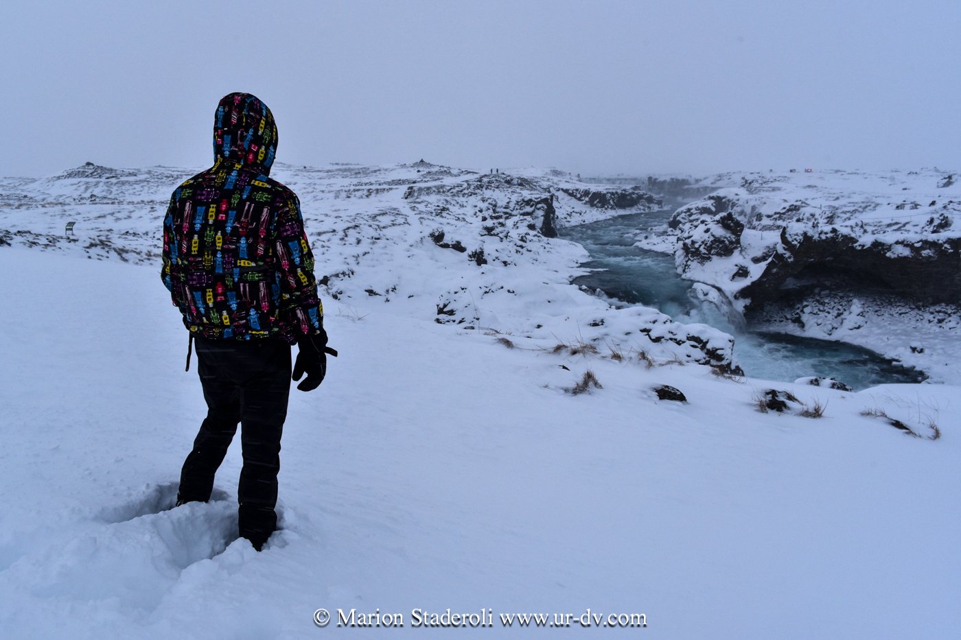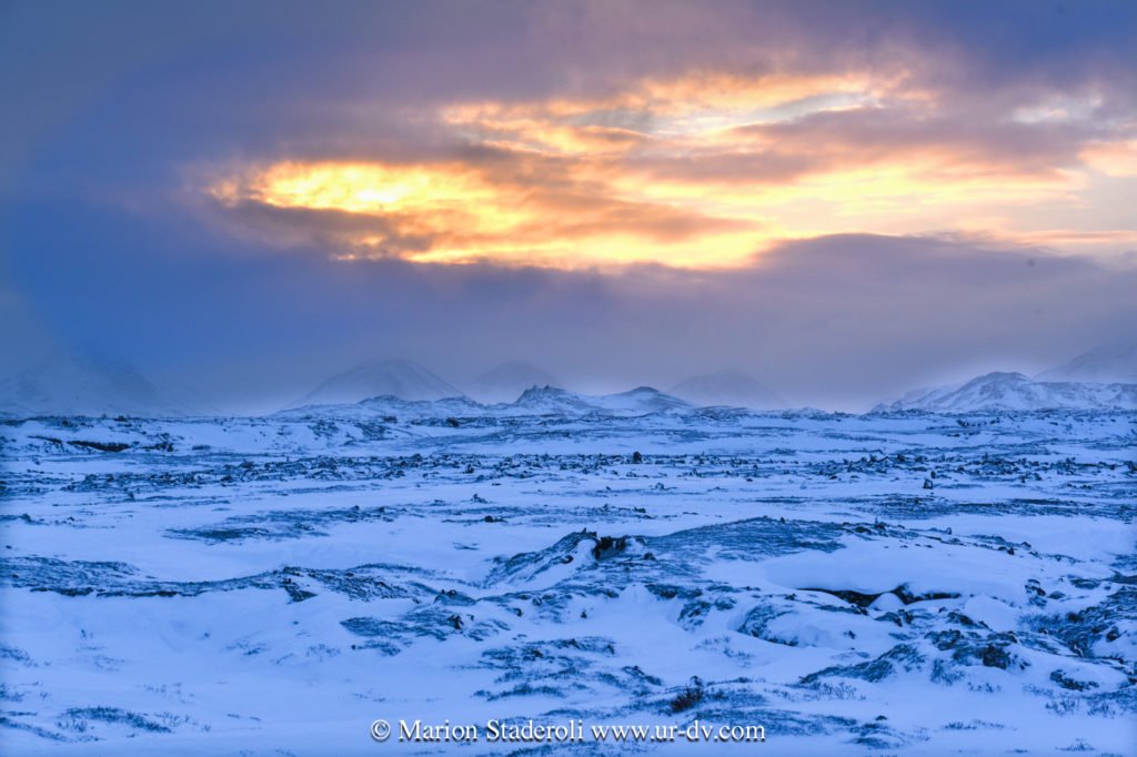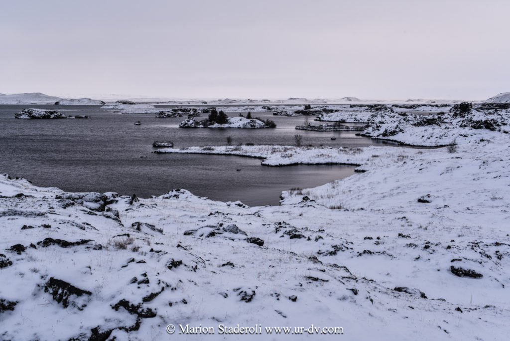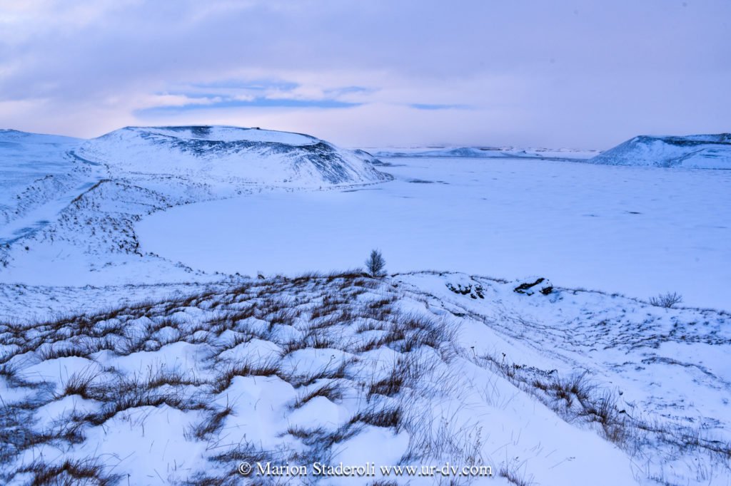 Après la cascade nous avons repris la route et avons parcouru la route sud du lac Myvatn, où il y a plein d’arrêts à faire. C’est un site avec des cratères, des grottes, des fumeroles et plein d’autres choses, que nous n’avons pas vraiment eu le loisir de voir (ou du moins rapidement et dans des tourbillons de neige!). Quoi qu’il en soit c’était très beau quand même, tout ce blanc, juste ponctué de noir, et puis une ambiance de fin du monde… 😍 Nous avons cru un moment que le temps s’arrangeait (un coin de bleu est apparu!) mais non, cela a repris de plus belle… Nous avons croisé deux ou trois autres voitures, toutes comme nous hésitantes sur les routes à emprunter ou pas, avec le peu de visibilité…. Nous avons bien essayé de partir marcher mais au bout d’un moment nous nous sommes crus Mike Horn dans l’antarctique perdu dans une tempête, alors nous avons vite fait demi tour!😂