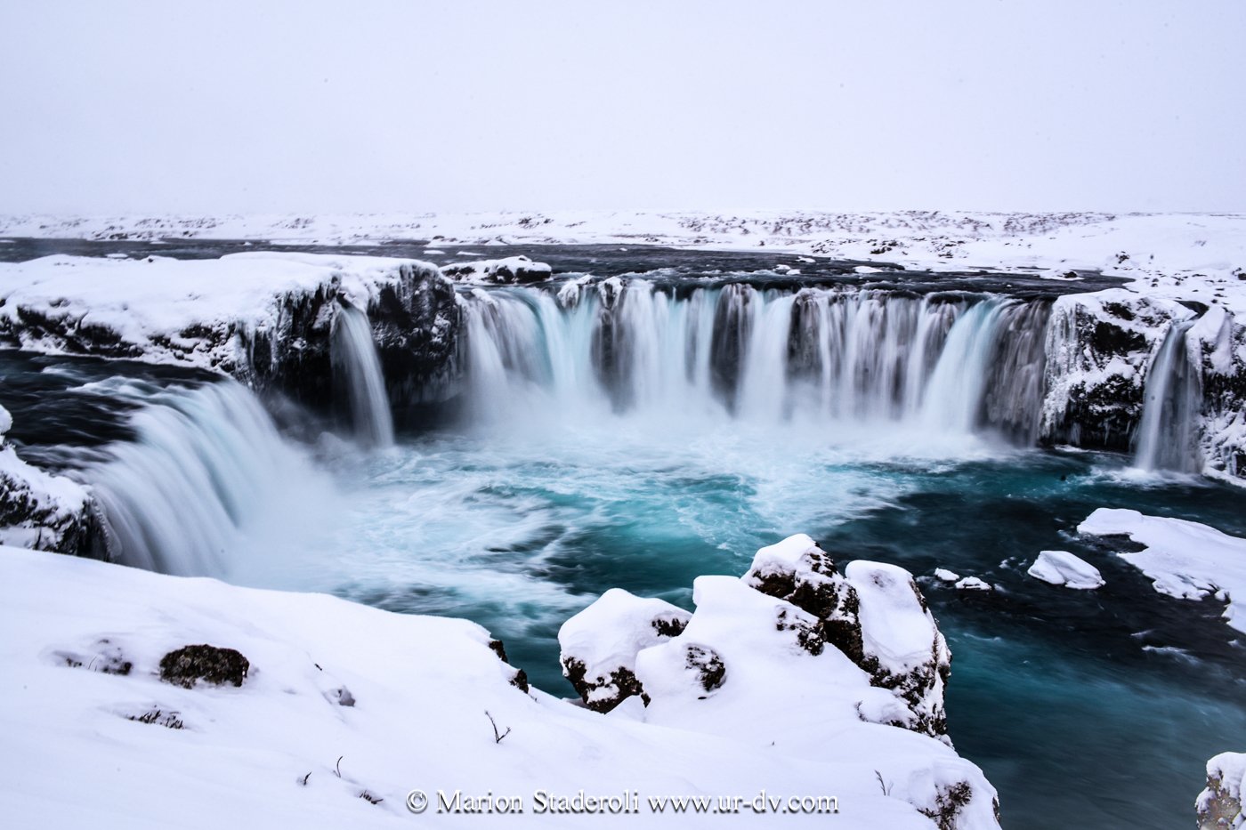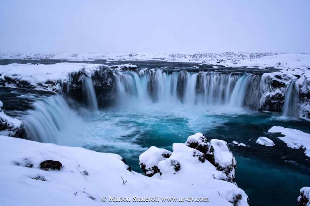 Ce matin, les déneigeuses ont œuvré et nous avons pu partir dès les premières lueurs du jour (10H30 quoi). Nous sommes allés à quelques km voir la cascade Godafoss (12 mètres de haut par 30 de large!!). Le vent soufflait fort et la neige tombait, nous n’avons pas pour autant eu froid aux yeux (enfin si, seulement aux yeux et aux joues en fait!) et avons parcouru les 500m ( x2, aller-retour) pour la découvrir. De la neige jusqu’aux mollets, voilà de quoi bien se réveiller! Mais ça vaut le coup n’est-ce pas?