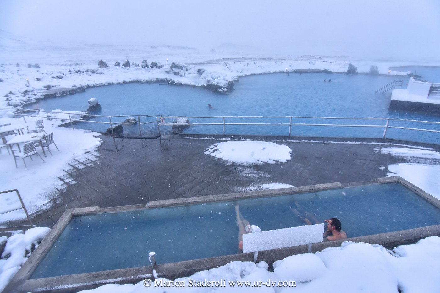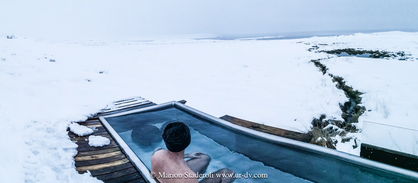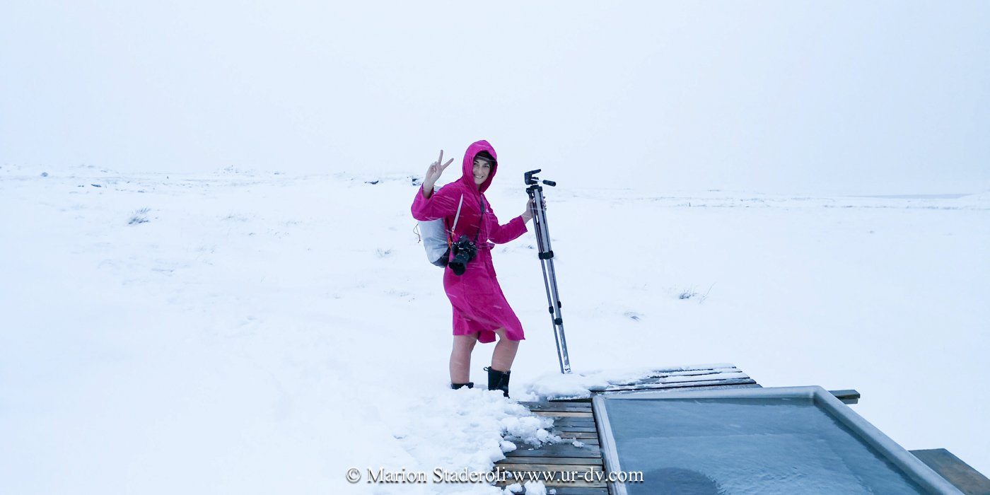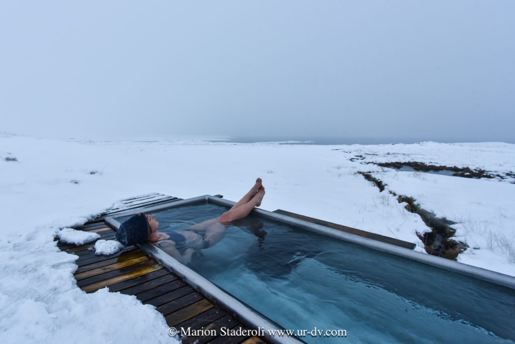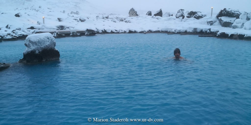 Et puis… la récompense… nous avons renoncé à continuer à rouler ou marcher et passé les dernières heures de la journée au « Nature bath de Myvatn » dans une eau naturelle et légèrement soufrée. -7° dehors, bien au chaud immergés comme toujours, et en prime la neige qui tombe sur nos têtes