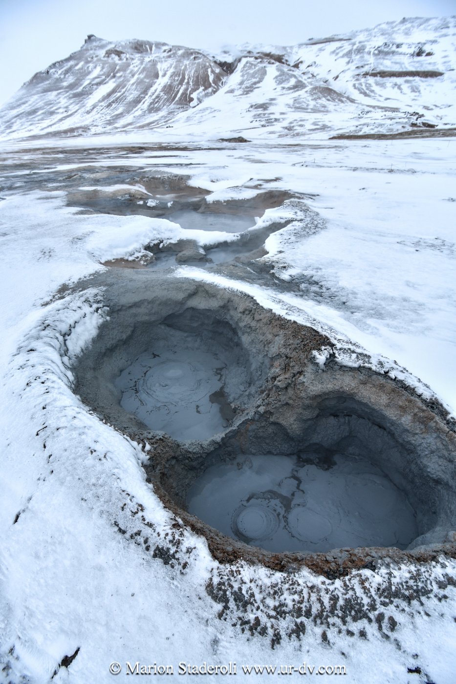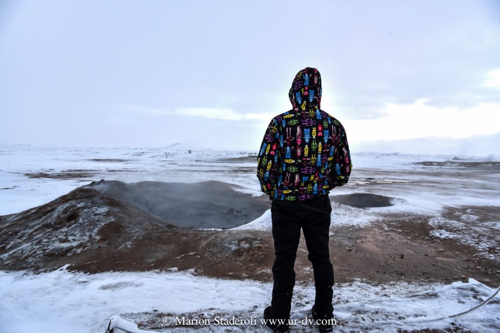 Ce matin, avant de quitter la zone de Myvatn, nous sommes allés faire un tour aux « marmites de boue ». L’eau s’infiltre sous terre, atteint le magma et ressort propulsée sous forme de vapeur! Ça « blurpe-blurpe », ça fume et ça sent le soufre. Cela nous a fait pensé au Sud Lipez en Bolivie où on a vu le même phénomène, la neige en moins