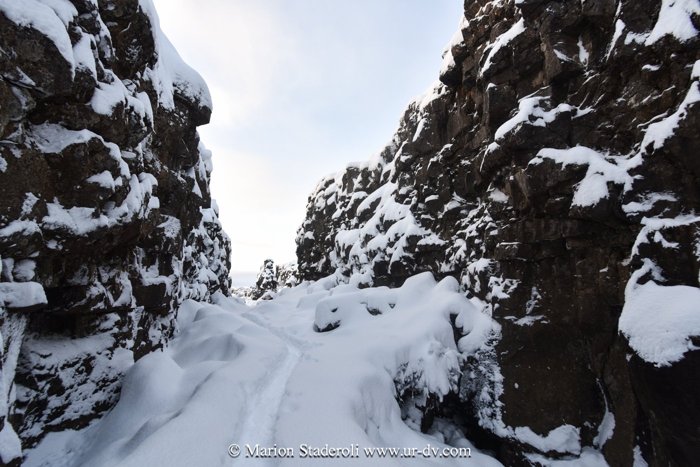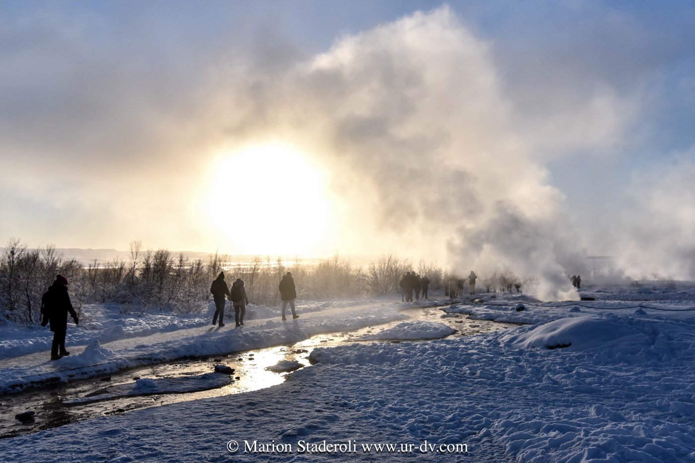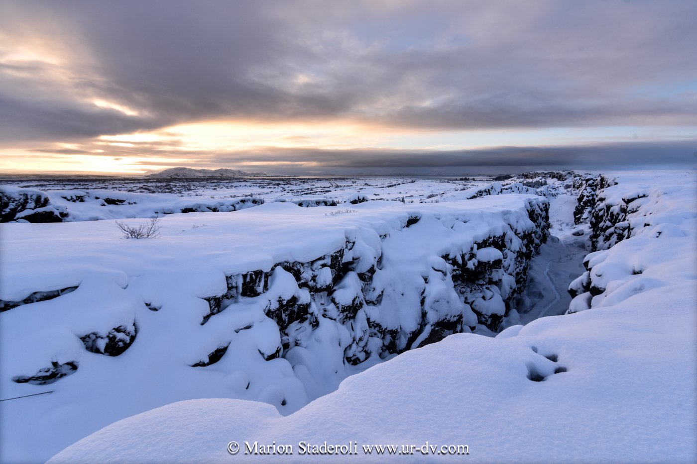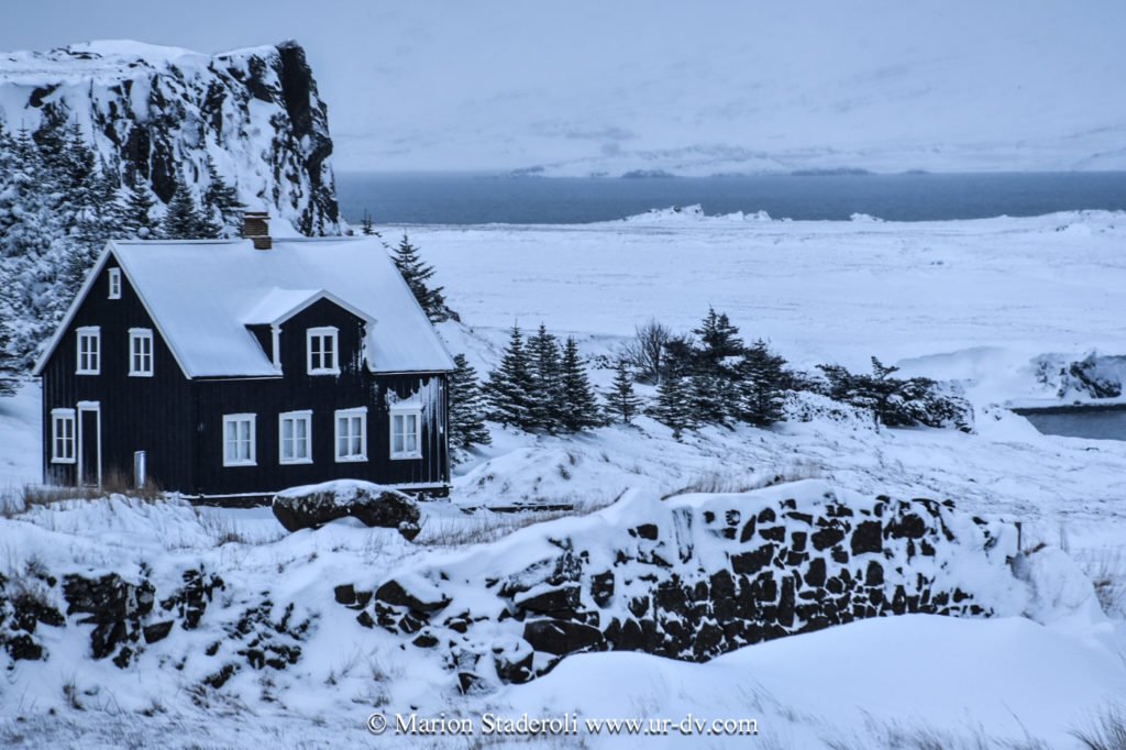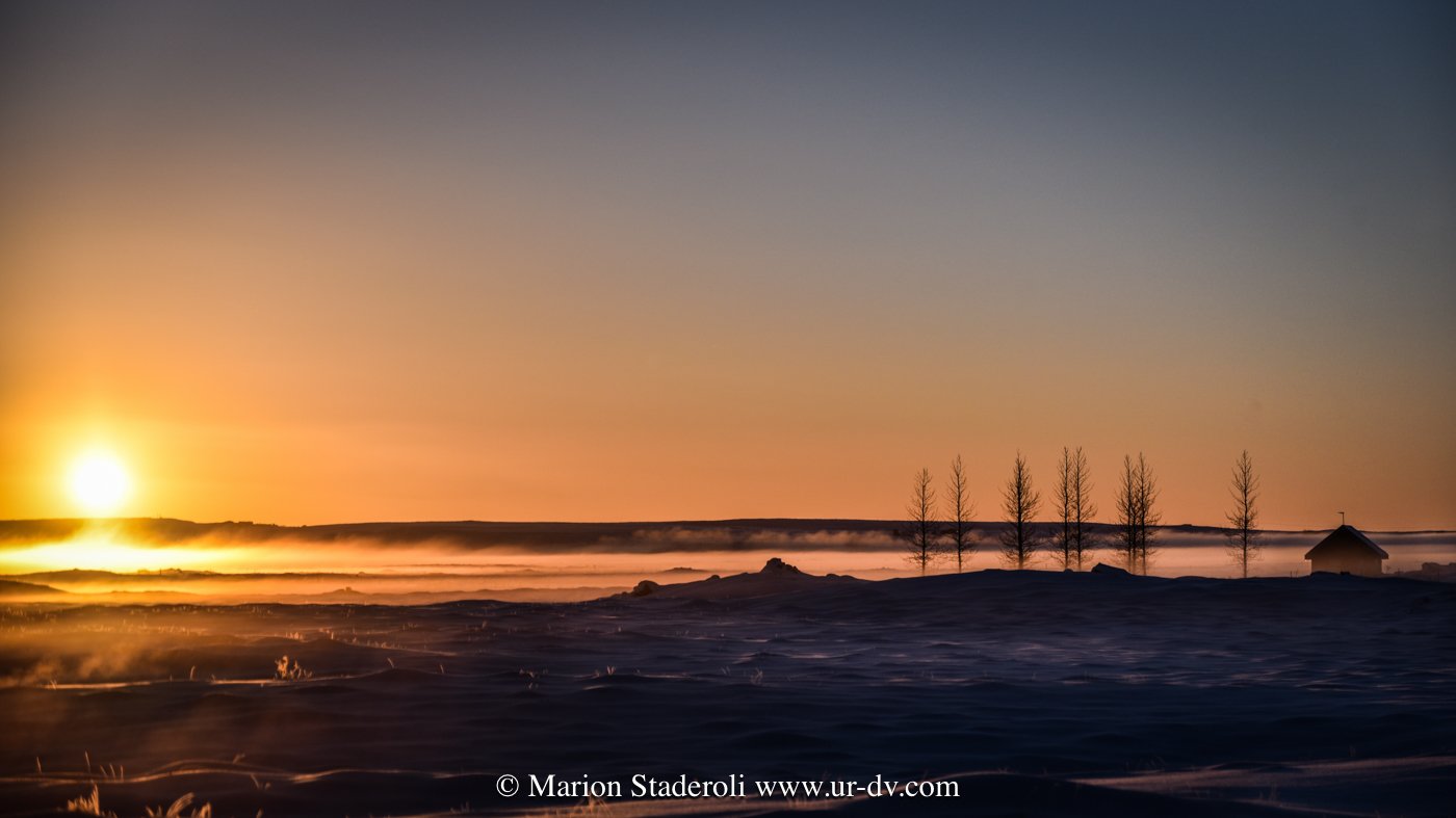 Ce matin une belle promenade dans le parc national Thingvellir. Au milieu d’un décor immaculé nous avons sillonné sur plusieurs kilomètres dans la faille du rift qui sépare les plaques tectoniques eurasiatique et nord américaine; lever de soleil, superbe vue!