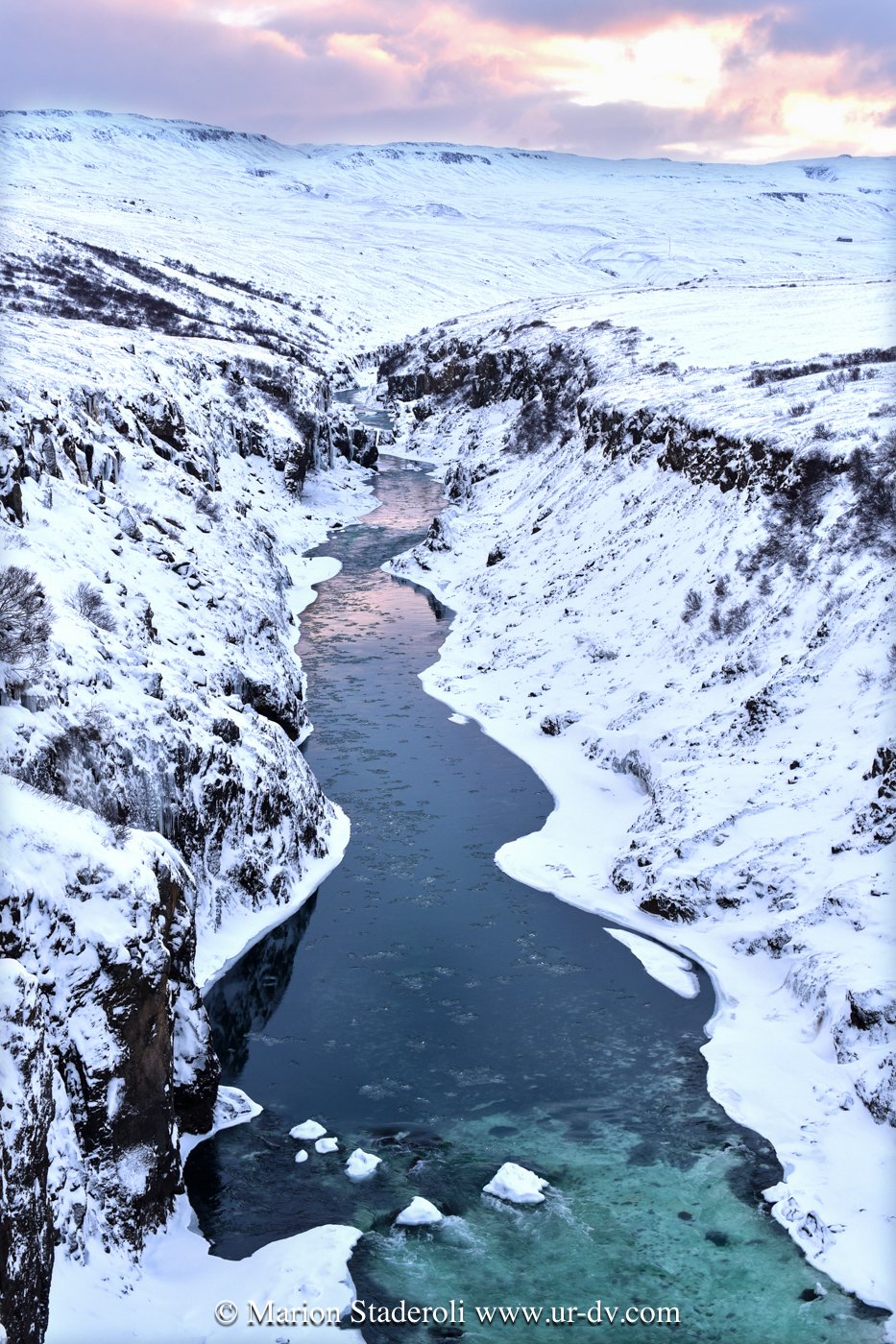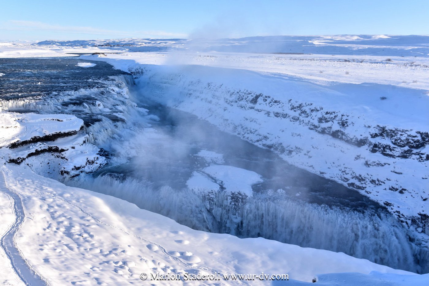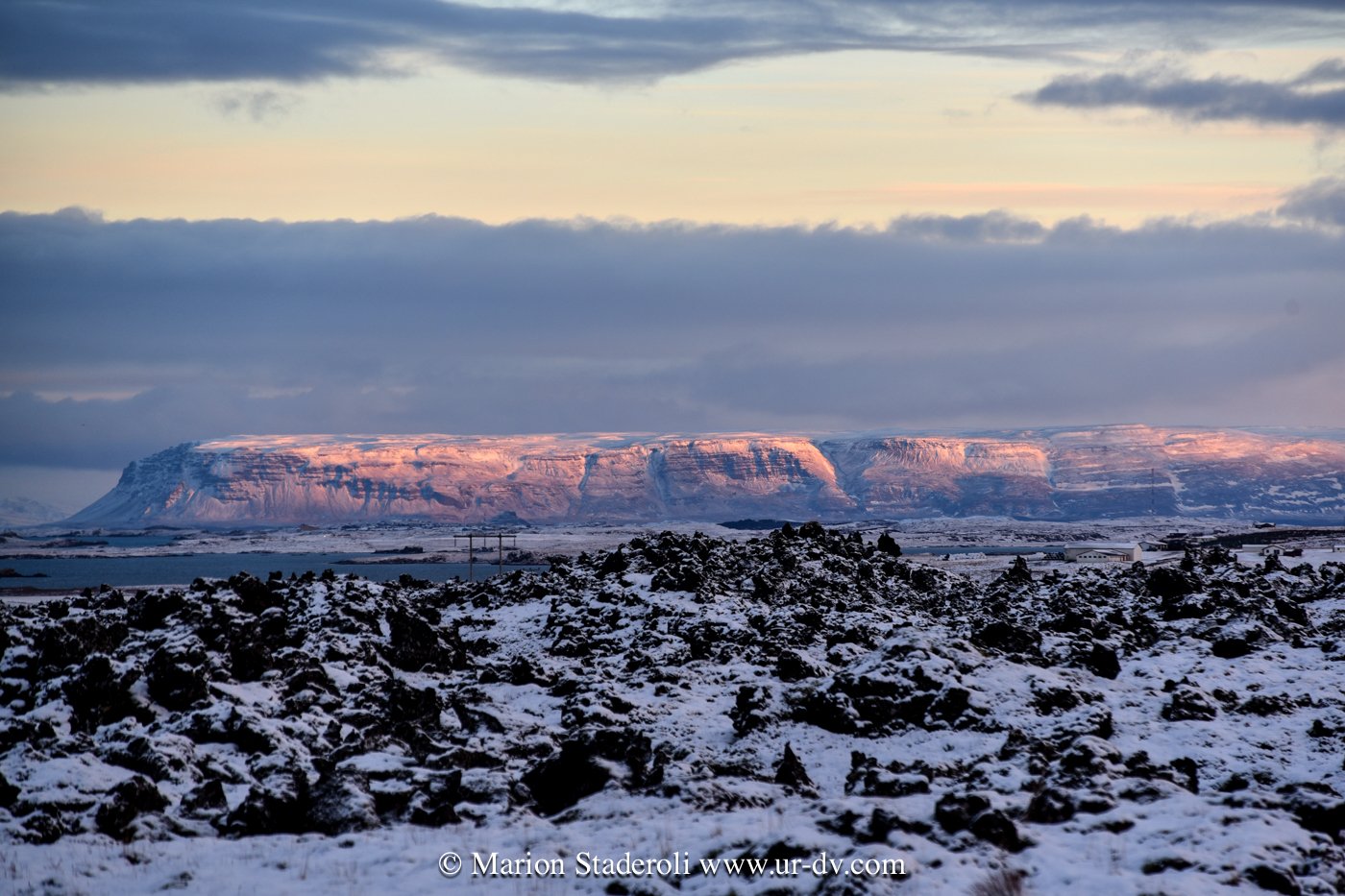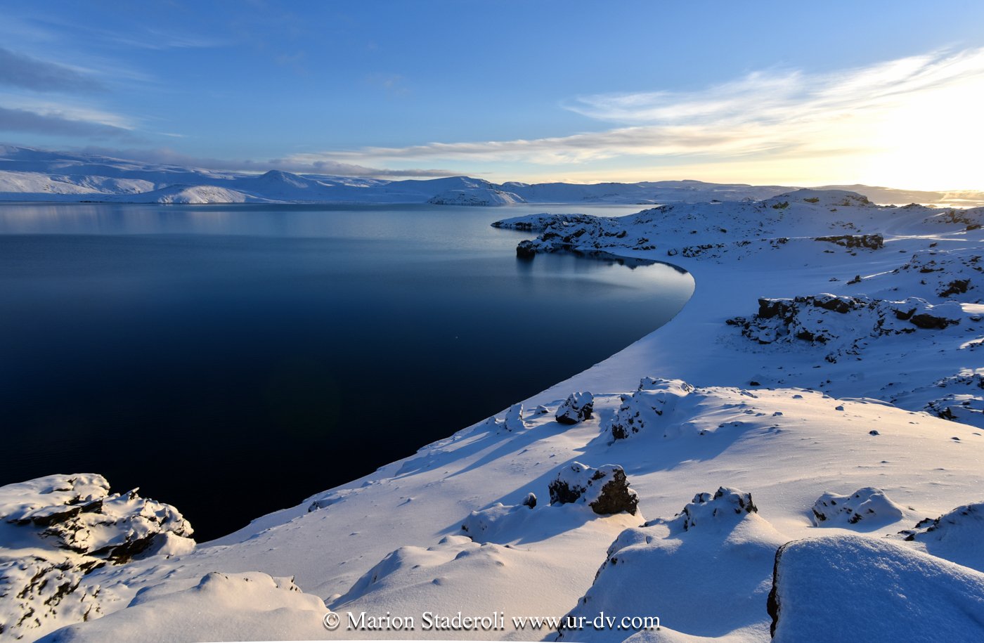 Ce matin une belle promenade dans le parc national Thingvellir. Au milieu d’un décor immaculé nous avons sillonné sur plusieurs kilomètres dans la faille du rift qui sépare les plaques tectoniques eurasiatique et nord américaine; lever de soleil, superbe vue!