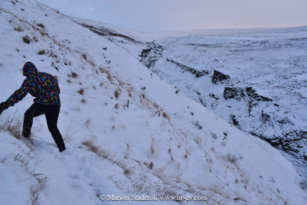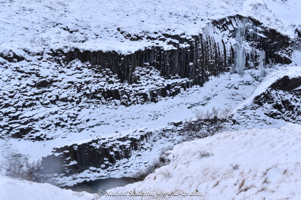 Nous nous sommes ensuite dirigés vers l’est et avons tenté de voir le Studlagil canyon. Pour l’atteindre il a fallu sortit de la route 1 et emprunter une route secondaire de gravier sur 20km, les conditions étaient bonnes, et nous avons longé le canyon et la rivière, magnifiques paysages. Arrivés au bout nous avons découvert l’accès à la gorge: très abrupte et enneigé, avec des pieux et une corde pour se tenir pour descendre sur le versant… Nous avons avancé un peu, juste de quoi réussir à apercevoir le fond, mais pas plus. En photo ça ne rend pas, mais c’est très beau, il s’agit de colonnes de basalte hexagonales ou octogonales, c’est impressionnant ce que la nature peut faire! Un petit café au grand air et on repart