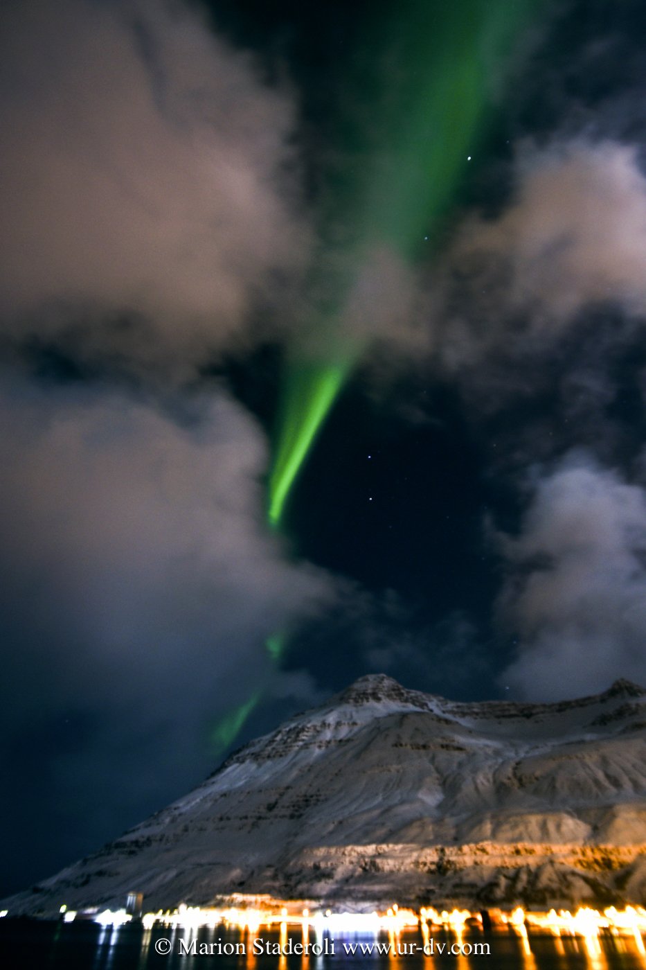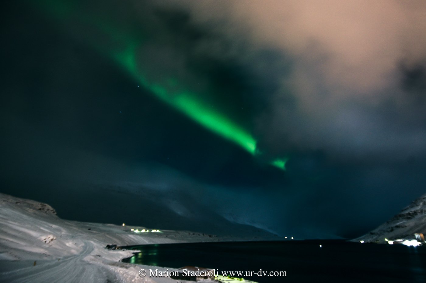 Nous tournons pour chercher où dormir, puis décidons d’aller patienter dans une station service. Nous buvons un thé et je consulte, comme chaque jour, les prévisions météo et aurore. Je vois une fenêtre d’une heure où les nuages devraient se dissiper. Nous avons du mal à y croire tant le ciel est bouché! Cela aura lieu autour de 20H, nous décidons donc d’attendre, puis de prendre la route pour nous éloigner autant que possible de la ville. Nous trouvons un bon point de vue, un peu en hauteur et nous arrêtons en bord de route. Nous sortons, il fait plutôt bon, pas de vent, et c’est assez agréable. Les nuages sont encore là… Nous n’y croyons pas trop… Je fais quelques clichés du fjord et de la ville histoire de m’occuper, puis je commence à distinguer une étrange trainée lumineuse… Les nuages bougent et laissent apparaître du vert!