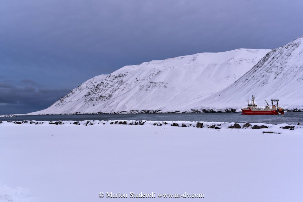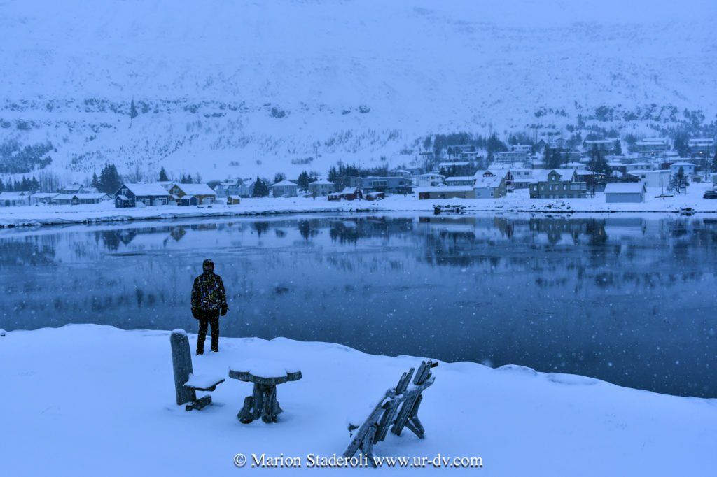 Hier soir, nous sommes arrivés à la nuit tombée et sous des chutes de neige dans un petit village niché au coeur d’un fjord: Seydisfjodur. Ce que je devine du paysage est magnifique!