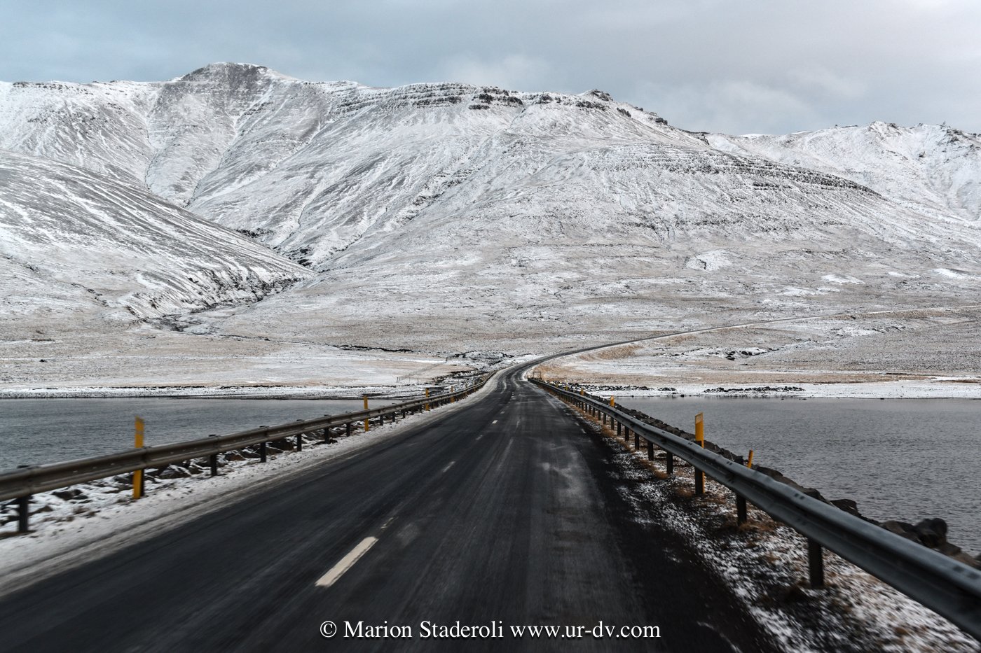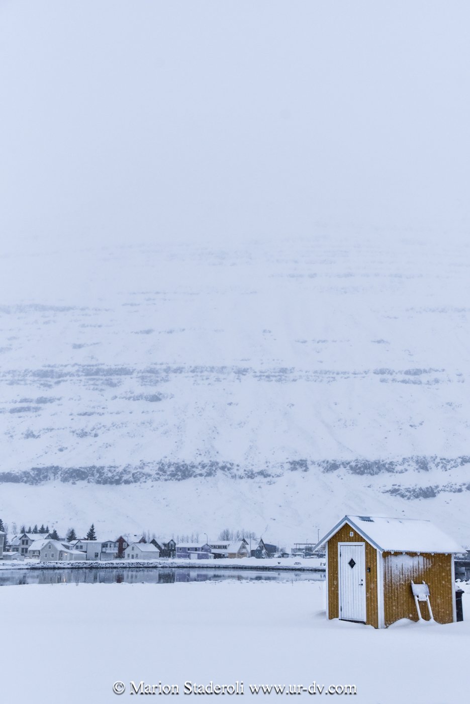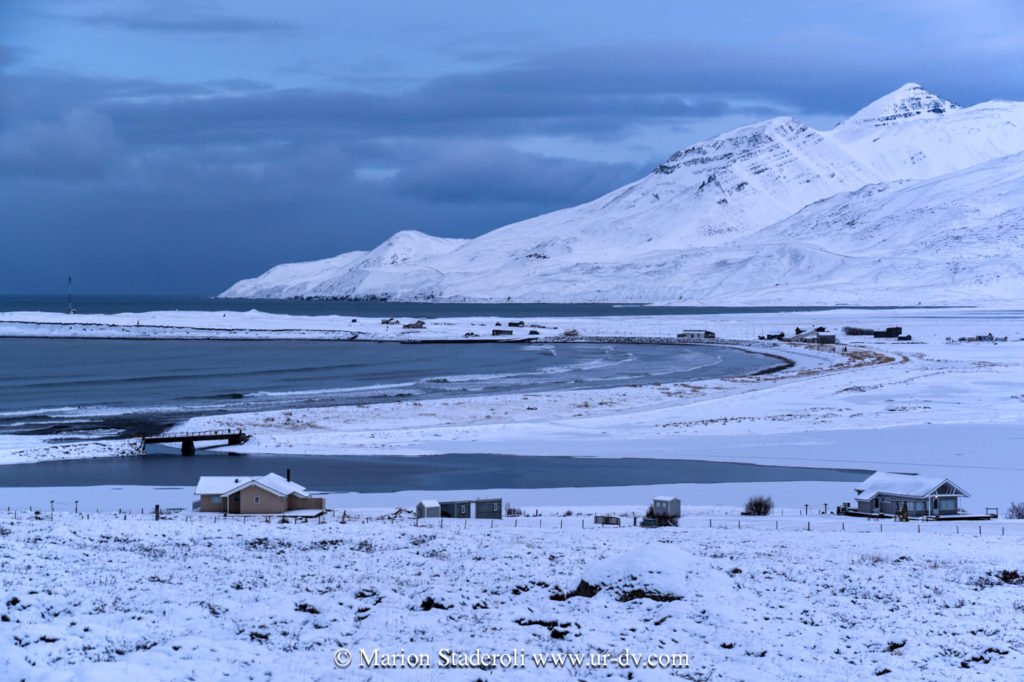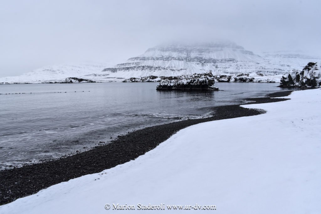 Ce matin balade dans le village Seydisfordur sous les flocons (définitivement j’adore l’ambiance des fjords!), puis route vers le sud avec des rencontres sympas et de jolis paysages en noir et blanc