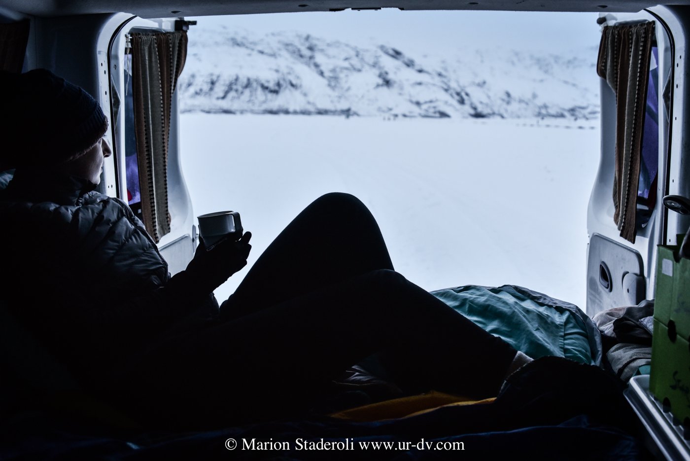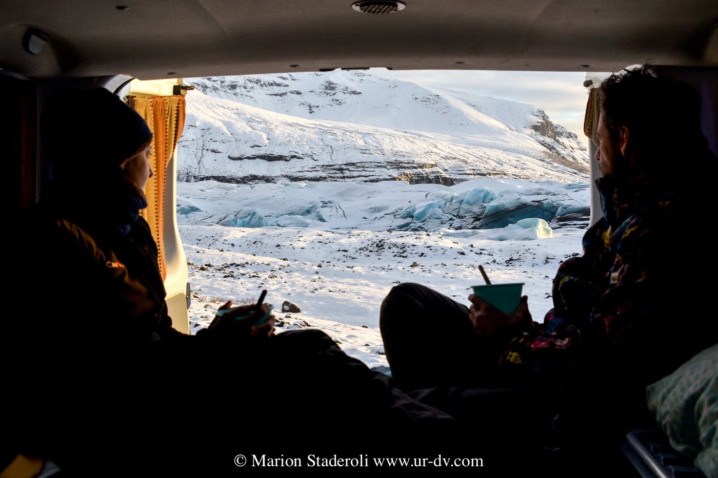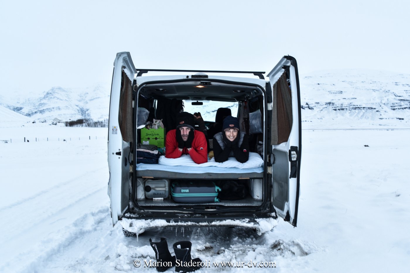 Je dis « campervan » ou « voyage en van », et là, ça y est, vous me voyez lunettes de soleil sur le nez et cheveux aux vents dans le soleil couchant, le sourire aux lèvres dans ma maison douillette sur roulettes. Je vous arrête là ! C’est un peu différent… déjà par « van » on veut dire « voiture aménagée ». En gros, ce sont des utilitaires qui servent chez nous généralement aux entrepreneurs, et dans lesquels avec quelques planches et coups de marteaux, on installe un lit et une esquisse de cuisine. Point. Pas d’isolation des parois (glacées!) mais heureusement un chauffage (attention pas dans le modèle le moins cher). Trois quatre mètres carrés dans lesquels on ne se tient pas debout et où l’on doit vivre une grosse partie de la journée. Effectivement quand on pense camping, on imagine une vie à l’extérieur. En général on cuisine dehors, on mange dehors, on se lave dehors, et on ne rentre dans le van (ou la tente) que pour dormir. Sauf qu’en hivers en Islande ça ne se passe pas comme ça ! En moyenne, nous avions droit au soleil, enfin pardon, à la lumière du jour, de 10H30 à 17H, tout ça en comptant les premières lueurs de l’aube et les dernières du crépuscule. Cela fait beaucoup de temps à rester à l’intérieur, à attendre que le temps passe… Je vous avoue que les deux premiers jours ont été un peu difficiles… C’est sombre, on n’a pas la place de vraiment ranger ses affaires, on entasse tout, on ne retrouve rien, on se marche dessus, et le temps est long ! Et puis… on réussit à s’installer. Cela s’est résumé pour nous à suspendre des sacs poubelles avec nos affaires à l’intérieur !