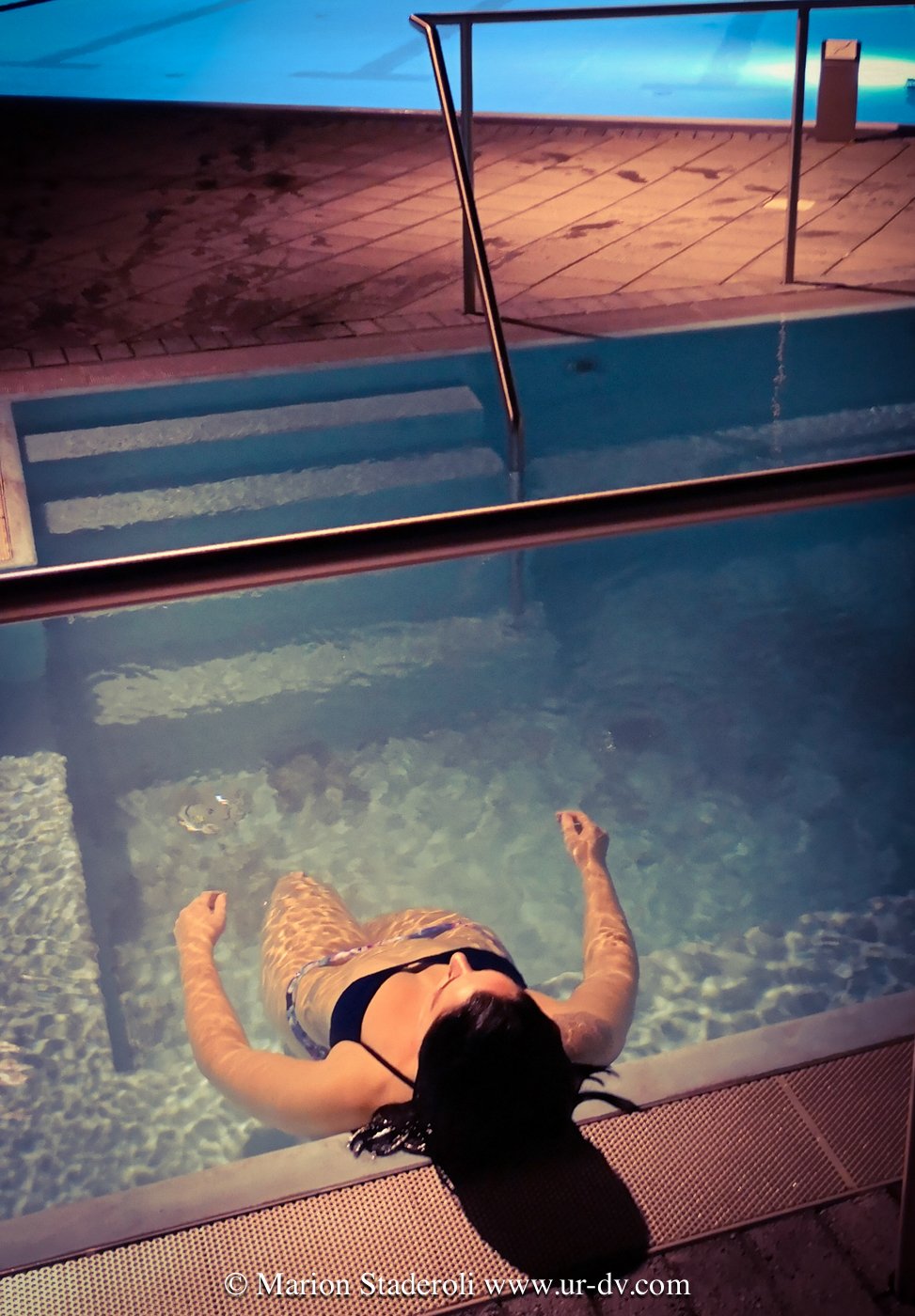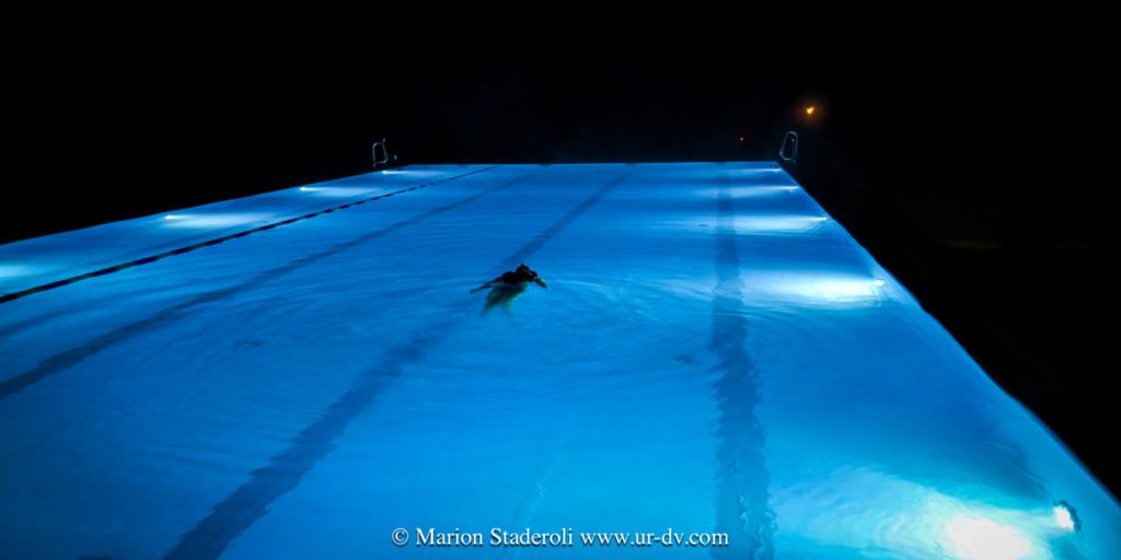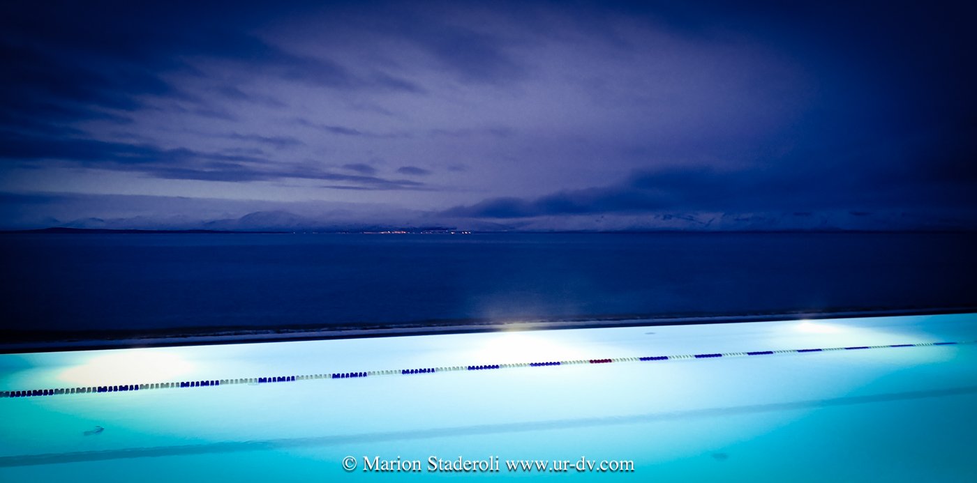 9:00 nous sortons du vestiaire, et du bâtiment, la piscine est dehors, il fait -4° et nuit noire, l eau est à 38, la vapeur danse…. Nous profitons du calme absolu, nous nageons un bon moment, puis nous nous laissons flotter… une heure plus tard, les lueurs de l aube nous laissent deviner le magnifique décor… la mer, et les montagnes enneigées au loin…