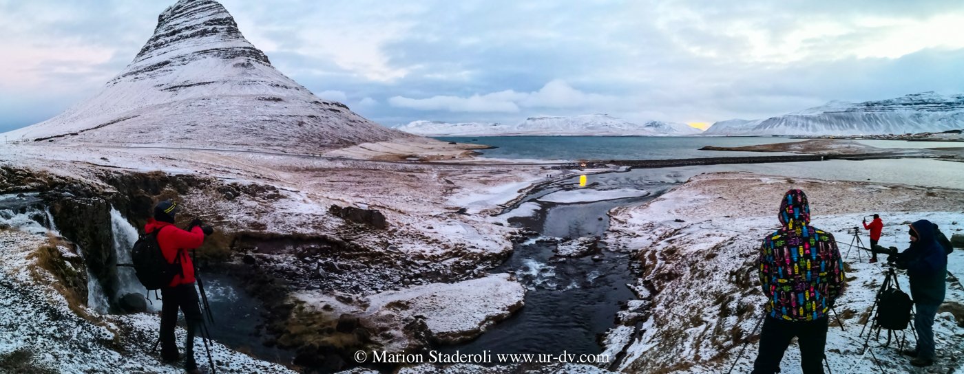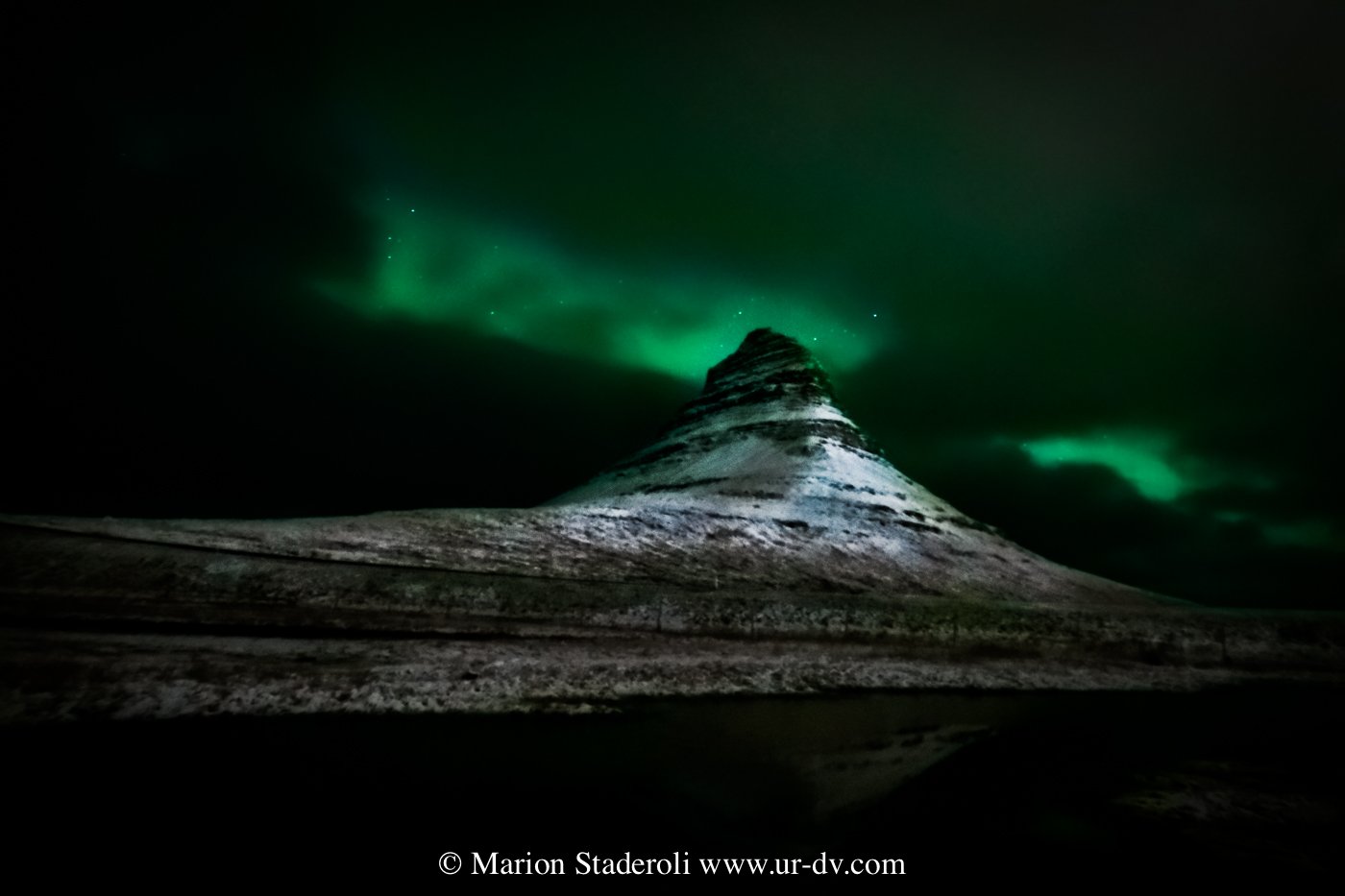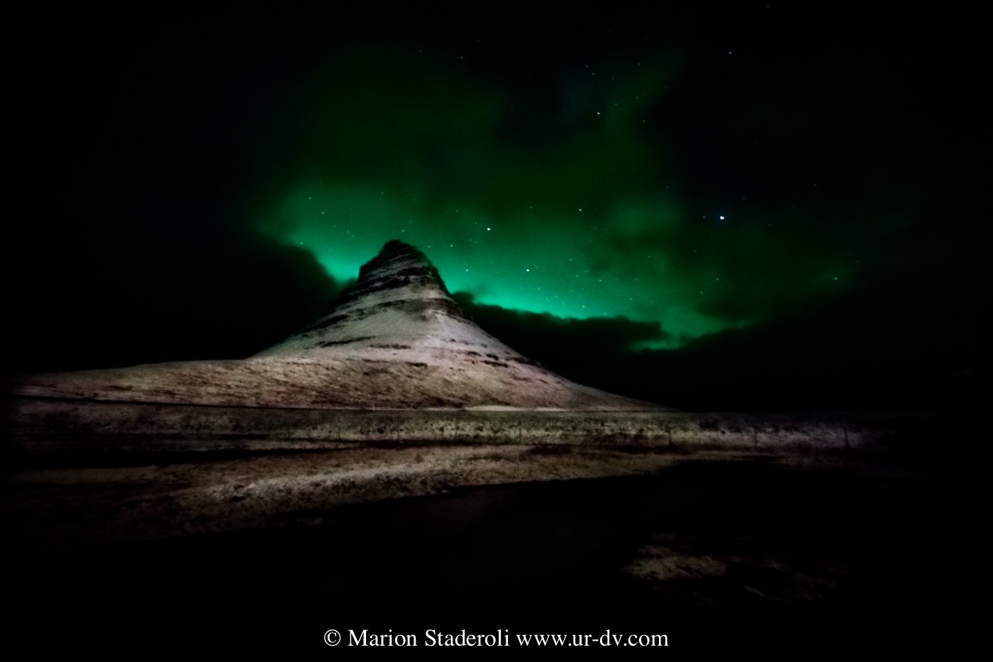 Lorsque nous sommes arrivés, nous avons vaguement repéré une sorte de trainée claire dans le ciel, mais sans croire que cela pouvait être une aurore. Pendant que je me couvrais Antony est sorti voir et m’a annoncé que c’en était bien une! Vite vite! Le vent aidant, les nuages ont vagabondé et par moment l’aurore apparaissait! Je dois dire que c’est bien plus coloré sur les photos qu’en vrai (la pose longue intensifie toujours les couleurs) c ‘était plutôt vert pâle, mais nous étions ravis de pouvoir assister au spectacle!😍 Et en plus devant cette fameuse montagne, je n’avais pas osé l’espérer! Mes photos ne sont pas terribles car je n’étais pas stable du tout avec les rafales de vent… Je regrette un peu de ne pas être montée jusque derrière les cascades, mais bon, c’est déjà bien!