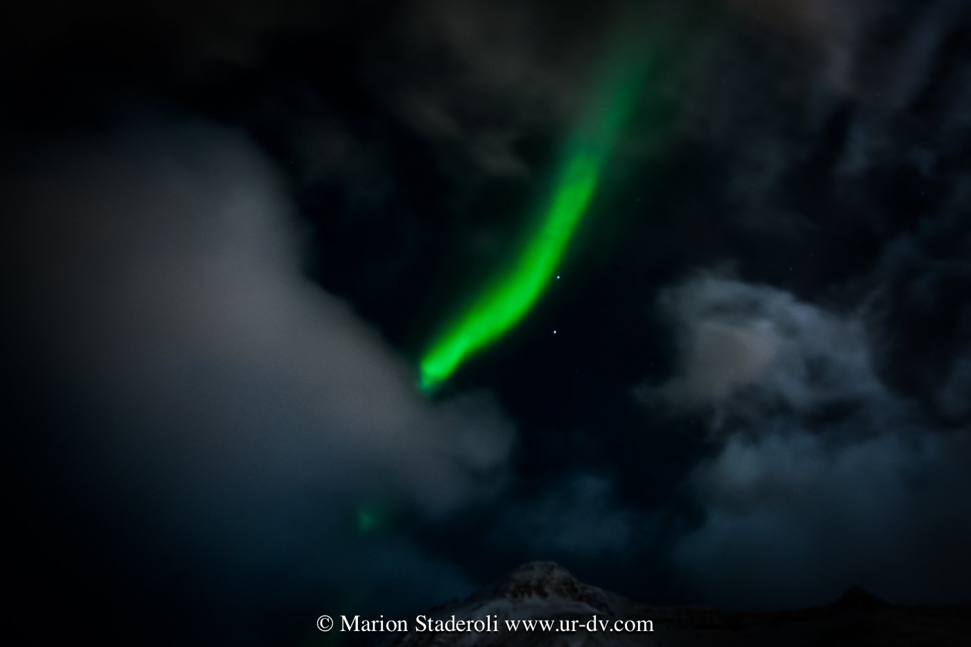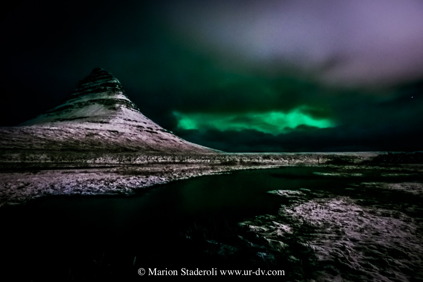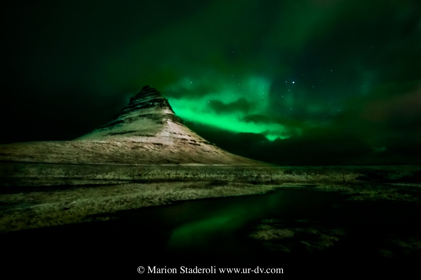 Lorsque nous sommes arrivés, nous avons vaguement repéré une sorte de trainée claire dans le ciel, mais sans croire que cela pouvait être une aurore. Pendant que je me couvrais Antony est sorti voir et m’a annoncé que c’en était bien une! Vite vite! Le vent aidant, les nuages ont vagabondé et par moment l’aurore apparaissait! Je dois dire que c’est bien plus coloré sur les photos qu’en vrai (la pose longue intensifie toujours les couleurs) c ‘était plutôt vert pâle, mais nous étions ravis de pouvoir assister au spectacle!😍 Et en plus devant cette fameuse montagne, je n’avais pas osé l’espérer! Mes photos ne sont pas terribles car je n’étais pas stable du tout avec les rafales de vent… Je regrette un peu de ne pas être montée jusque derrière les cascades, mais bon, c’est déjà bien!
