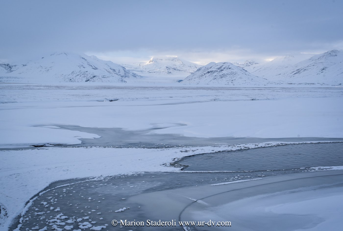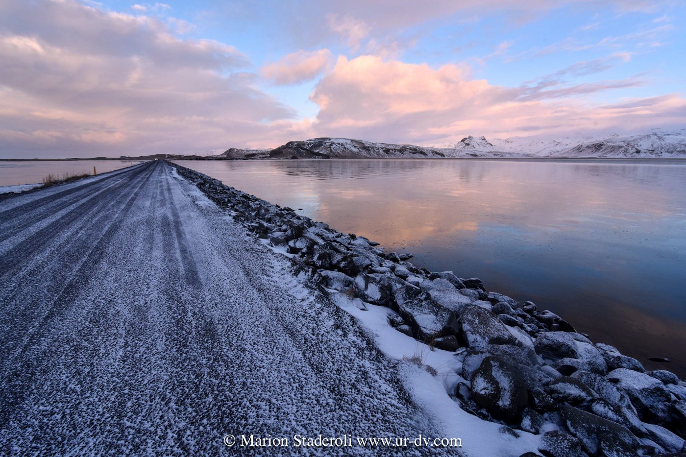 En route… Toute la journée la météo a joué avec nous: averses de neige et coin de ciel bleu (et rose!)… Toujours du blanc évidement, des cours d’eau partout, et on trouve toujours ça aussi magique! S’il n’y avait pas la route asphaltée on se penserait sur une autre planète!