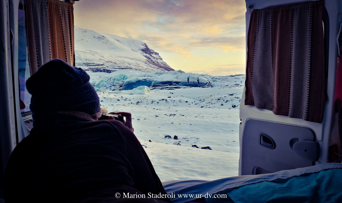Heureusement j’ai tout de suite pensé au van ! Sauf qu’on ne trouve que très peu d’informations sur le sujet… En réalité je n’ai trouvé au départ qu’un seul blog qui m’a prouvé que c’était possible en cette saison froide, puis un second, c’est tout. J’ai lu également plusieurs récits de personnes ayant voyagé en Islande en voiture allant d’hôtel en hôtel, et j’ai pu réaliser que cela pouvait être périlleux en cas de mauvais temps ! Rester coincée dans une voiture par tempête, franchement je n’avais pas envie de tenter ! Du coup, le van m’a réellement semblé être LA solution idéale et sécuritaire! En cas de problème, on arrête et on attend que ça passe ! On a du chauffage, à manger, on peut dormir tranquille et on n’est pas attendu quelque part, ce qui permet de modifier l’itinéraire au jour le jour. Et puis…. comme toujours, ce qui nous attire le plus c’est la sensation de liberté totale, d’autonomie et d’aventure ! Un voyage pépère et confortable? Non mais vous rigolez?!