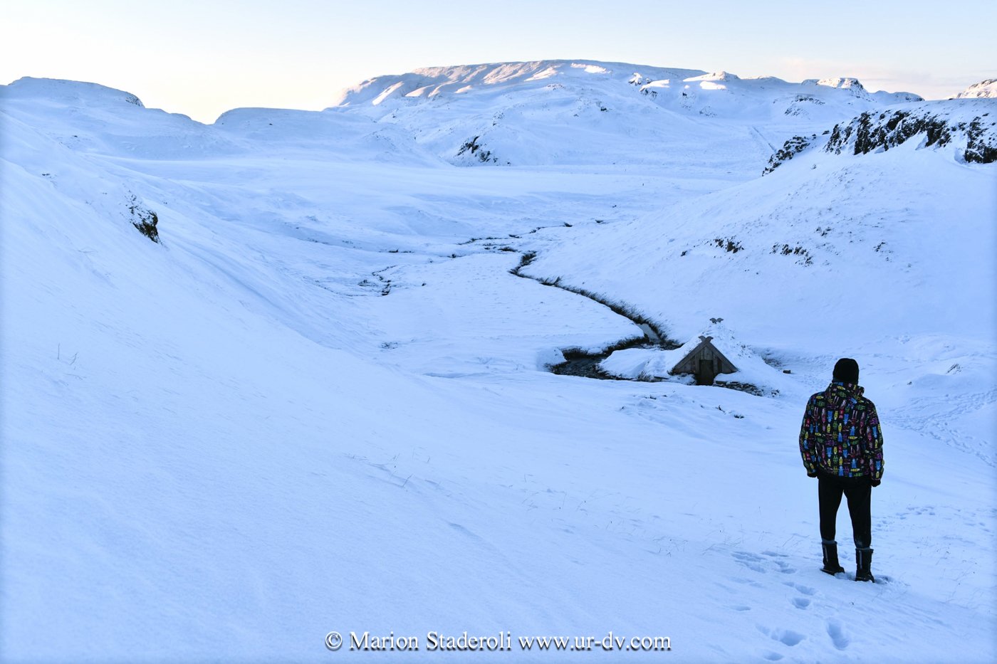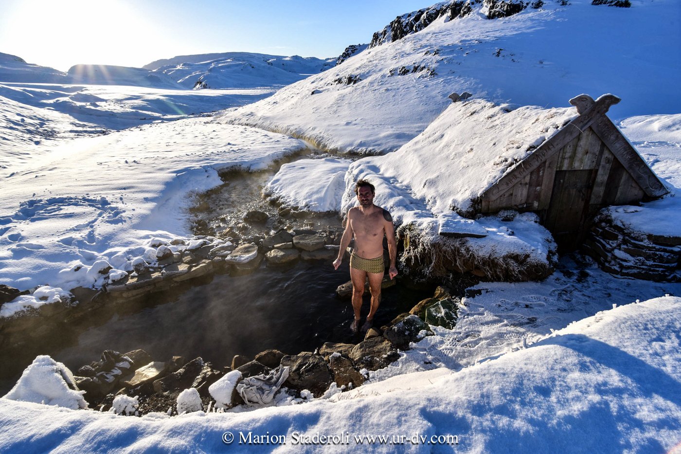 Fin d’après midi dans une superbe source chaude 😍Hrunalaug. Magnifique, perdue dans les collines enneigées. Une petites route bien blanche sur quelques kilomètres, puis à pieds on monte et on descend sur 200m environ et on découvre une cabane (pour se changer) et un bassin naturel… un délice… Sauf que nous n’avons pas été longtemps seuls et ça a vite été le défilé! C’est l’effet soleil, ça, par mauvais temps au moins il n’y avait que nous pour avoir l’idée de se baigner 🤣 Enfin, nous avons bien profité, nous avons fait trempette 2H devant le soleil déclinant…
