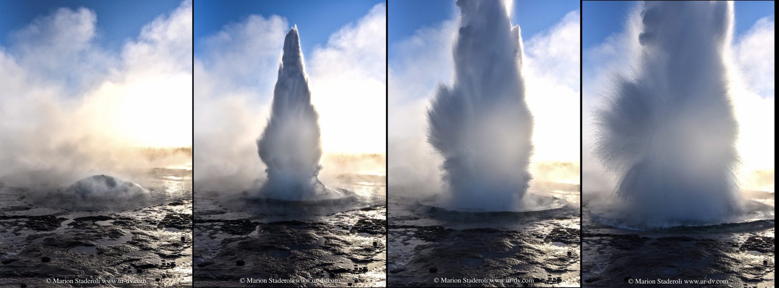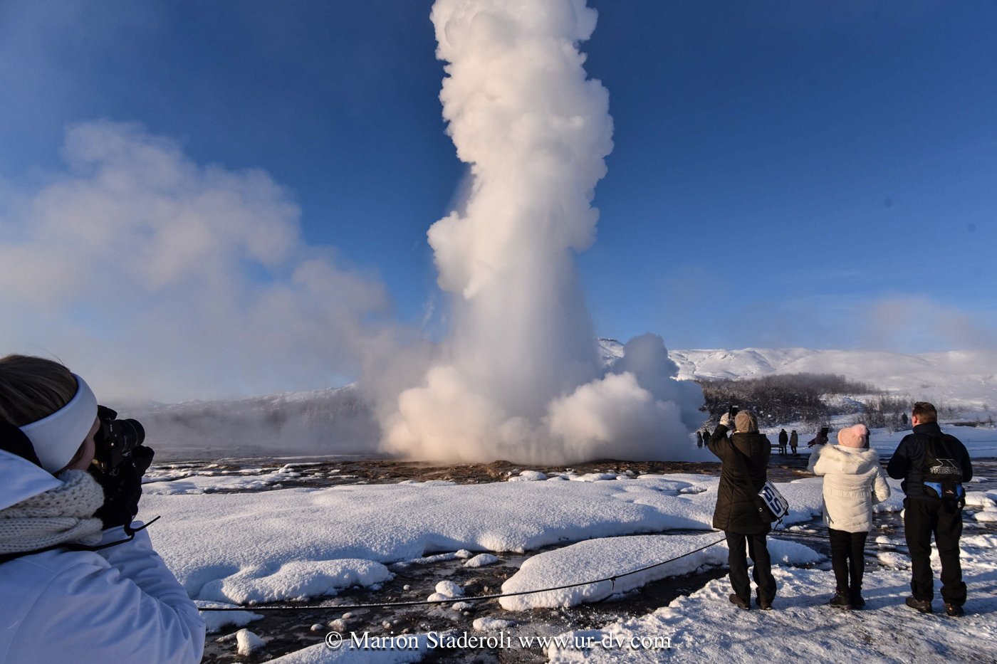 Ouf on est enfin posés! Fin de journée difficile, il fait -10°, on ne sait pas si le chauffage va marcher (hier soir il a encore lâché), internet ne fonctionnait plus et on ne trouvait plus de station essence pour aller faire pipi ahah … Bref, je vous raconte notre journée sous un grand soleil donc; nous sommes maintenant en plein dans la zone la plus touristique, le « cercle d’or », il y a des merveilles de la nature a découvrir, alors même si on aime pas trop les ambiances bus-magasinsdesouvenirs-queuelele, on est allés y faire un tour. Pour commencer la chute d’eau Gulfoss, très impressionnante, et puis la zone de « Geysir » où on peut voir des explosions de geysers. Très impressionnant aussi, tout à coup une bulle énorme sort de terre et explose en l’air en jet de vapeur! Je ne pouvais pas m’empêcher de sursauter! J’ai renoncé à prendre en photo la bulle correctement (la photo typique du lieu) car il y avait vraiment trop de vapeur, je pense qu’en général ces photos sont prises en été…
