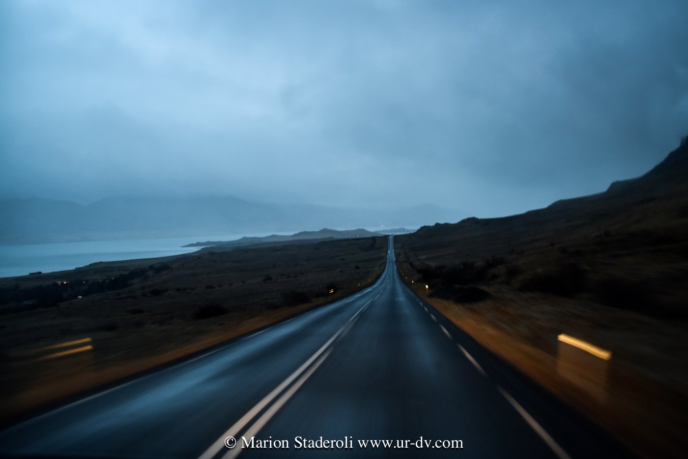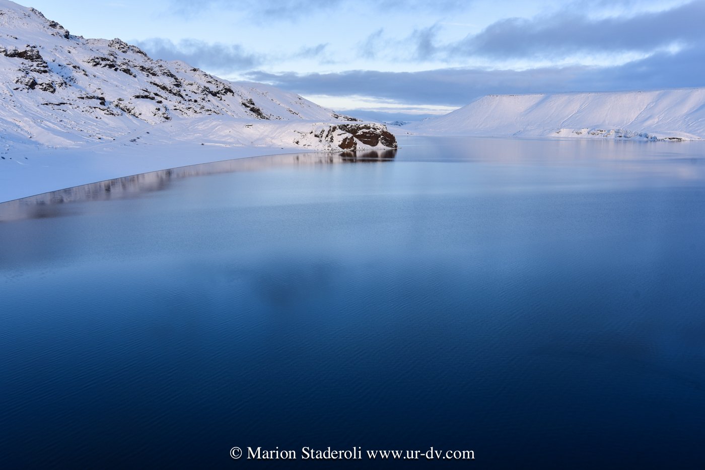 Pour finir, passage par le lac de la péninsule Reykjane. Magnifique vue en dégradé de bleu et ambiance feutrée et embuée sur la route (vapeur due à l’activité souterraine!)