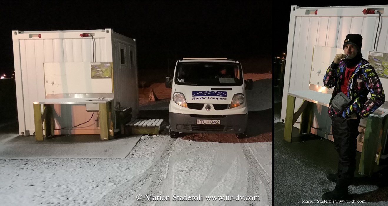 En Islande le camping sauvage est interdit, et c’est une règle rigoureusement imposée. Nous étions donc censés aller dans des « campsites ». Il y en a énormément dans toute l’île, pour des prix allants de 10 à 20€ par personnes (oui ! Pas donné le camping!). Sauf qu’en hivers la plupart sont fermés. Et quand ils sont ouverts, vu le peu de fréquentation, il est rare que le chemin pour y aller soit déneigé… On m’avait donc dit que dans ce cas, le bivouac sauvage était toléré s’il restait très discret. Vraiment, j’ai eu beaucoup de mal au début. Je suis quelqu’un qui respecte les lois et devoir me comporter comme une vagabonde m’a stressée. Certes, cela nous a permis une économie considérable, mais il fallait chaque soir chercher où dormir, et cela prenait parfois pas mal de temps ! Nous avons tenté au départ de nous diriger vers des camps ouverts, mais quand nous avons vu que c’était souvent sans succès nous avons abandonné (surtout hors de la partie sud). Nous tenions à tout prix à nous « cacher » au maximum, car nous n’avions pas envie que quelqu’un vienne nous déloger, ni de passer pour des gens irrespectueux auprès des locaux. En hivers, à part le bruit du chauffage, c’est dur de faire la différence entre une simple voiture garée et une voiture van avec des gens dedans, toutefois, le plus important est de n’importuner personne et surtout de laisser la place intacte. Nous avons ainsi souvent dormi devant des campings fermés, au moins personne ne pourrait dire que nous n’avions pas essayé (et parfois nous avions accès à un évier pour un brossage de dents en plein air !)