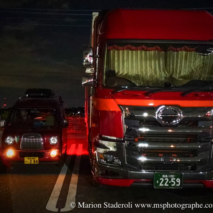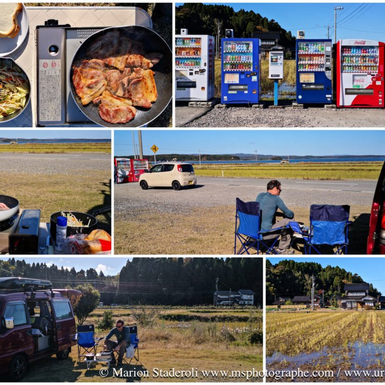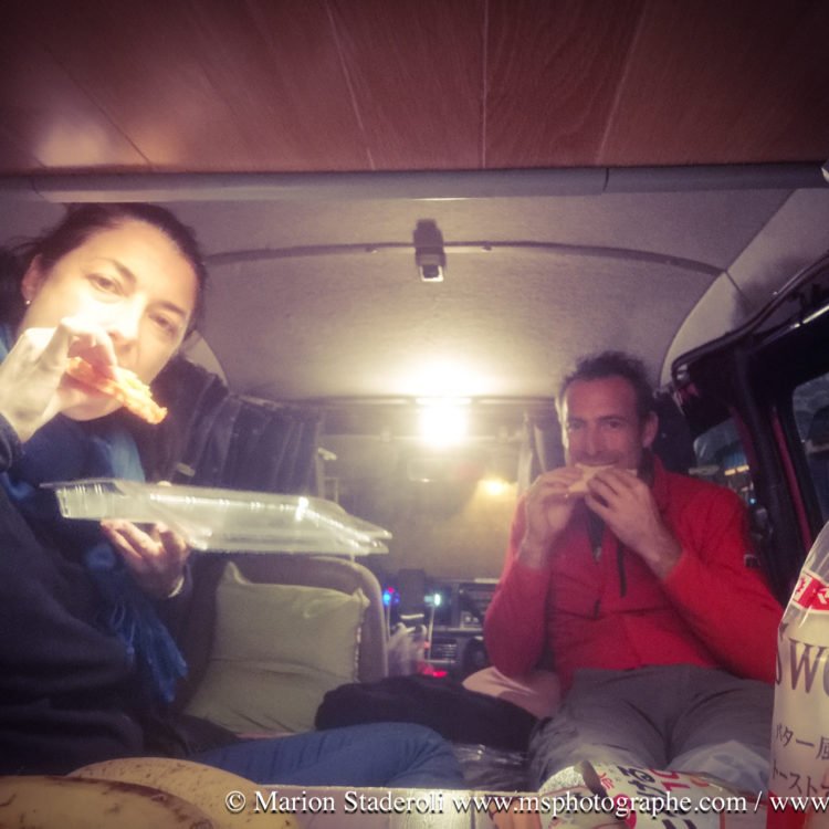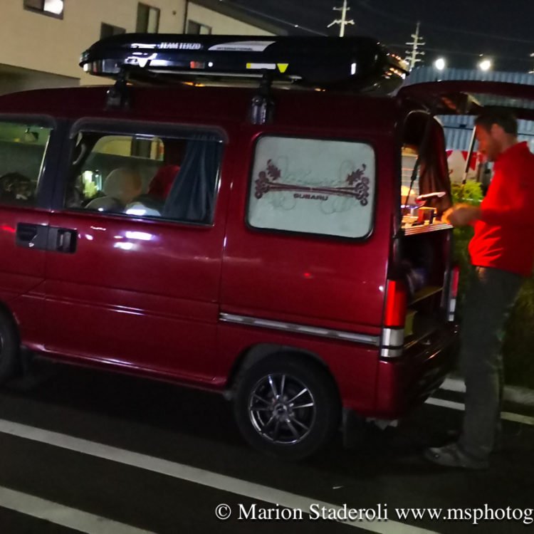 -Donc en van, la seule solution pour dormir sans payer un stationnement, c'est en dehors des villes, soit sur des aires de repos (que l'on trouve facilement sur Map en notant "Michi no eki" et mieux vaut s'assurer que les toilettes restent bien ouvertes 24/24 pour le pipi du soir et du matin, (parfois ça ferme tôt et ouvre tard) ou bien sûr les parkings des Kombinis (chaînes comme 7eleven, Familly Mart et Lawson, et il y en a des tonnes partout), ouverts 24/24 en général, mais attention, bien regarder qu'il n'y ait pas un panneau d'interdiction de dormir! On peut trouver des campings, mais pas tellement et bien souvent c'est cher. Outre les routiers, sur ces parkings on a trouve beaucoup de Japonais qui après quelques courses, font une pause, mangent, regardent un film ou dorment dans leur voiture, ce sont finalement des lieux typiques de la vie japonaise (et ça on ne nous le montre pas! ) !