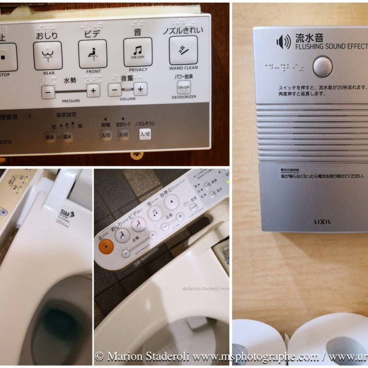 -En parlant des aires, il faut parler des toilettes. Les toilettes japonnais ne faillissent pas à leur réputation, il y toutes sortes de fonctions dont celle, très importante quand on ne peut pas se doucher de plusieurs jours, de pouvoir se laver le popotin. Ha! Et il y a le siège chauffant (qu'on peut désinfecter), quel plaisir hihi! Dans 90% des cas nous avons trouvé des lieux très propres. Tout est écrit en Japonais, mais il y a des icônes assez claires.
