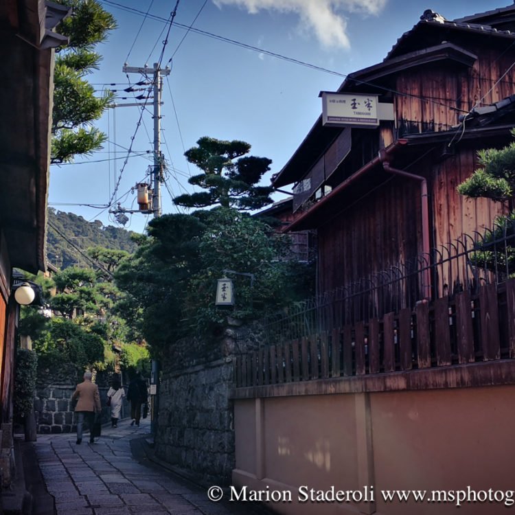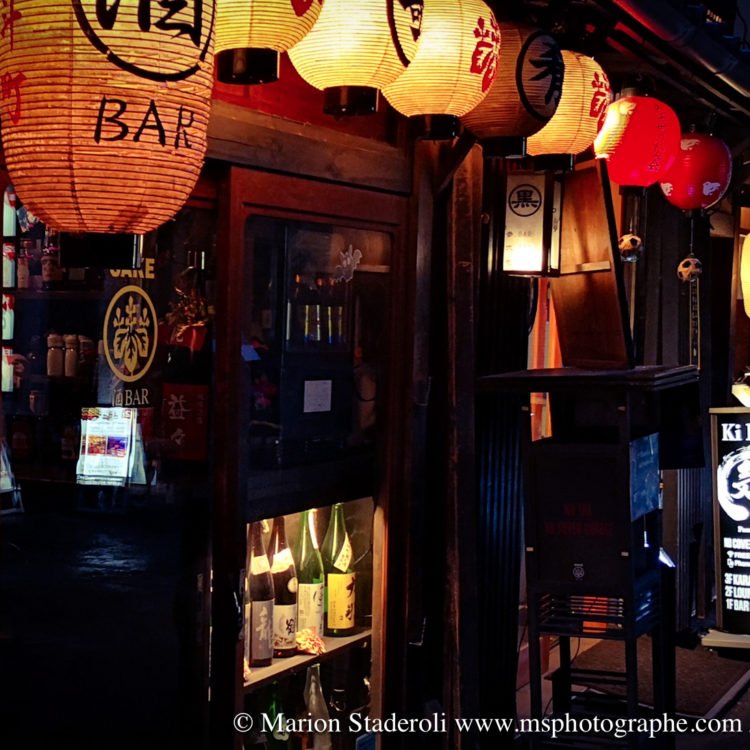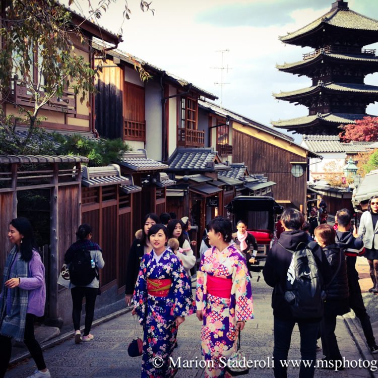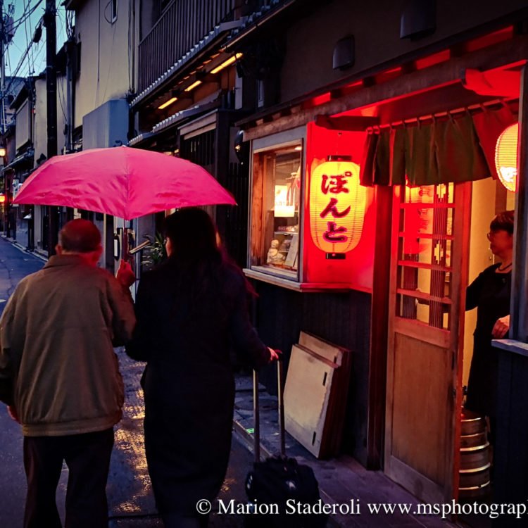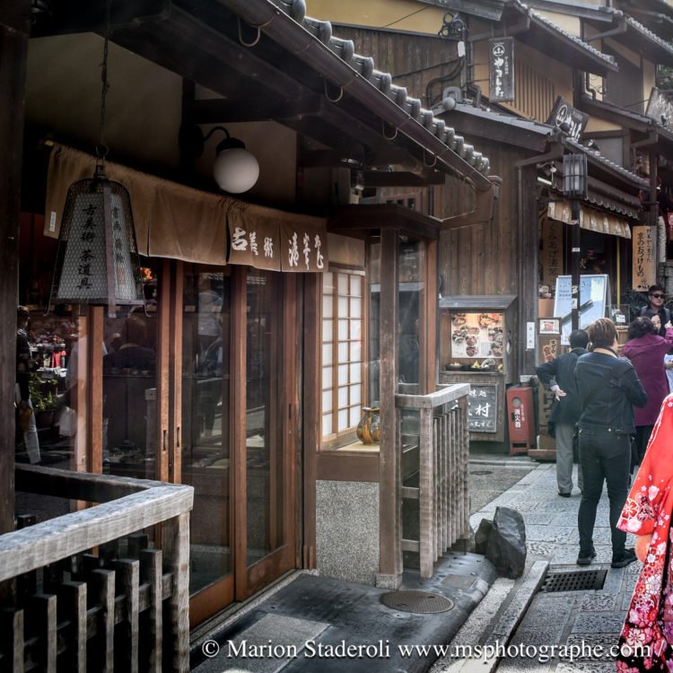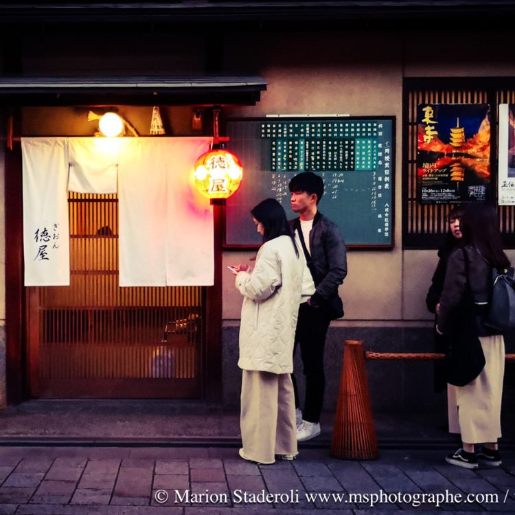 l'atmosphère des ruelles anciennes à la tombée du jour avec les lanternes dans les quartiers touristiques, leurs maisons en bois, la présence invisible des Geishas...