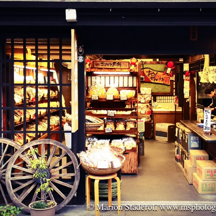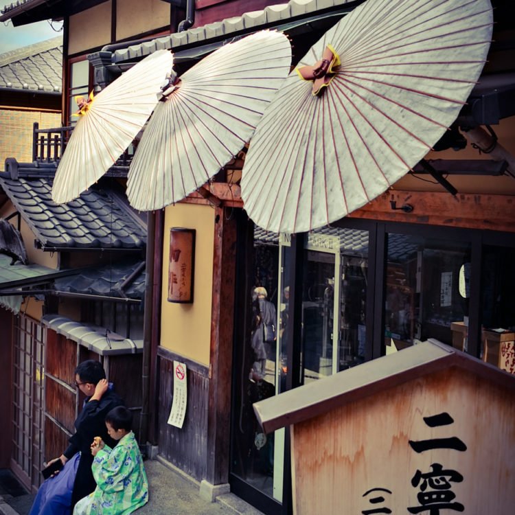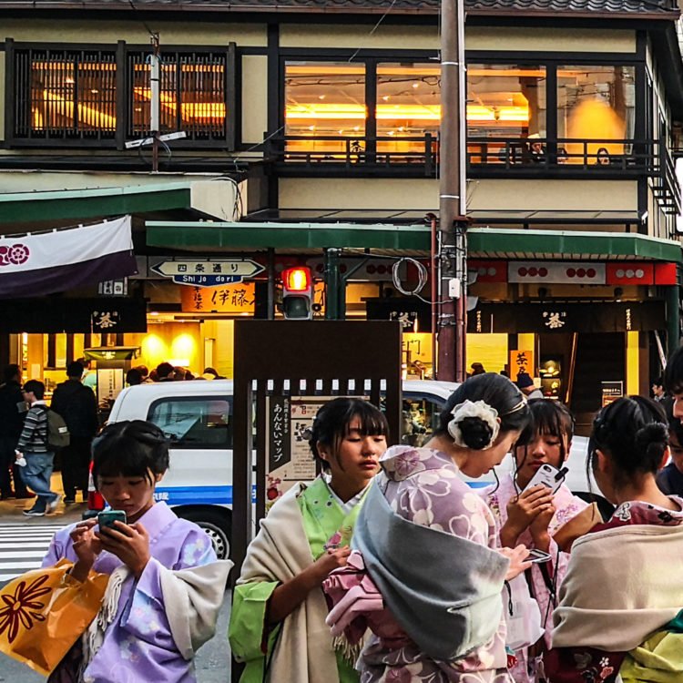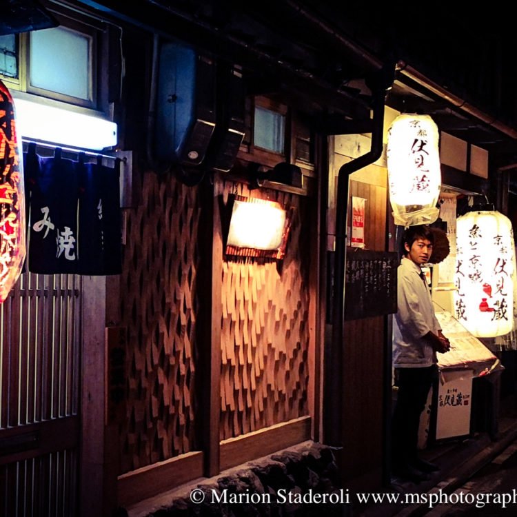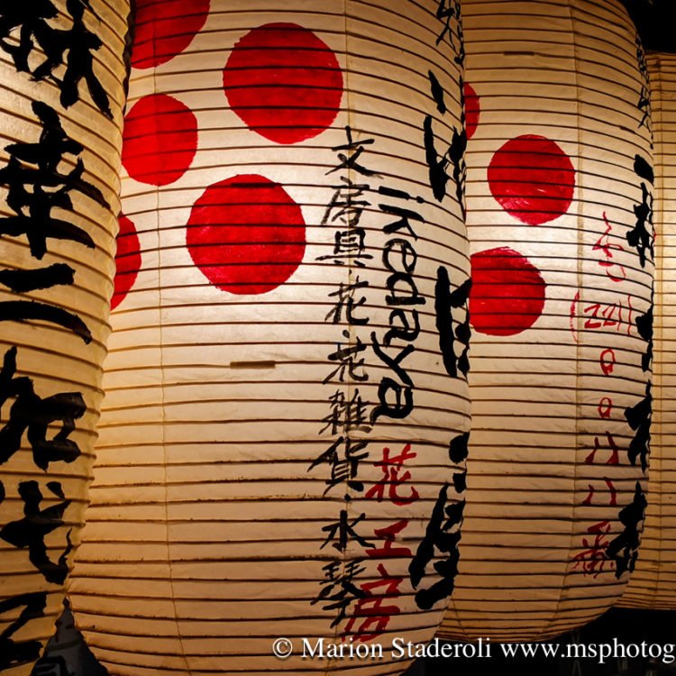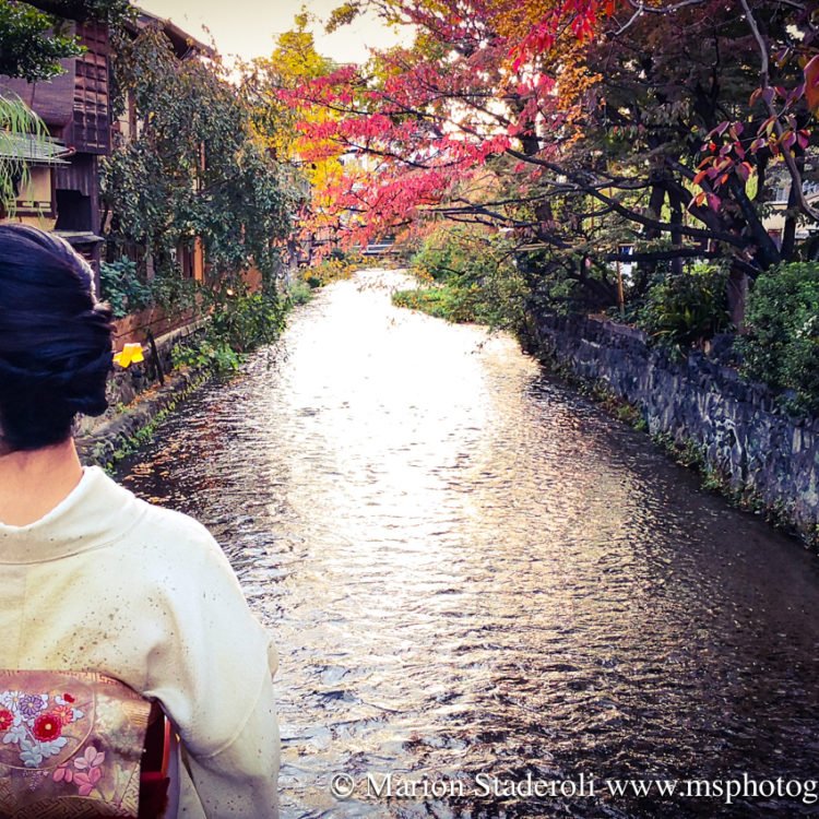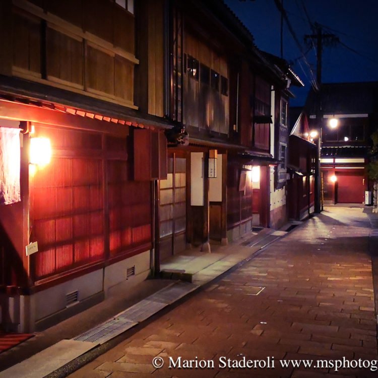 l'atmosphère des ruelles anciennes à la tombée du jour avec les lanternes dans les quartiers touristiques, leurs maisons en bois, la présence invisible des Geishas...