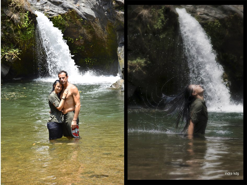 Ensuite nous sommes partis voir où en était la fiesta. Toujours au même point ! Même rythmes réguliers, avec certes moins de monde, mais en gros ça n’avait pas beaucoup bougé sauf qu’il y avait beaucoup plus de personnes allongées au sol. Nous avons donc continué à travers le village jusqu’à la cascade. L’eau bien fraîche est un délice…. Pour ma part étant donné que je me baigne habillée (même si ici la plupart ne sont pas musulmans, les photographes et d’autres visiteurs le sont, donc inutile de choquer), c’est parfait car ensuite je reste bien au frais encore un moment (mais ça sèche très vite!).