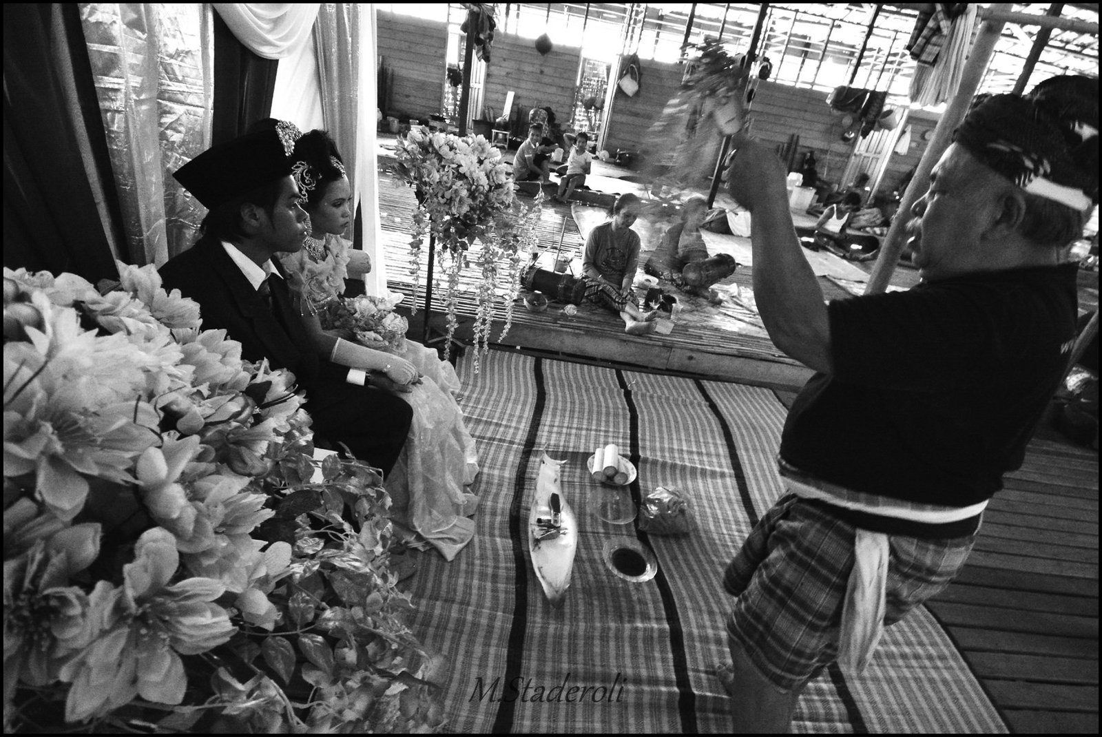 Nous sommes restés sur place une bonne heure. Les mariés étaient assis sur un banc avec des décorations autour et l’homme le plus important du village (plus qu’un chef c’est celui qui représente la culture Dayak) récitait des prières avec tout un cérémonial et des offrandes. Tous les gens autour « font leur vie », certains dorment, regardent la télé etc, c’est drôle !