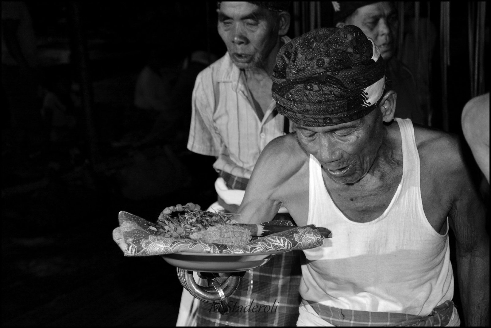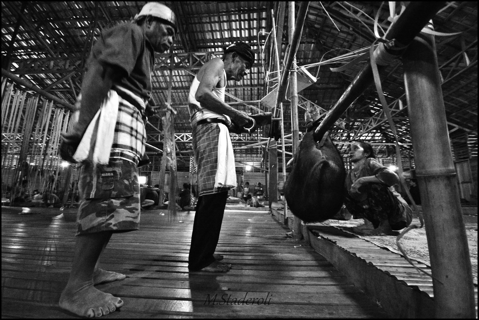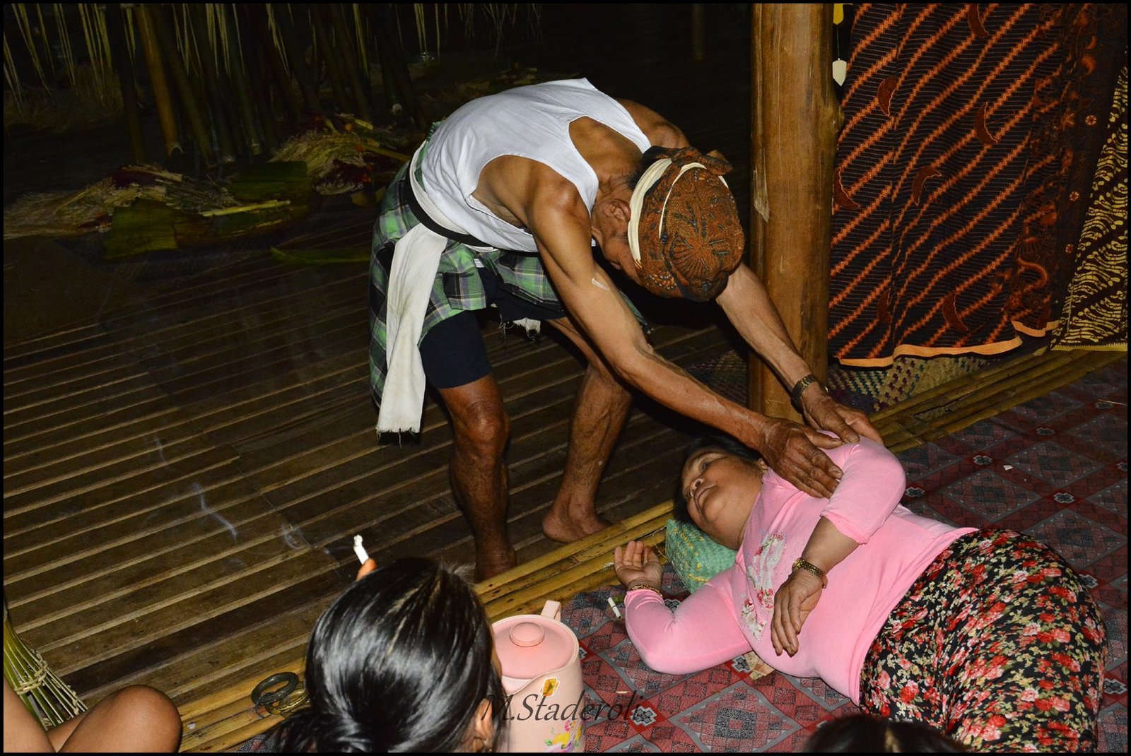 Ensuite les hommes se sont assis au même endroit, ont fait ce qui ressemblait à des prières et se sont posé une sorte de pommade sur certains endroits du corps. Puis ré-offrandes. Au départ j’étais un peu gênée ne sachant pas si j’allais pouvoir photographier, me lever, m’approcher etc J’ai vite vu qu’il n’y avait aucune règle ni aucun tabou ! Tout le monde faisait sa vie, passait au milieu, des dizaines de photographes allaient se coller le nez contre les personnes effectuant la cérémonie (c’est même trop à mon sens). Je n’ai pas fait beaucoup de (bonnes) photos. D’une part c’était très sombre et puis il y avait tellement d’autres photographes que c’était galère pour se faire une place, je n’avais pas envie de jouer des coudes… Il y avait également une caméra qui filmait pour une chaine TV de Banjarmasin, et figurez vous que j’ai été interviewée ! Ahahaha ! Déjà en français j’aurais pas été à l’aise alors là en anglais ! Ca va que le gars m’a attrapée au vol et que je n’ai pas eu le temps de réfléchir.