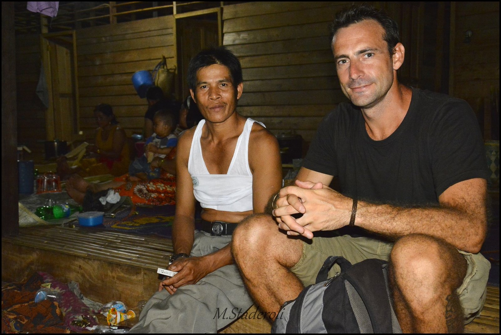 Nous avons réussi à nous faire comprendre pour demander à l’homme ce qui allait se passer et quand allaient être tués les cochons (nous avons appris alors que ça n’a plus rien à voir avec le mariage qui est fini). Il nous a répondu « pas avant minuit », puis il nous a laissé car il avait à faire ! Mince !! Nous nous sommes retrouvés assis par terre sur le sol en bambous comme deux andouilles. Ah ! J’y pense, un truc marrant en rapport avec le sol: il y a des têtes de clous qui dépassent pas endroit et hier soir j’ai déchiré mon pantalon !! Bravo ! Heureusement que j’avais un sarong dans le sac !