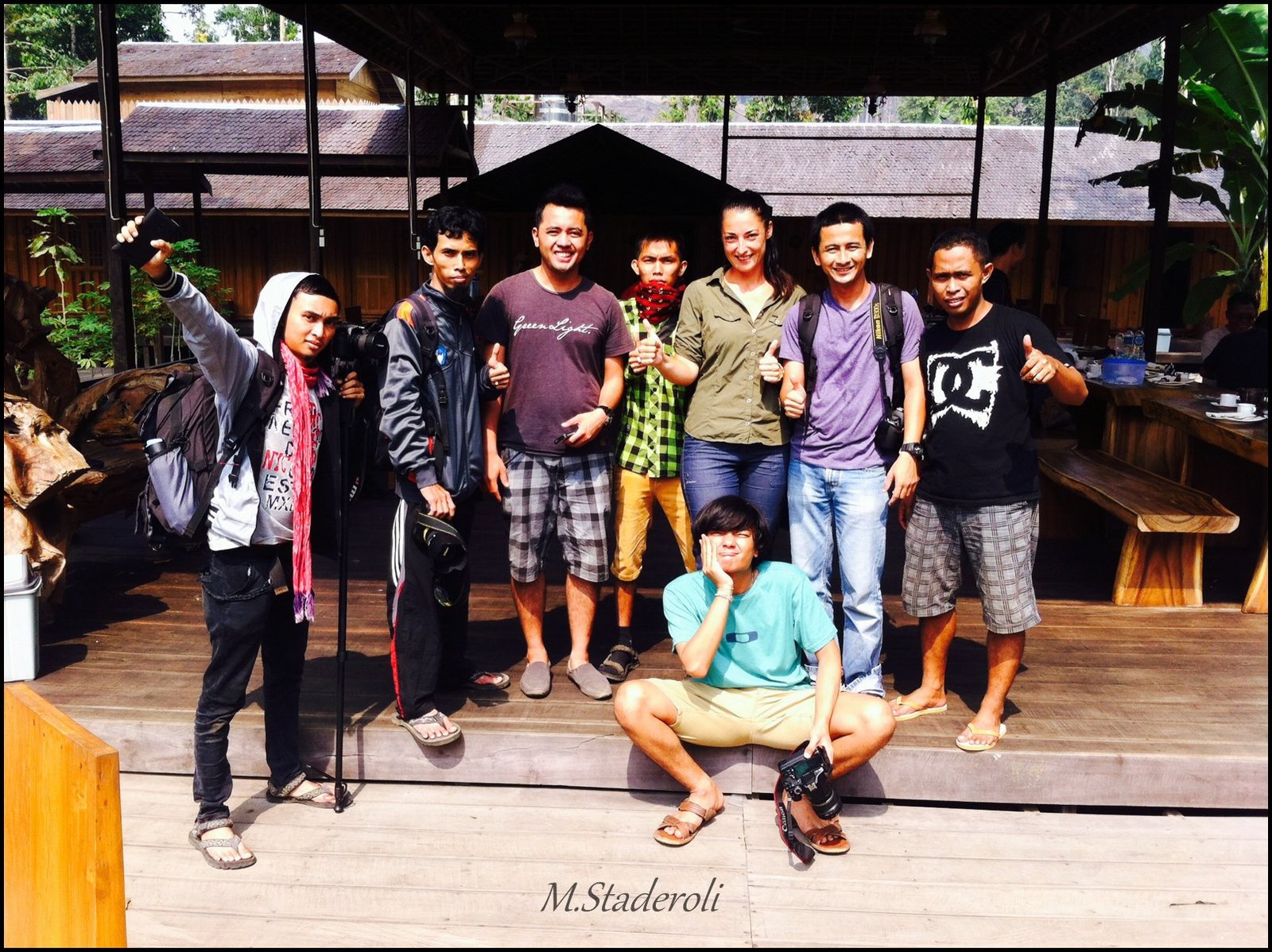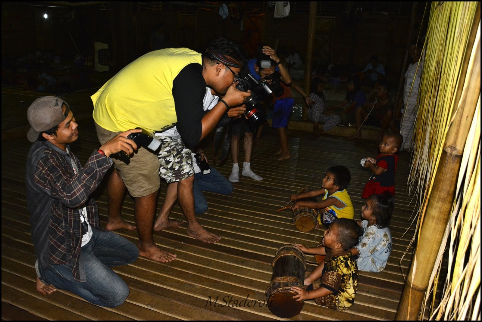 Nous nous retrouvons donc devant un dilemme… Attendre plus de cinq heures ici ? Rentrer ? Nous ne voulions pas rater ça… Nous avons un peu attendu, puis un groupe de personnes est entré et nous avons reconnu avec eux Shan, le gars si avenant (un passionné de photos de Banjarmasin) qui le matin nous avait dit de revenir le soir à 19H. Il nous a vus aussi et peu après il est venu nous chercher pour que nous nous asseyions avec eux. Ils nous présente ses amis qui ne sont autres, au hasard, que des photographes ! Un photographe pro, un photographe journaliste et des amateurs passionnés. Le photographe de presse parle bien anglais, il vit près de Banjarmasin. Très vite les adresses de site et facebook s’échangent, voilà, j’ai encore de nouveaux amis 😉 Tout ceci nous a permis de nous occuper. Nous avons discuté, puis avons fait quelques photos d’enfants (pour eux qui parlent leur langue c’est simple, ils leur demandent de faire ceci ou cela et ils photographient!).