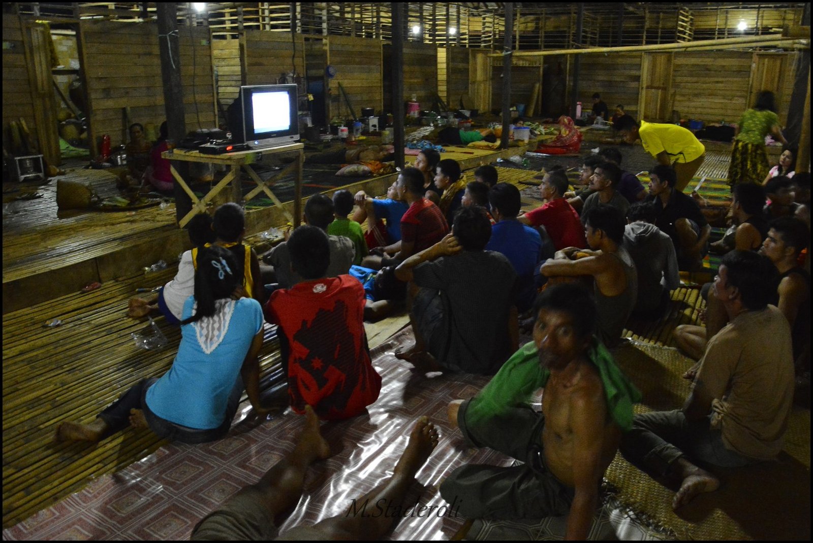 Hier soir nous sommes retournés dans la « long house » un peu avant 19H. Depuis le chemin nous entendions toujours les fameux battements de tambours. Lorsque nous sommes entrés nous avons remarqué qu’il y avait bien moins de monde, certains dormaient, d’autres regardaient la télé ou discutaient. En nous déplaçant dans la maison nous sommes tombés sur des cochons, au sol, ficelés au pattes sur des bambous . Il y en avait cinq tout autour de l’espace central. Cool les cochons sont là ! Puis nous avons vu qu’il y avait deux hommes debout en train de faire des « incantations » et de danser et des personnes en face d’eux assises au sol. Il y avait également une grande bougie qu’il soulevaient parfois. Au bout d’un moment un des hommes posait ses mains sur une femme allongée au sol, je pense que c’est une séance « curative ». Nous sommes restés un moment à les regarder. C’était intense, un des hommes pleurait presque parfois. Ils disait plein de choses aux femmes par terre, qui leur répondaient toujours avec ces sortes de prières ou d’incantations (vraiment dommage qu’on ne comprenne rien à tout ça). Ca a duré un petit moment puis ça s’est arrêté.